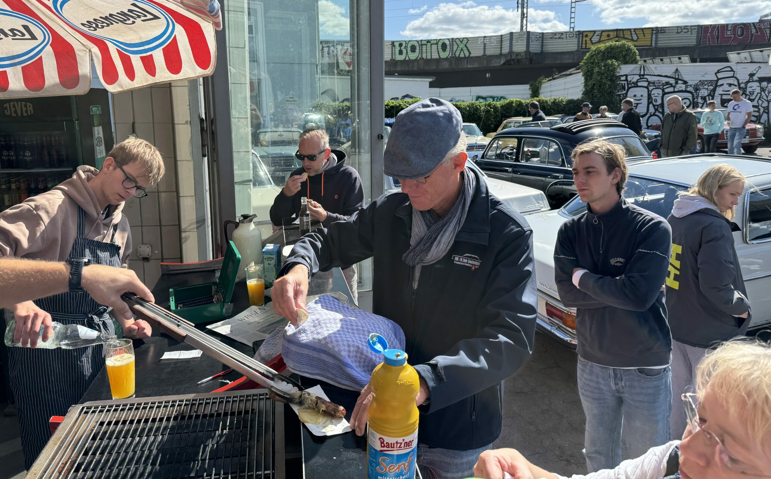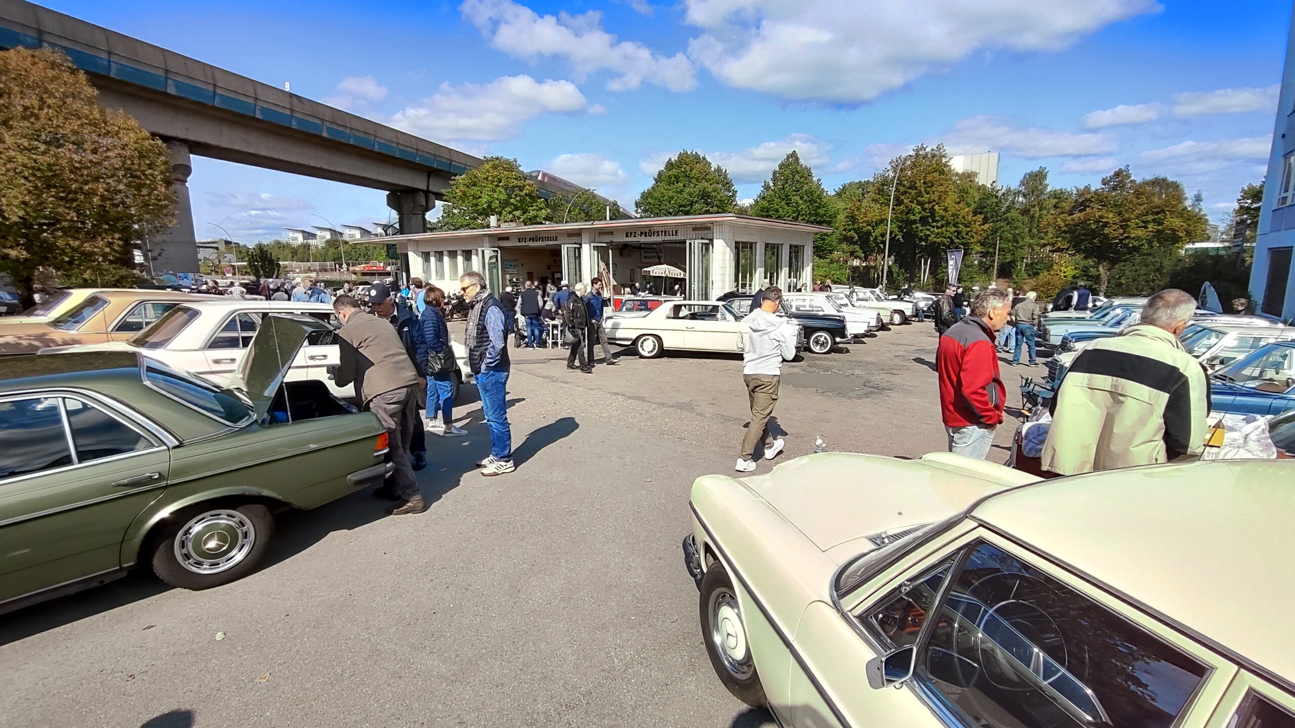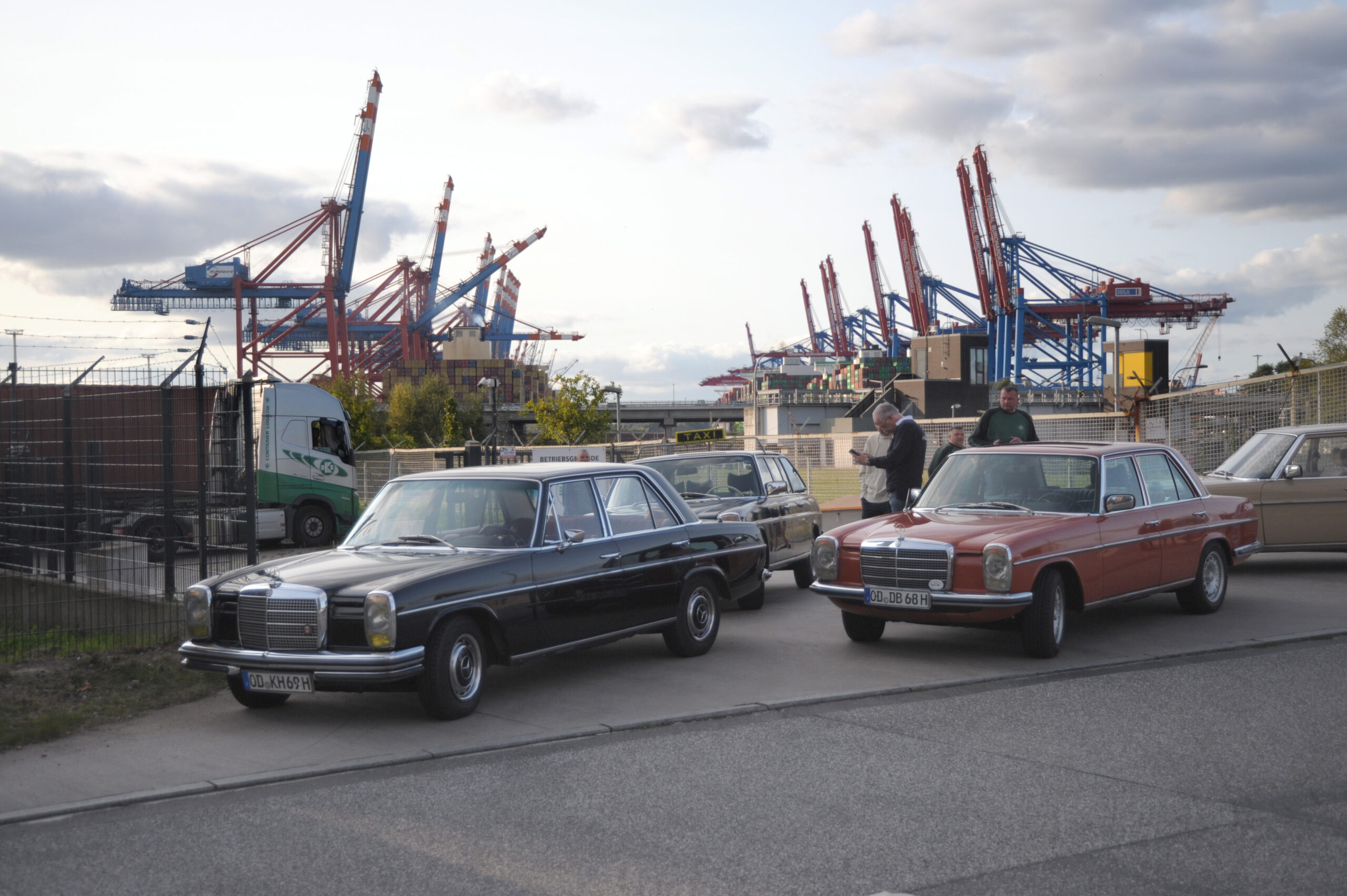 Aus dieser ersten Runde hat sich dann in den vergangenen Jahren ein fester und attraktiver Anlaufpunkt für alle Mercedes-Benz Strichachter am 2. Samstag im September entwickelt. So fand nun am vergangenen Samstag, dem 14. September 2024 bereits der zehnte Strichachttag statt, der wieder einmal gezählte 89 Fahrzeuge der Baureihe W114/W115 an die historische Tankstelle in Rothenburgsort brachte. Bei bestem Wetter und mit einer bunten Mischung aus Limousinen und Coupés wurde der Platz rund um dieses Baudenkmal schon ab 10 Uhr immer voller und brachte tagsüber wieder einmal ganz viele nette Menschen zusammen. Neben Getränken, Bratwurst vom Grill, leckeren Kuchenspezialitäten und intensiven Benzingesprächen, wurde dieser sonnige Tag mit einem Teilemarkt und einer abschließenden Ausfahrt in das Hamburger Hafengebiet ergänzt.