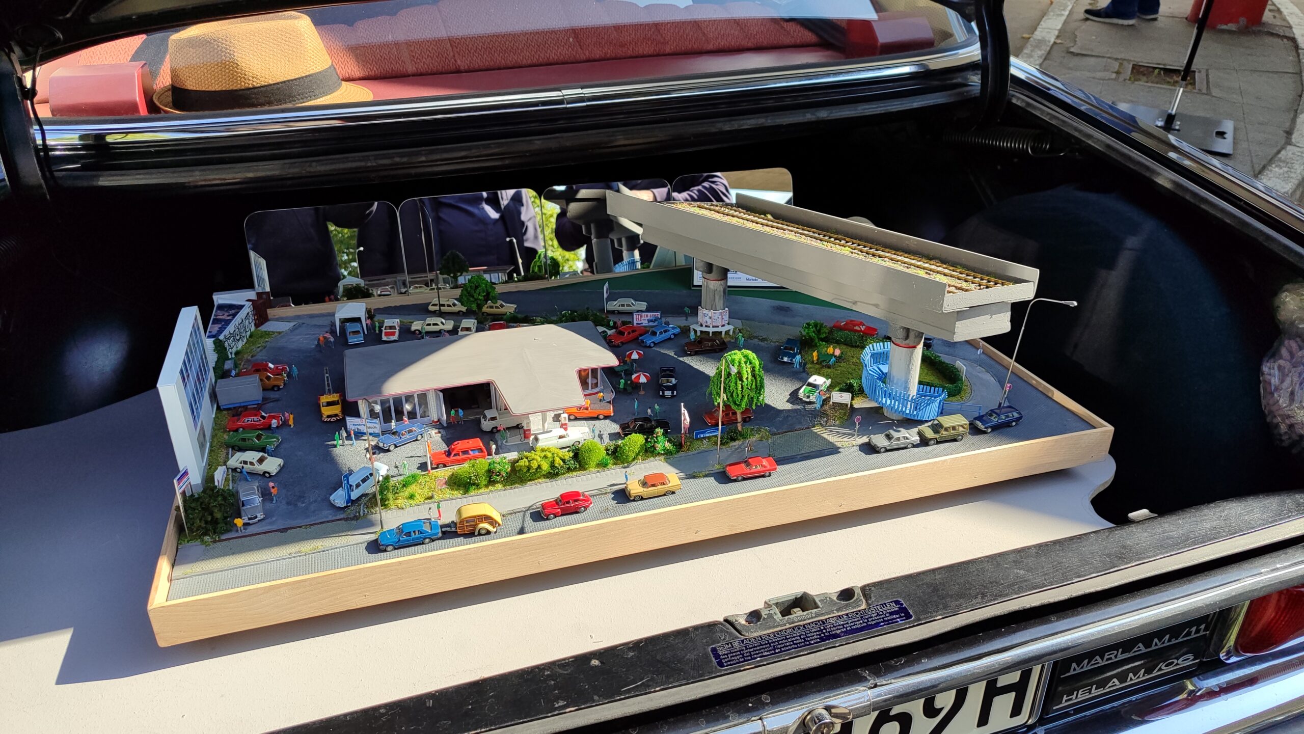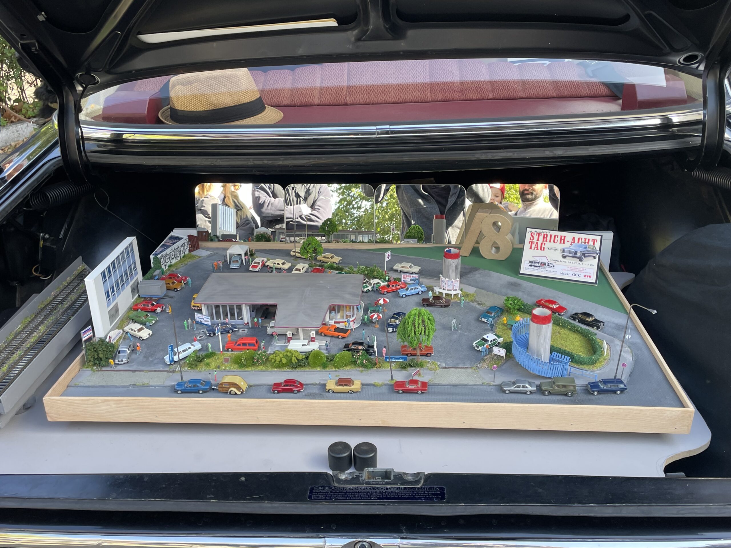 Ein Hamburger Strichachttag mit Oldtimer Tankstelle Brandshof im Kofferraum seines schwarzen 250/8 von 1969 ! In akribischer und stundenlanger Arbeit wurde im Maßstab 1:87 die gesamte Anlage detailliert nachgebaut, mit vielen Fahrzeugen und einem bunten Treiben auf dem Platz – alles im Kleinformat, wie man es auch aus dem Miniaturwunderland kennt. „So können wir als MB /8 Club Deutschland e.V. das besondere Flair und die schöne Atmosphäre der letzten 10 Jahre wunderbar konservieren und den Strichachttag im Kofferraum auch einfach mal mitnehmen“ sagte Holger C. Schwärzel, der federführend dieses Modell gebastelt hatte, dem staunenden Publikum an seiner Kofferraumkante.
