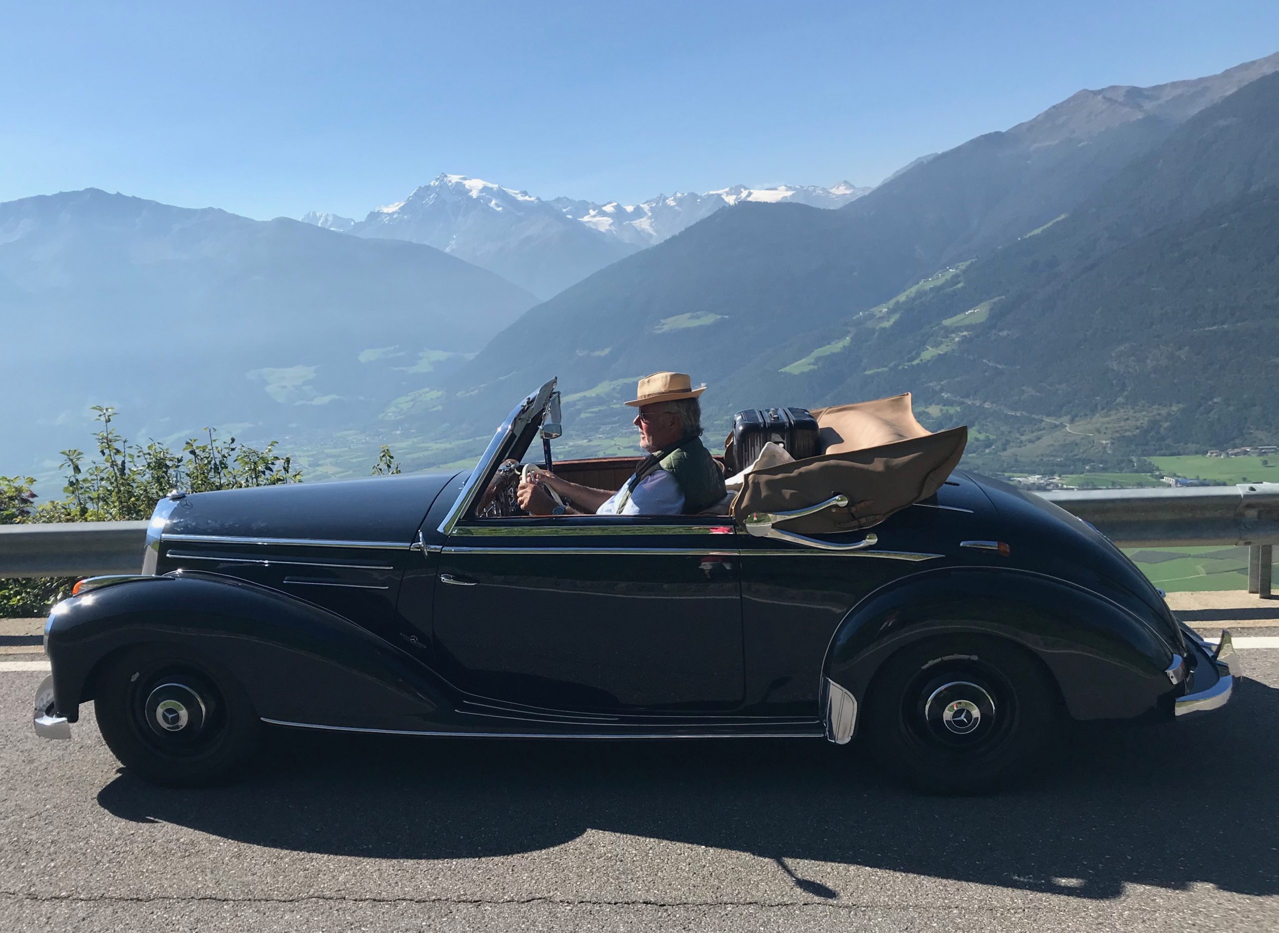 Ein Mercedes-Benz 220 Cabriolet A, Baujahr 1952 (W 187). Auf dem Rückweg von der Mille Migla 2019 haben wir es im Ofenwerk Nürnberg entdeckt, Carlo hat es dann im Frühjahr gekauft und über Landstraßen nach Münster gebracht. Der Vergaser machte Probleme, und nachdem eine Werkstatt im Münsterland das Auto eher „verschlimmbessert“ hat, gab er es in eine Werkstatt in Stade, die vor vielen Jahren den Motor seines MB 300 S Cabriolets perfekt hinbekomme hatte. Dort stellte man erst mal fest, dass ein Motor der späteren 220er Baureihe eingebaut war. Carlo ließ ihn gegen einen Original-Motor austauschen, und das Auto fuhr seitdem schon 5.000 km und einige Ausfahrten perfekt mit.