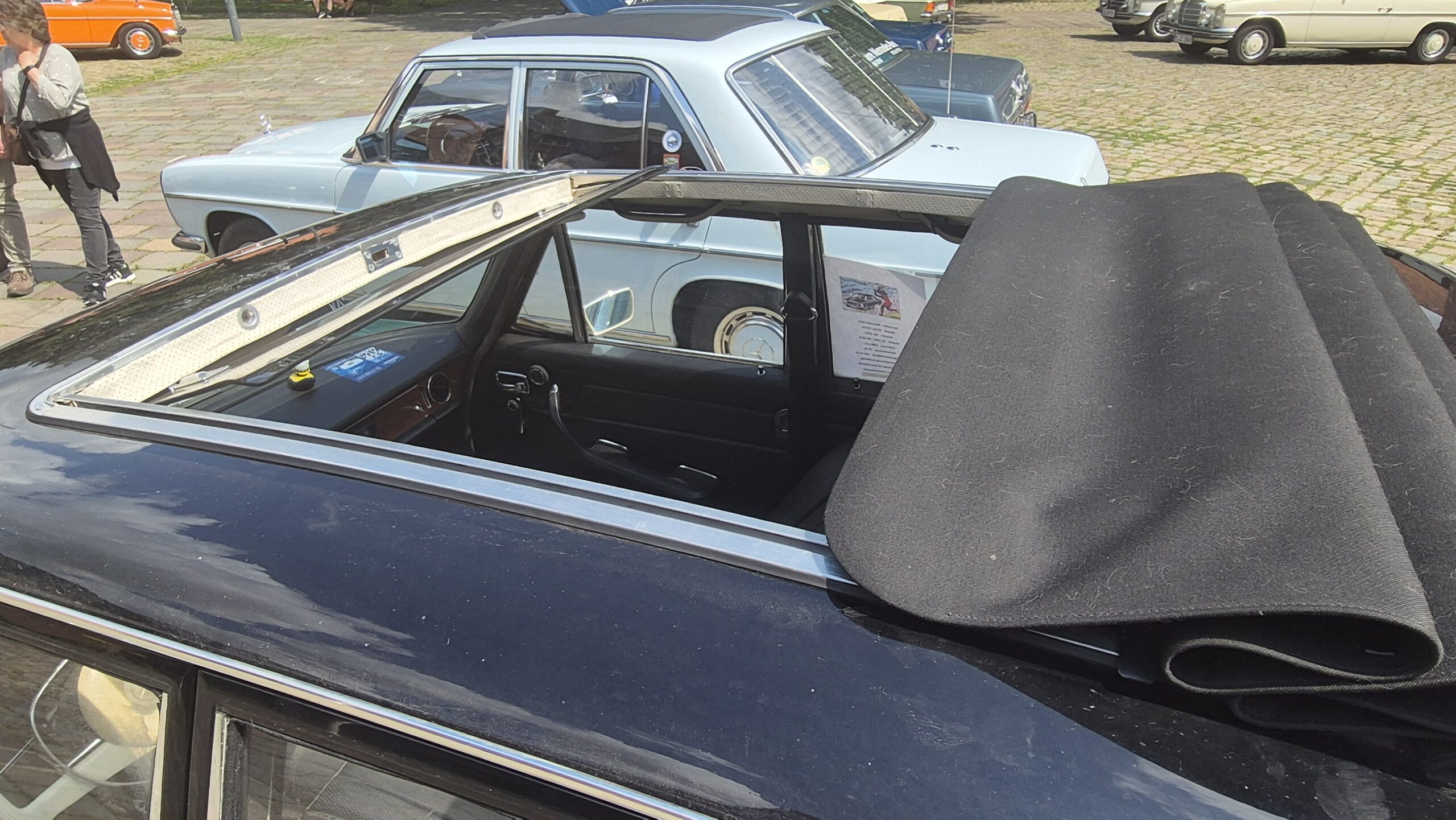Für mich war das folgende Fahrzeug ein weiteres Highlight. Mit einem historischen Faltschiebedach (evtl. aus einem Ponton), Windabweiser und durchgehender Sitzbank kamen hier gleich einige seltene Ausstattungen zusammen: