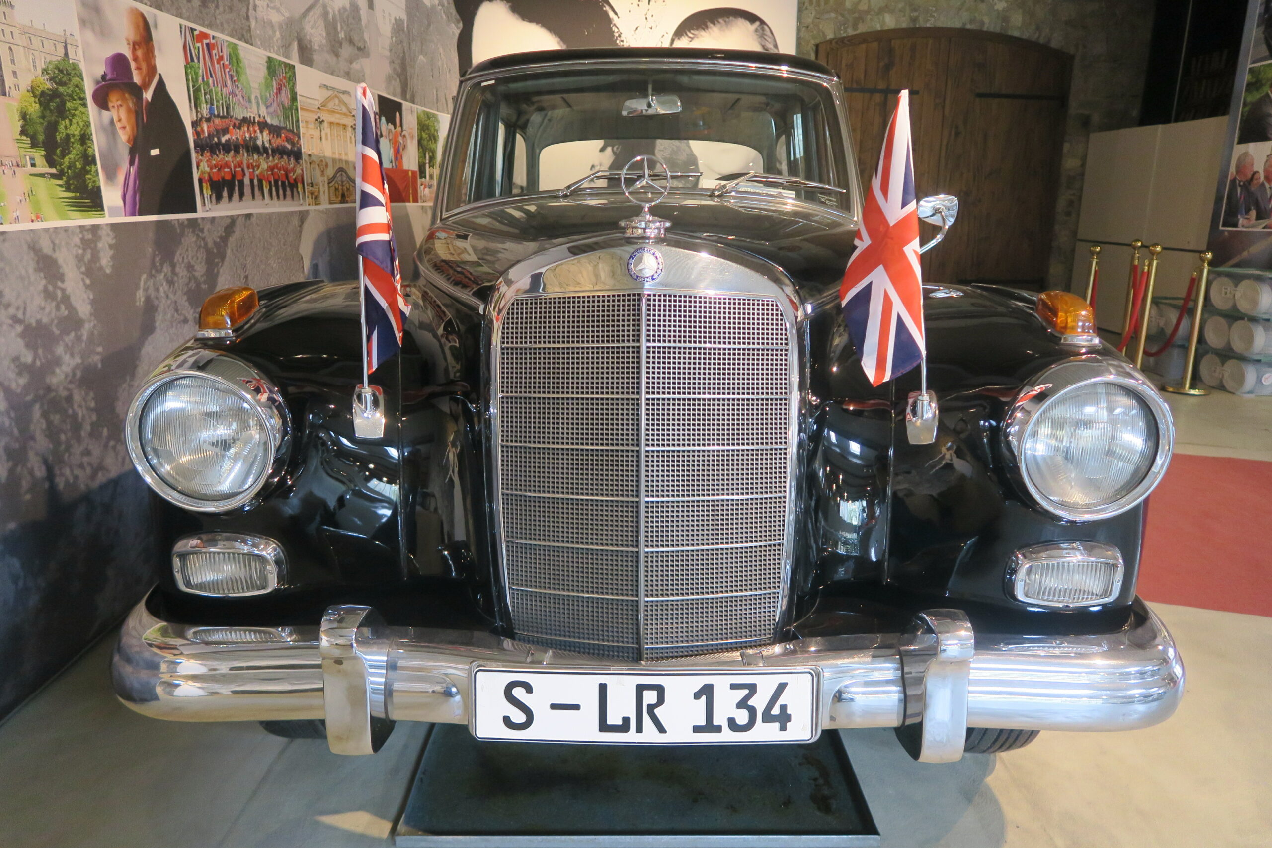 Fast ausschließlich im Mercedes-Benz 600 Landaulet, aber eben nicht ganz. Bei allem staatstragenden Charakter der Reise gab es zumindest auch einen eher dem Privaten vorbehaltenen Tag. Am 24. Mai 1965 besuchte das königliche Paar Schloss Langenburg. Der Besuch galt Fürstin Margarita zu Hohenlohe-Langenburg, der ältesten Schwester des britischen Prinzgemahls Philip und Großmutter des heutigen Fürsten Philipp. Für die Fahrt nach Langenburg stellte die Daimler-Benz AG die 300$d Pullman-Limousine zur Verfügung. Dieses „königliche“ Sonderfahrzeug auf Basis der 300d Limousine steht heute als Dauerleihgabe von Mercedes-Benz im Deutschen Automuseum in Langenburg und erinnert an den royalen Besuch vor 59 Jahren.