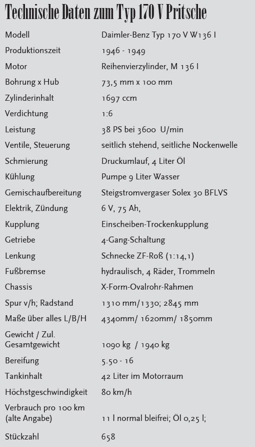Insgesamt entstanden von den Pritschenwagen von 1946 bis 1949 die recht geringe Anzahl von 658 Stück. In den Produktionslisten wird dabei übrigens nicht nach Pritsche, Polizeipritsche und Pritsche mit Plane und Spriegel unterschieden, wie es im Kommissionsbuch der Fall ist. Neben den werkseitigen Pritschenwagen gab es selbstverständlich auch Aufbauten durch andere Firmen. Besonders zu nennen ist hier das bekannte Unternehmen Lueg in Essen. Hier entstanden noch lange danach Sonderaufbauten der Basis der 170 V, 170 D sowie deren Modifikationen und sogar auf 170 S.
