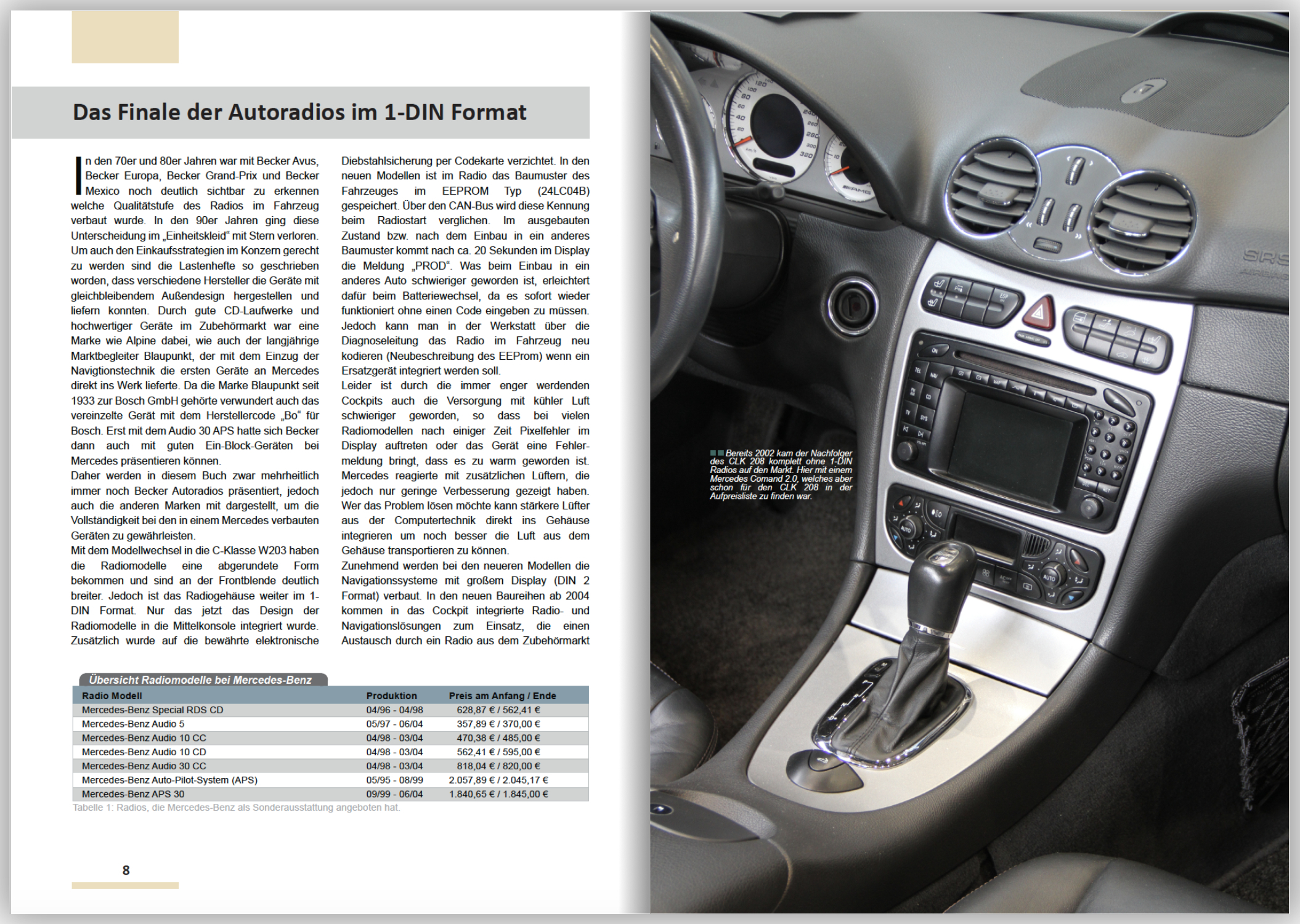 Als zweite Veröffentlichung dieser Reihe umfasst dieses Buch alle Becker Radiomodelle, die von 1995 bis 2005 ab Werk in einen Mercedes verbaut wurden. Enthalten sind alle Din1-Schacht Geräte die bis zum Schluss bei Mercedes angeboten wurden. Die Radios werden sehr detailliert, mit allen technischen Daten, Bedien- und Anschlussmöglichkeiten, bebildert dargestellt. Dem Leser werden Vorzüge über die Technik der verschiedenen Modelle erläutert, welches eine Kaufentscheidung für ein bestimmtes Radio auf den einschlägigen Märkten und/oder Internetplattformen wesentlich erleichtert.