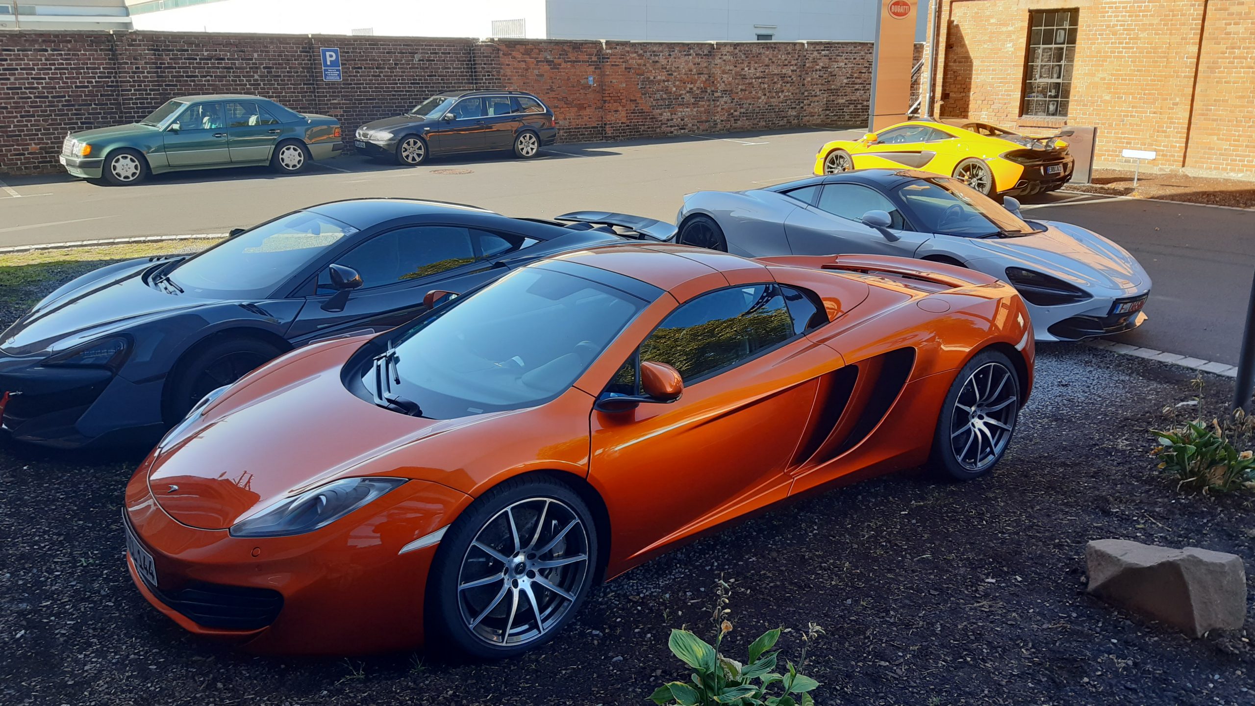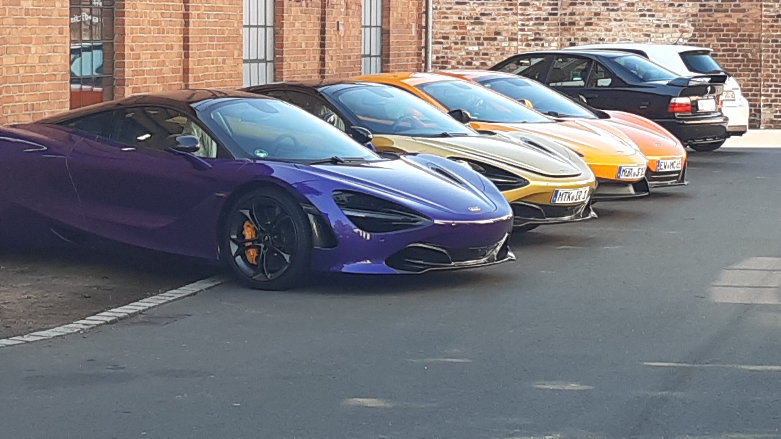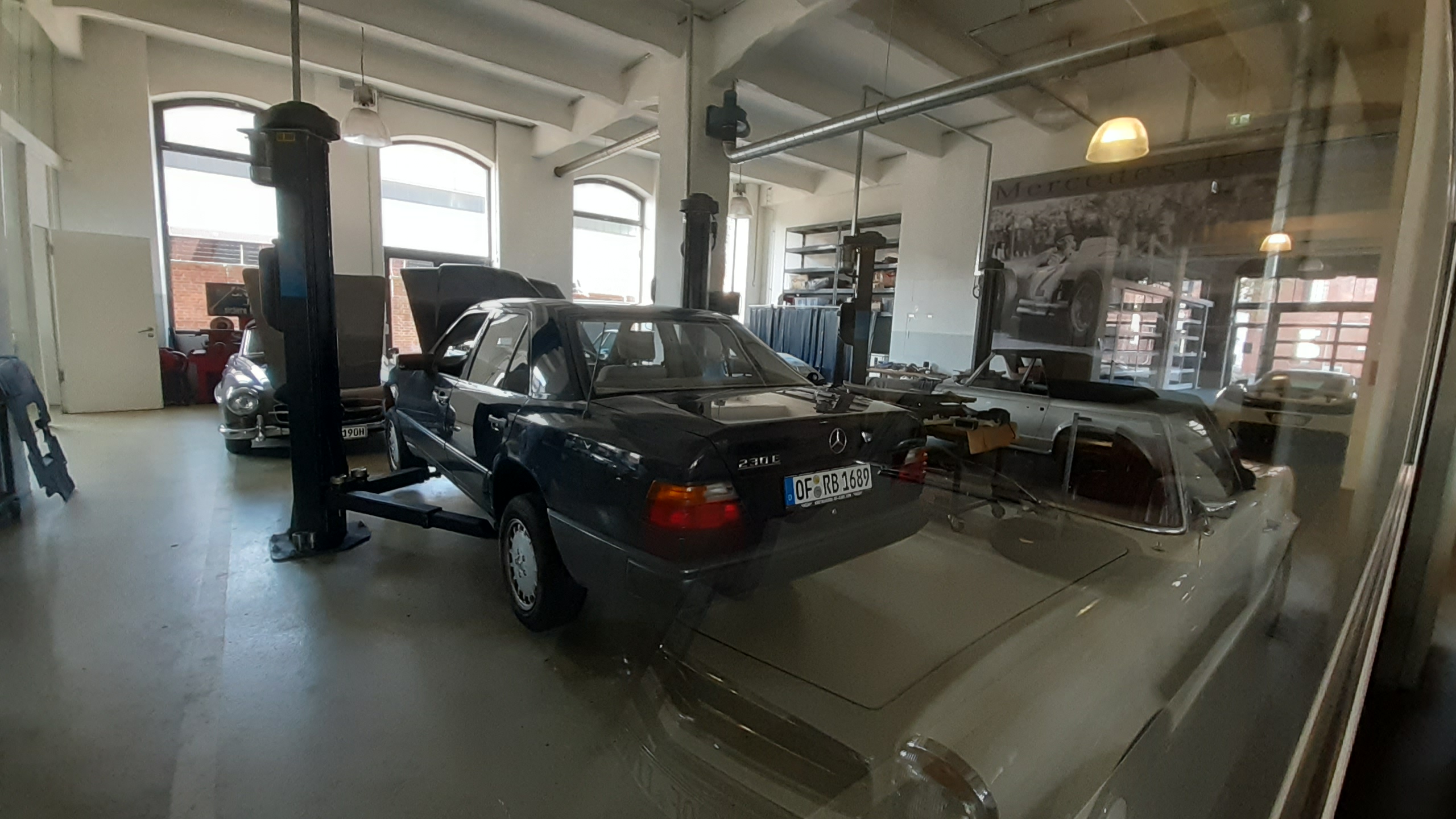 Das großzügige Gelände empfing mich bei bestem Klassikerwetter. Auf dem Parkplatz wechselten sich immer wieder Alltagsklassiker und Sammlerfahrzeuge ab (AMG E36 Coupé, Porsche 911T, Pagoden, Jaguar E-Type und Aston Martin-Sportwagen) und zwischendurch drehten nagelneue McLaren ihre Testrunde die in einer der zahlreichen Werkstätten gewartet oder repariert wurden.