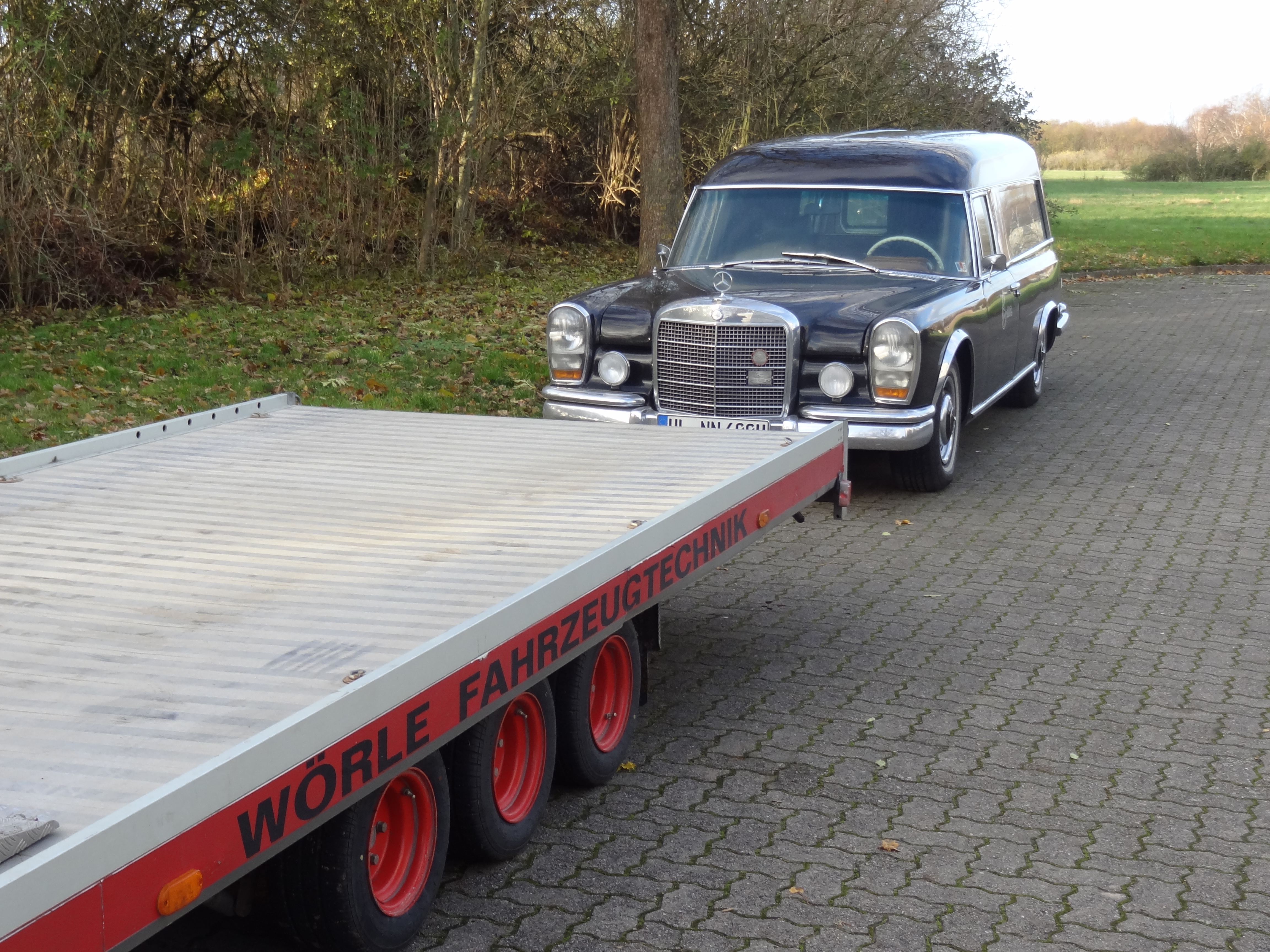 Die Firma Wörle machte das fast Unmögliche war. Der 600er Leichenwagen zeigte am Sonntag vor der Beerdigung eine Hydraulik-Undichtigkeit… am Montag wurde der Wagen in der Werkstatt aufgenommen und am Donnerstag war er wieder einsatzbereit. Zu allem Überfluss stellte man auch noch einen entsprechend passenden Hänger zur Verfügung, so dass Dominik Kraus seinen Hänger zu Hause lassen konnte.