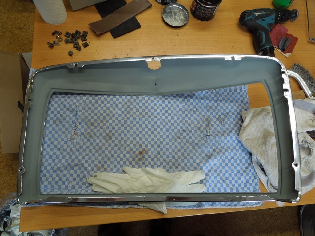 Was man auf den Fotos sieht, sind zwei Tage Chrompolieren, Rostentfernen und Aufhübschen. Als nächstes werden die Aluminiumwaben, der Stern und die Zierstäbe für den Grill (einen Satz neuer habe ich) restauriert.