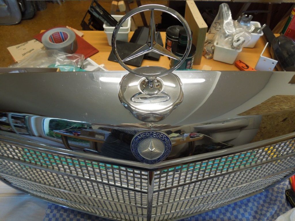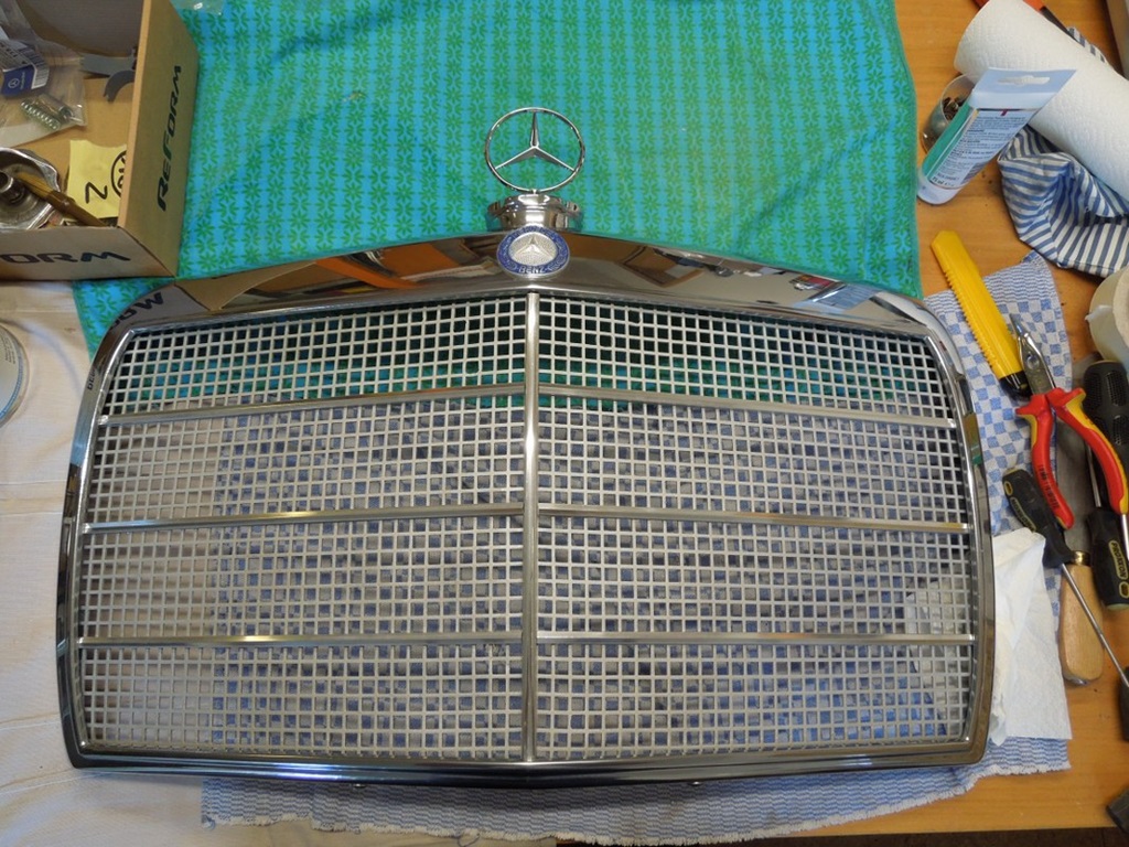 Nach dem Glasperlenstrahlen der Halterungen ging es an die Chromteile. Innen per Hand geschliffen, ordentlich abgeklebt und mit Zinkspray eingesprüht. Danach habe ich es in „Hellelfenbein“ (RAL 1015) lackiert, wie original. In versteckten Mercedes-Expertenkreisen wird es auch „Spermaweiß“ genannt, man kann es sich also selbst lackieren 😉 (nur zur Kontrolle, ob das hier jemand liest).