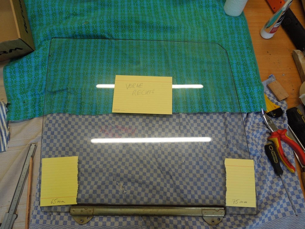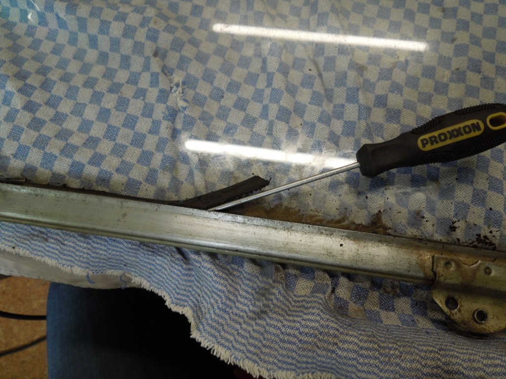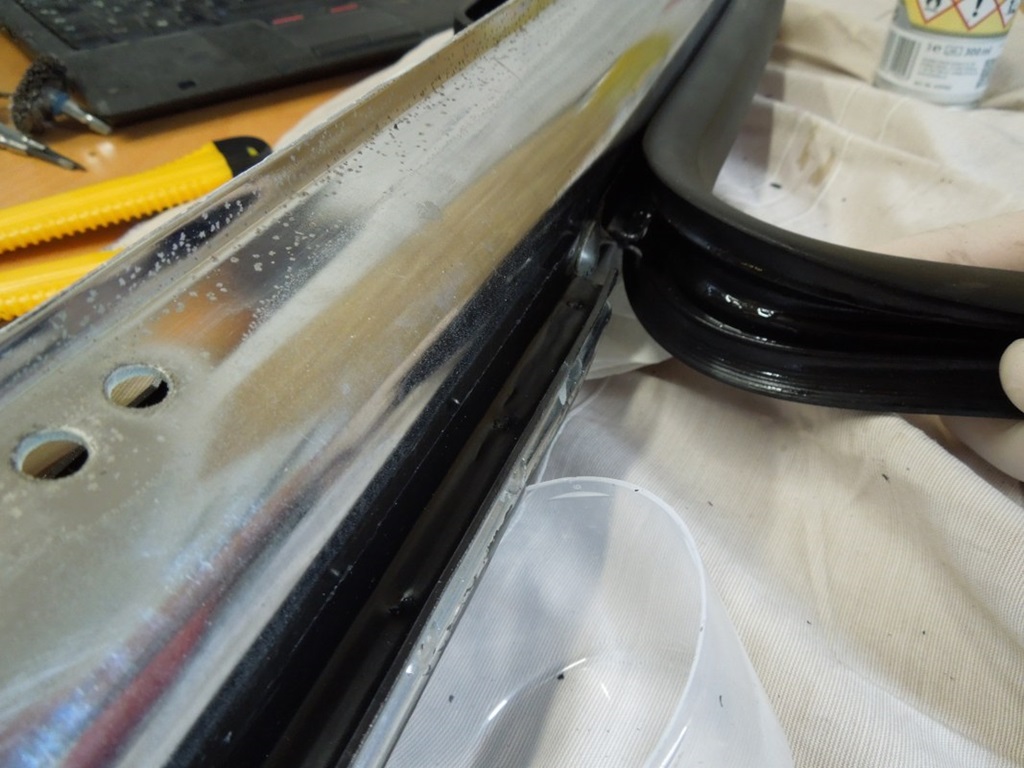Als ich alle Gummis/Profile für die Tür bestellt hatte, wollte ich auch gleich das Gummiprofil in der Halterung, die die Türfenster unten hält, austauschen. Schlechte Idee. Ich habe pro Fenster eine (1!) Stunde gebraucht, um die alten abzubekommen.
