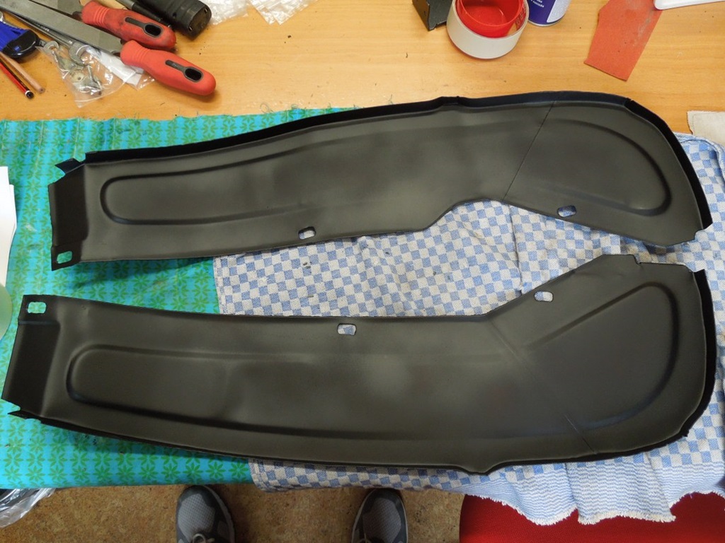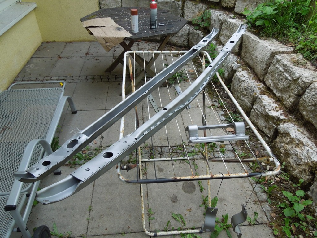 Die beiden Trennbleche in den vorderen Radkästen mussten noch gemacht werden. Also Glasperlenstrahlen, eine Seite lackieren und außen etwas Unterbodenschutz aufsprühen … zusammen mit einigen schön verzinkten Schrauben ist auch das fertig zum Einbau.