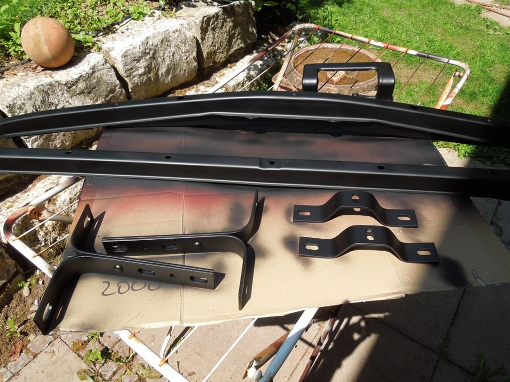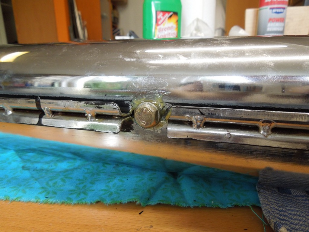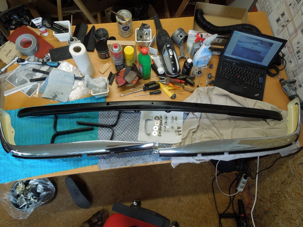 Jetzt habe ich mit den Stoßstangenhalterungen begonnen. Ich habe die Stoßstangen von der California-Limousine abmontiert, was an sich schon eine ziemliche Herausforderung war. Die Stahlhalterungen im Inneren waren in einem recht passablen Zustand, ebenso das Chrom. Zwei Aufkleber auf dem Chrom haben sich als Abnutzungsspur von drei Fingernägeln erwiesen 😉 …