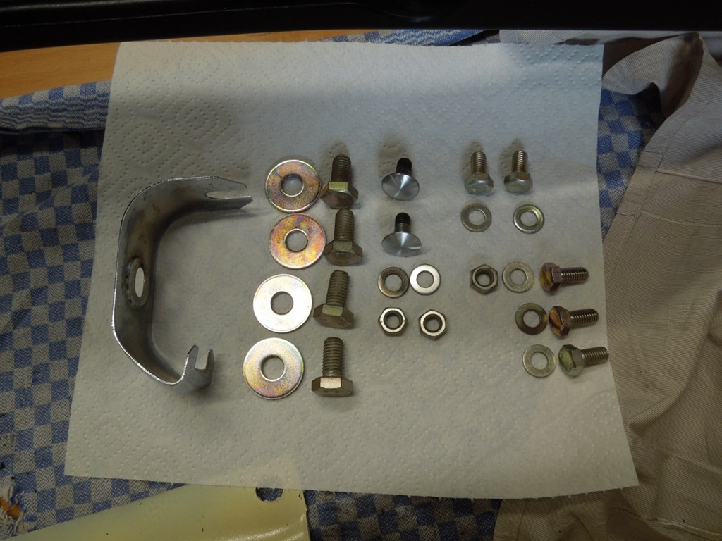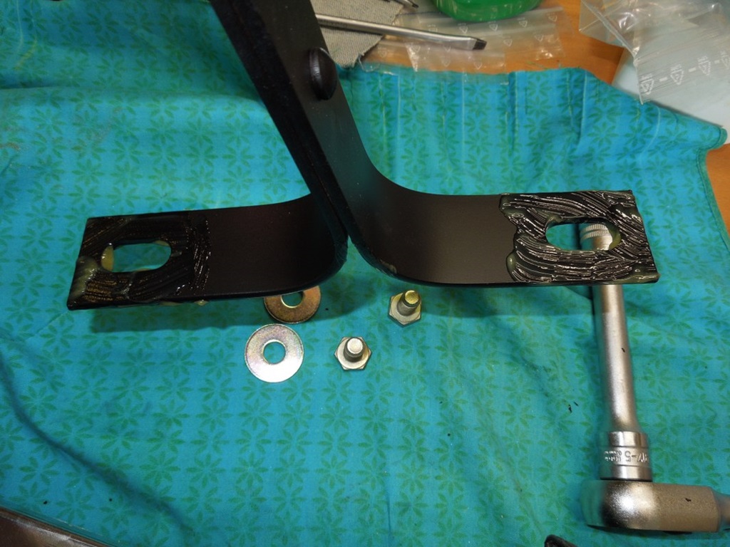 Gestern habe ich die Stahlhalterungen glasperlenstrahlen lassen und sie sind wirklich gut geworden. Also habe ich sie grundiert und lackiert. Die beiden Chromklammern in der Mitte waren nicht in gutem Zustand, aber ich konnte sie neu vom Club besorgen. Die nächsten Schritte sind also, den Rost von den 4 Chromteilen zu entfernen, das in Angriff zu nehmen und zu wachsen und dann – hoffentlich – kann ich alles wieder zusammenbauen.
