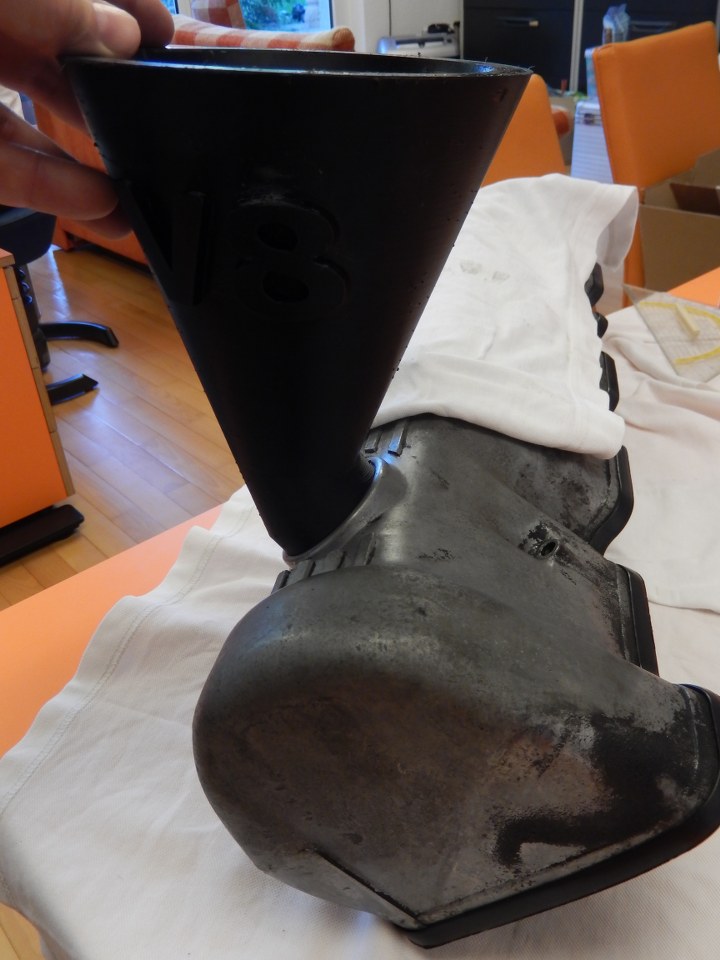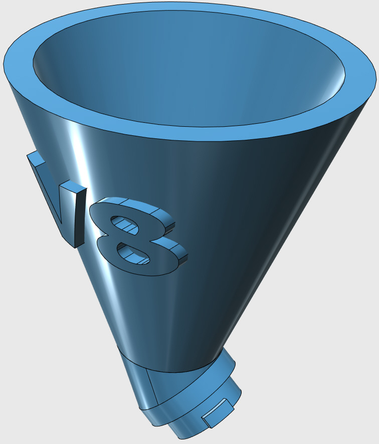 Beim 90°-V8 ist ein normaler Trichter immer um 45° geneigt, man muss ihn festhalten … echte First-World-Probleme. Also dachte ich mir, ich konstruiere mal einen – ziemlich überdimensionierten – Öleinfülltrichter, der wie der Öldeckel eingeschraubt werden kann … ist zwar etwas „stabil“ geworden, aber es sollte klappen.