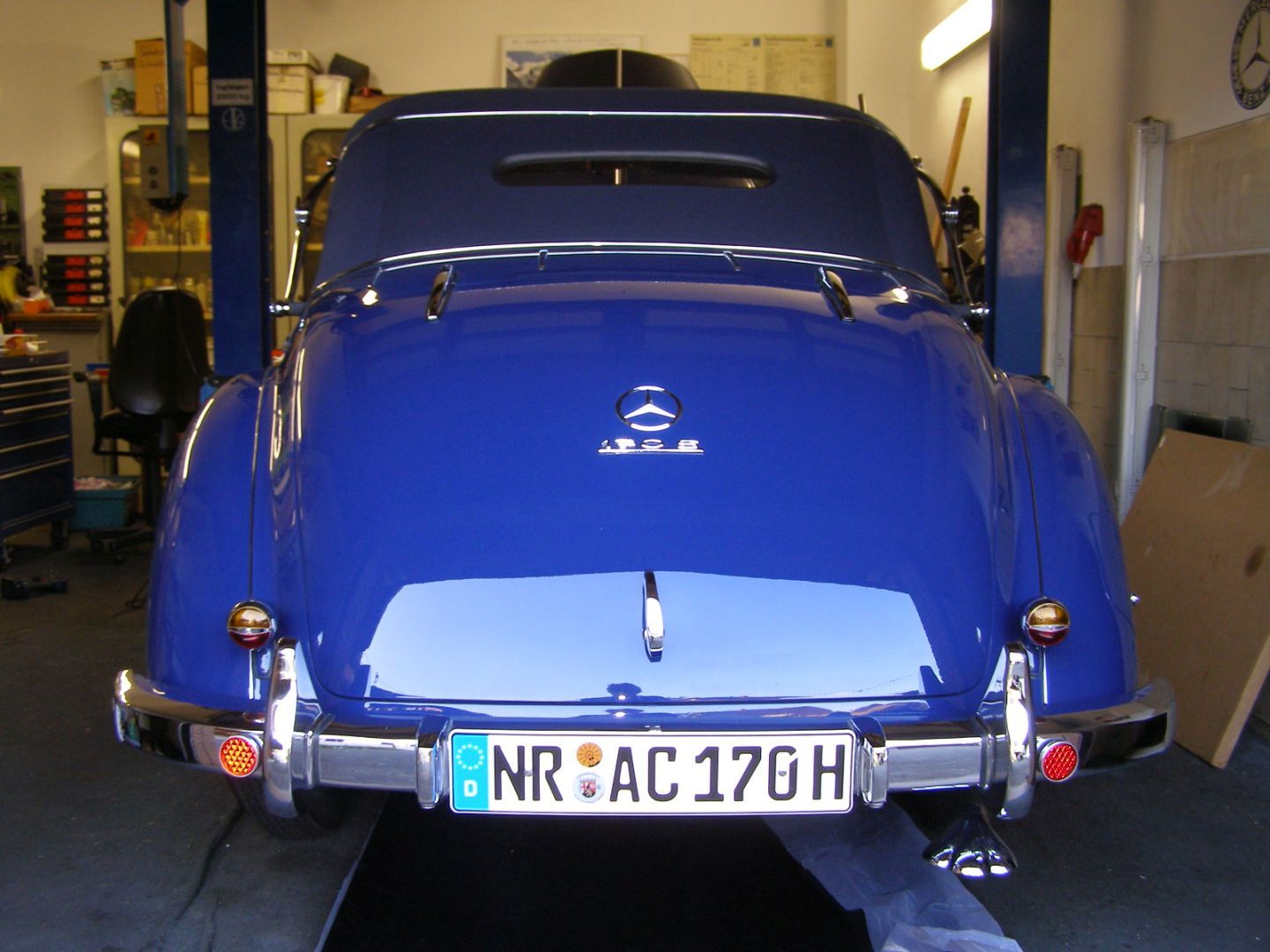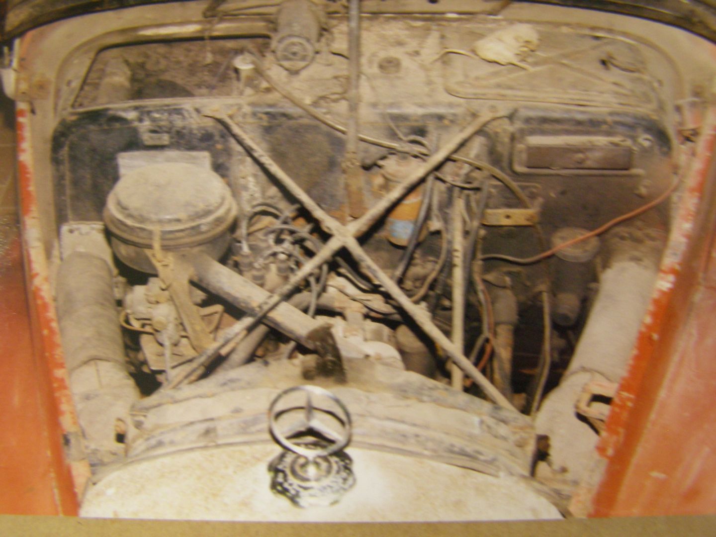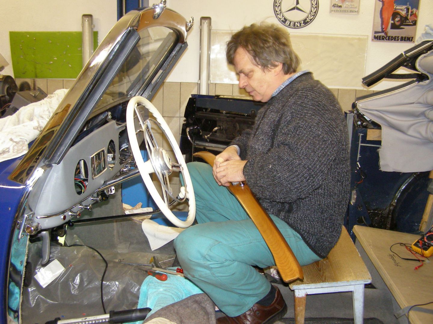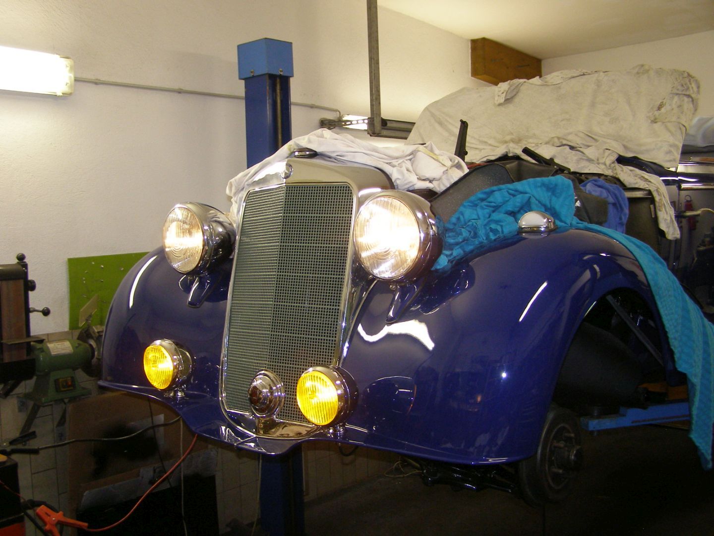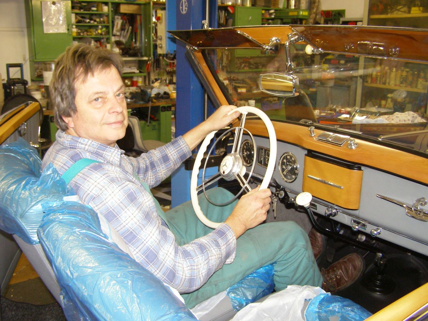 Nun zur Erklärung der am Ende des Artikels befindlichen Galerie: Am Anfang meiner 18-jährigen Restauration wurden die Fotos noch auf Zelluloidbasis gemacht und dann in Papierform archiviert, von denen ich heute ein paar abfotografiert habe. Ein paar letzte Fotos im Vergleich. Praktisch alle Interieurteile aus Holz, Leder, Teppiche, usw. dienten nur noch zur Vorlage für den Nachbau. Die beiden Ratten und –zig mumifizierte Mäuse habe ich nicht mehr restaurieren könnenJ Ich habe ca. 2000 Fotos von der Restauration gemacht. Davon will ich mit ca. 350 bis 400 Fotos noch ein Fotobuch mit dazugehörenden Texten machen. Aber – zuerst muss der Wagen mal auf die Straße. Dieses 170er S A-Cabrio ist am 04.07.1951 in der Schweiz erstmals zugelassen worden und am 20.02.1968 letztmalig in Lausanne/Schweiz abgemeldet worden. Nach dem teileweisen Auseinanderbauen von zwei Schweizer „Restaurateuren“ und vor einem weiteren Restaurationsversuch in Deutschland kaufte ich 1999 die Fragmente und Einzelteile von einem Deutschen „Fantasten“ ab. Aus den wenigen Daten ist ersichtlich, dass mit fast 50 Jahren Stilllegung und meiner rund 18 jährigen Restauration schon riesige Zeitspannen resultieren. Die Fotos beweisen es, dass die Zeit weiterlief und im wahrsten Sinne des Wortes auch bei mir im Gesicht geschrieben steht. Natürlich habe ich zwischendurch auch schon mal etwas anderes gemacht und auch ein paar andere Fahrzeuge auf die Beine gestellt. Aber die ersten zwei Jahre und die letzten zwei Jahre habe ich mich fast ausschließlich mit dem 170er beschäftigt, sodass summa summarum schätzungsweise mindestens 5000 Arbeitsstunden zusammengekommen sind. Das Fahrgestell mit Achsen, Bremsen, Zentralschmieranlage, Antriebsstrang usw. war noch mit Abstand das Einfachste. Schwieriger mit sehr viel Zeitaufwand folgte das Anfertigen, natürlich aus über 20 Jahre trocken gelagerter Esche, von Karosserieholz und Türrahmenholz über dreidimensionale eigens angefertigte Schablonen, Unterkonstruktionen für Interieurteile, Verdeckgestell und Spriegel. Gut vier Jahre war ich nur mit der Karosserieschweißung zu Gange. Jeden Kotflügel (die vorderen sind je 2,90m lang) und jede Tür oder Haube habe ich durchschnittlich je 100mal probemontiert. Es wird hoffentlich nicht als Angeberei gewertet, wenn ich ganz besonders stolz auf die genauen und gleichmäßigen Karosseriespaltmaße im Zehntelmillimeterbereich bin. Die Karosseriefluchten, Rundungen und Radausschnitte sind einwandfrei. Ein Jahr lang beschäftigte ich mich nur mit der Karosserieverzinnung und Grundierung. Dann sämtliche Vollmessing-Zierleisten auf genaue Länge der Spaltmaßen angepasst, gefeilt und teilweise mit Messing und Lot verlängert und allesamt den Rundungen der Karosserieform saugend gebogen und mit Schweifhammer auf Linie getrieben, angepasst und probemontiert. Die gleiche Prozedere mit Kühlerverkleidung, Verdeckchrom, Sturmstangen, Fensterchrom, Steinschlagecken, usw. Mehrere Jahre beschäftigte ich mich zwischendurch immer wieder mit allen Reparaturen von Einzelaggregaten wie Getriebe, Lenkgetriebe und Motor, Motoranbauteilen, technische Einzelteile wie Scheibenwischerteile, Schlösser, Scharniere, Fensterheber, Armaturen, Instrumenten, Interieurteilen, Tank, Anbauteilen wie Stoßstangen, Zierleisten, Lampen, Felgen, usw. usw. usw….