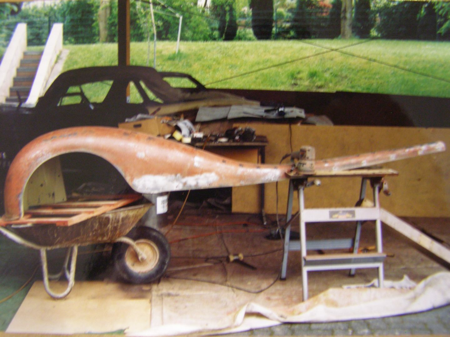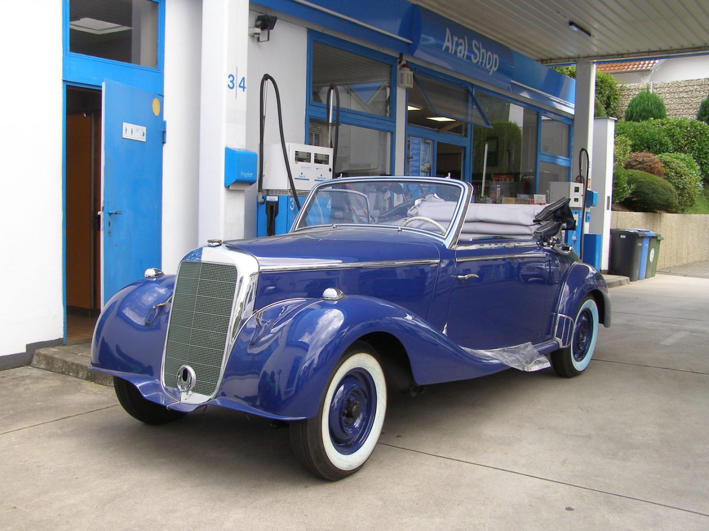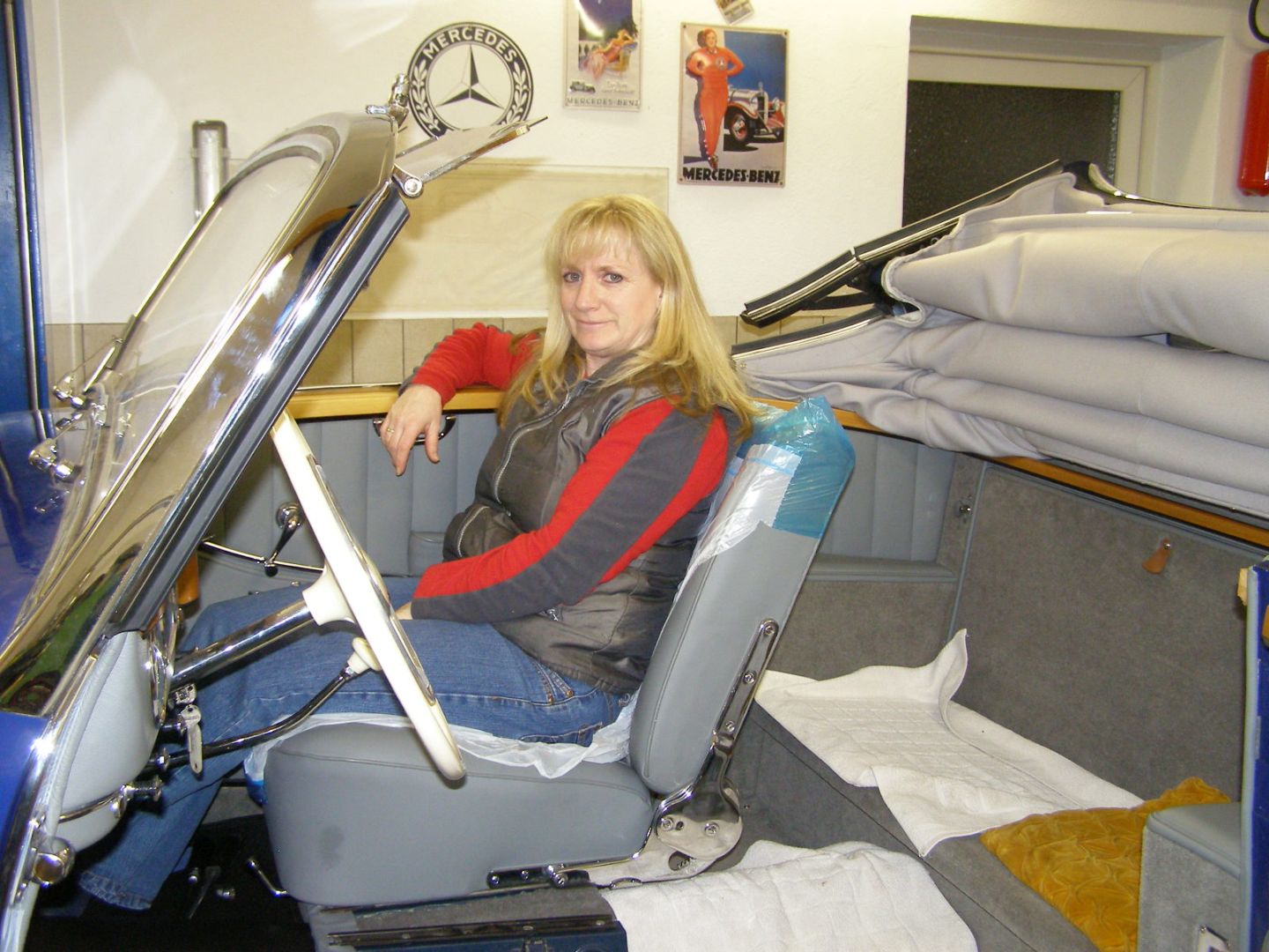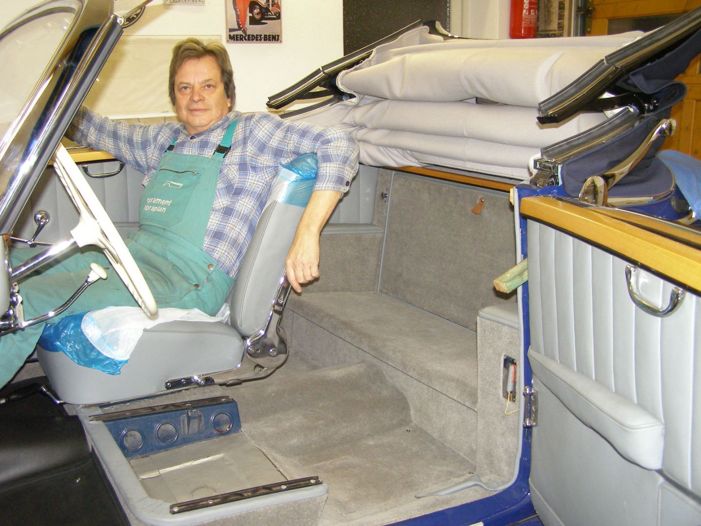 Nun zur Erklärung der am Ende des Artikels befindlichen Galerie: Am Anfang meiner 18-jährigen Restauration wurden die Fotos noch auf Zelluloidbasis gemacht und dann in Papierform archiviert, von denen ich heute ein paar abfotografiert habe. Ein paar letzte Fotos im Vergleich. Praktisch alle Interieurteile aus Holz, Leder, Teppiche, usw. dienten nur noch zur Vorlage für den Nachbau. Die beiden Ratten und –zig mumifizierte Mäuse habe ich nicht mehr restaurieren könnenJ Ich habe ca. 2000 Fotos von der Restauration gemacht. Davon will ich mit ca. 350 bis 400 Fotos noch ein Fotobuch mit dazugehörenden Texten machen. Aber – zuerst muss der Wagen mal auf die Straße. Dieses 170er S A-Cabrio ist am 04.07.1951 in der Schweiz erstmals zugelassen worden und am 20.02.1968 letztmalig in Lausanne/Schweiz abgemeldet worden. Nach dem teileweisen Auseinanderbauen von zwei Schweizer „Restaurateuren“ und vor einem weiteren Restaurationsversuch in Deutschland kaufte ich 1999 die Fragmente und Einzelteile von einem Deutschen „Fantasten“ ab. Aus den wenigen Daten ist ersichtlich, dass mit fast 50 Jahren Stilllegung und meiner rund 18 jährigen Restauration schon riesige Zeitspannen resultieren. Die Fotos beweisen es, dass die Zeit weiterlief und im wahrsten Sinne des Wortes auch bei mir im Gesicht geschrieben steht. Natürlich habe ich zwischendurch auch schon mal etwas anderes gemacht und auch ein paar andere Fahrzeuge auf die Beine gestellt. Aber die ersten zwei Jahre und die letzten zwei Jahre habe ich mich fast ausschließlich mit dem 170er beschäftigt, sodass summa summarum schätzungsweise mindestens 5000 Arbeitsstunden zusammengekommen sind. Das Fahrgestell mit Achsen, Bremsen, Zentralschmieranlage, Antriebsstrang usw. war noch mit Abstand das Einfachste. Schwieriger mit sehr viel Zeitaufwand folgte das Anfertigen, natürlich aus über 20 Jahre trocken gelagerter Esche, von Karosserieholz und Türrahmenholz über dreidimensionale eigens angefertigte Schablonen, Unterkonstruktionen für Interieurteile, Verdeckgestell und Spriegel. Gut vier Jahre war ich nur mit der Karosserieschweißung zu Gange. Jeden Kotflügel (die vorderen sind je 2,90m lang) und jede Tür oder Haube habe ich durchschnittlich je 100mal probemontiert. Es wird hoffentlich nicht als Angeberei gewertet, wenn ich ganz besonders stolz auf die genauen und gleichmäßigen Karosseriespaltmaße im Zehntelmillimeterbereich bin. Die Karosseriefluchten, Rundungen und Radausschnitte sind einwandfrei. Ein Jahr lang beschäftigte ich mich nur mit der Karosserieverzinnung und Grundierung. Dann sämtliche Vollmessing-Zierleisten auf genaue Länge der Spaltmaßen angepasst, gefeilt und teilweise mit Messing und Lot verlängert und allesamt den Rundungen der Karosserieform saugend gebogen und mit Schweifhammer auf Linie getrieben, angepasst und probemontiert. Die gleiche Prozedere mit Kühlerverkleidung, Verdeckchrom, Sturmstangen, Fensterchrom, Steinschlagecken, usw. Mehrere Jahre beschäftigte ich mich zwischendurch immer wieder mit allen Reparaturen von Einzelaggregaten wie Getriebe, Lenkgetriebe und Motor, Motoranbauteilen, technische Einzelteile wie Scheibenwischerteile, Schlösser, Scharniere, Fensterheber, Armaturen, Instrumenten, Interieurteilen, Tank, Anbauteilen wie Stoßstangen, Zierleisten, Lampen, Felgen, usw. usw. usw….