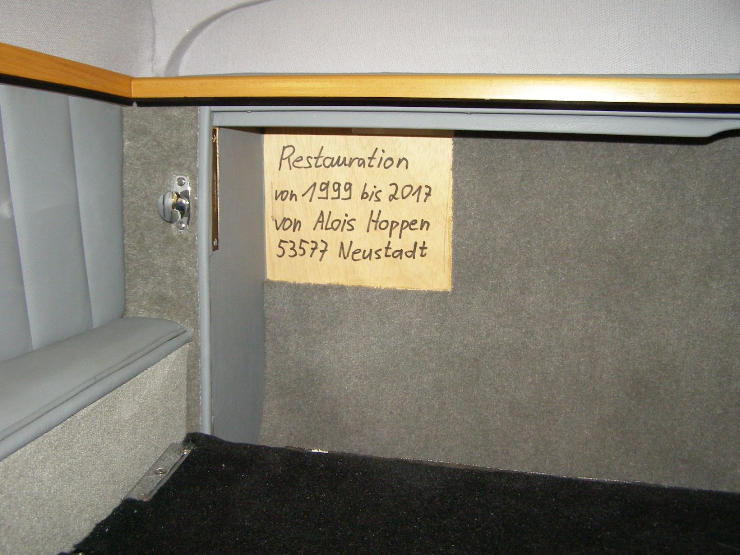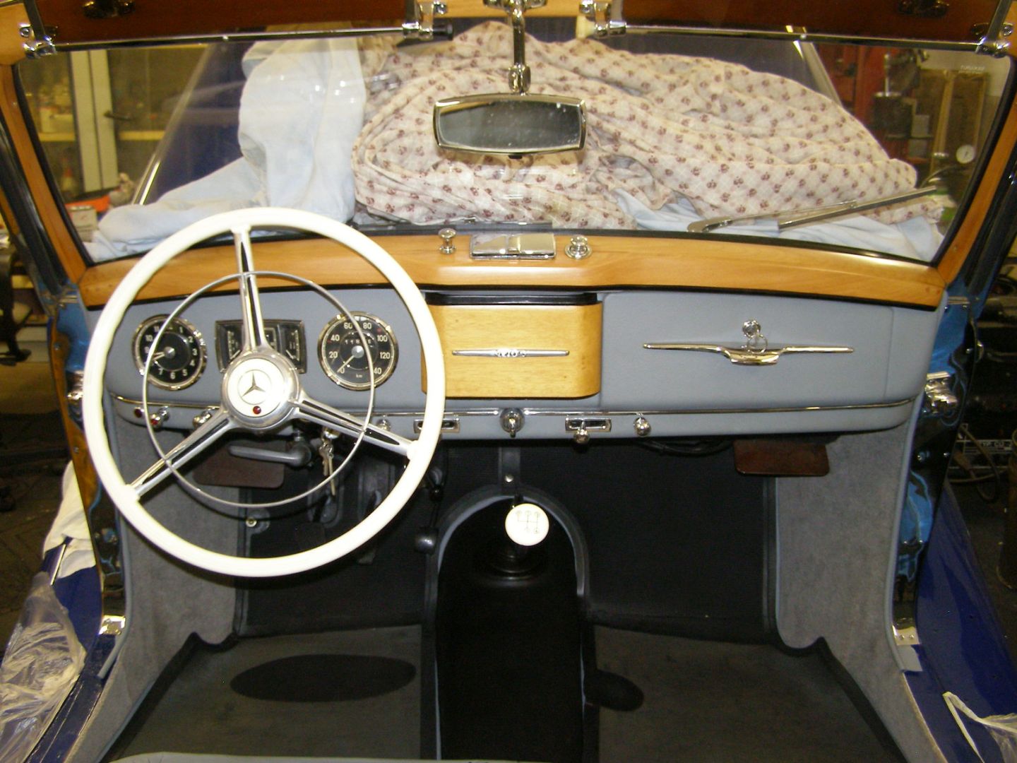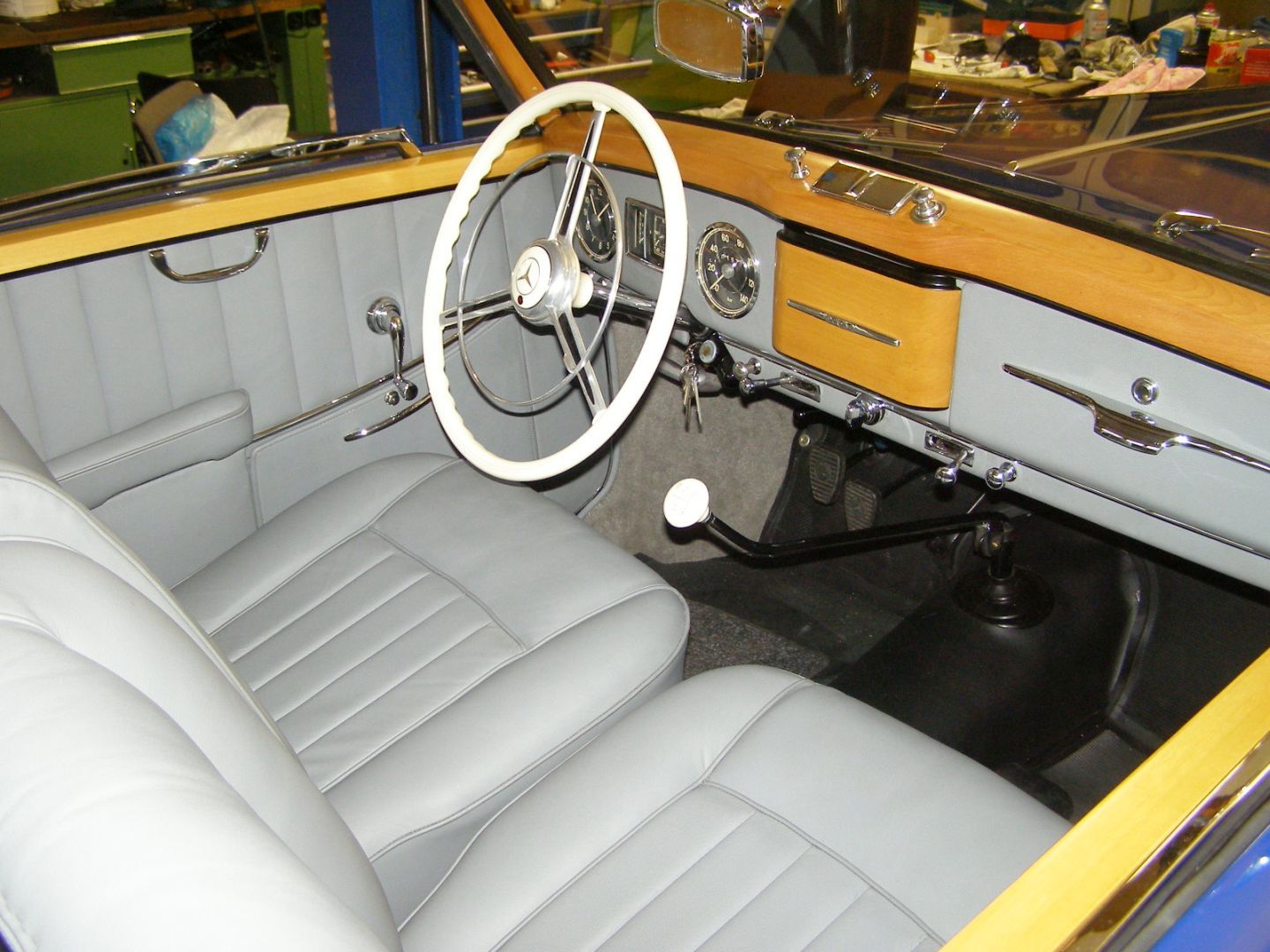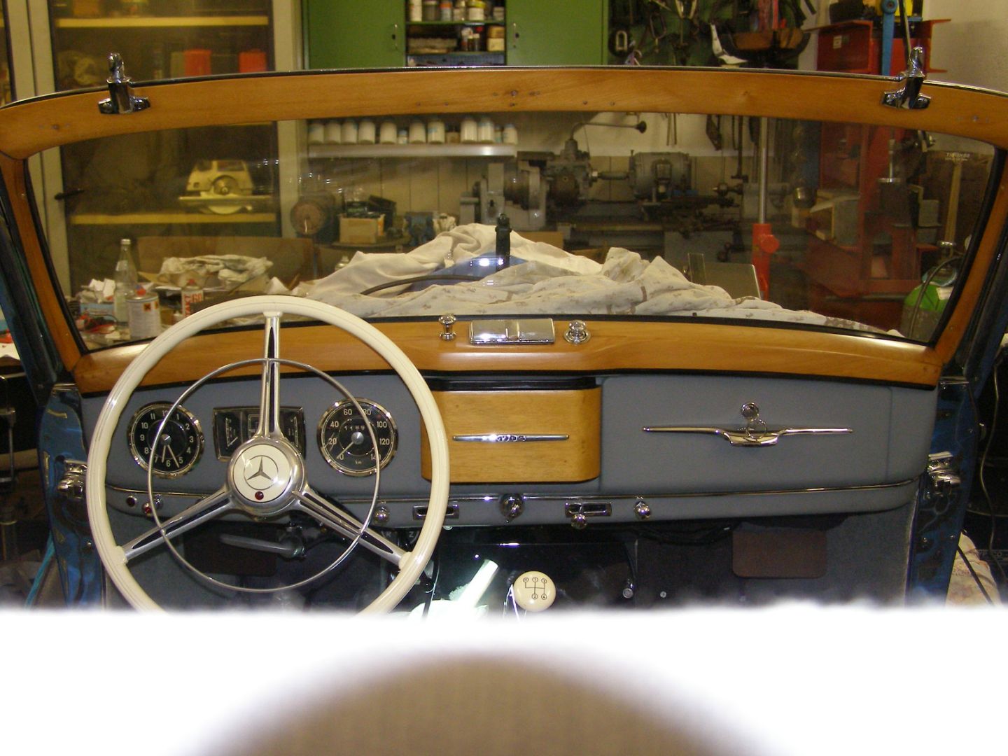Mit dem Hauptzusammenbau und das Einziehen und Verklemmen der Kabelbäume fing ich 2015 an. Die Winkerfunktion mit Blinker jede Seite in gleicher Frequenz blinkend und Blinker in der Zweikammerschlussleuchte in originaler Eierleuchte (aber mit 3 Funktionen für Schluss-, Blinker- und Bremslicht), Betätigung natürlich über den Lenkrad-Hupenring, dann die zwingend erforderliche Warnblinkanlage, und das alles noch in 6 Voltausführung, waren schon interessante Herausforderungen. Zuschneiden, Verlegen und Kleben der Teppichteile und Lederbezug, unzählige Ledereinfassungen, Himmel und Dachabschluss waren im Winter 2016/17 angesagt. Anfang 2017 passte ich das sichtbare Interieurholz von Ausschlag, Fensterschlüssel, Fondbereich und Türen an und montierte es im Baufortschritt zusammen mit den Interieurteilen. Ich achtete exakt auf die gleiche handwerkliche Verarbeitung und Montage, z.B. alles mit Schrauben, Muttern etc. aus den 40/50er Jahren, also z.B. Schlitzschrauben, 8er Schrauben mit 14er Sechskant, usw. Sämtliches Zierholz ohne sichtbare Montageschrauben. Die ehemalige Handwerkstechnik hierfür konnte ich mir an meinem zweiten 170er SAC abgucken, der bis dato niemals auseinander gebaut war. Im Nachhinein muss ich feststellen, dass ich ohne den zweiten SAC als Anschauungsobjekt das Konvolut aus lieblos demontierten Alt- und Neuteilen ohne jegliche Aufzeichnungen nicht in der nötigen Originalität hätte aufbauen können. Letzteren tauschte ich aber (ohne zusätzlichen Geldfluss) ein für Arbeiten, die ich nicht selbst machen konnte. Lack, Ledersitzbezüge, Türbelag und Dach waren die einzigen Gewerke, die dann dem Profi überlassen wurden. Alles andere ist ganz langsam in meiner kleinen „Muckelbude“ zusammengewachsen.