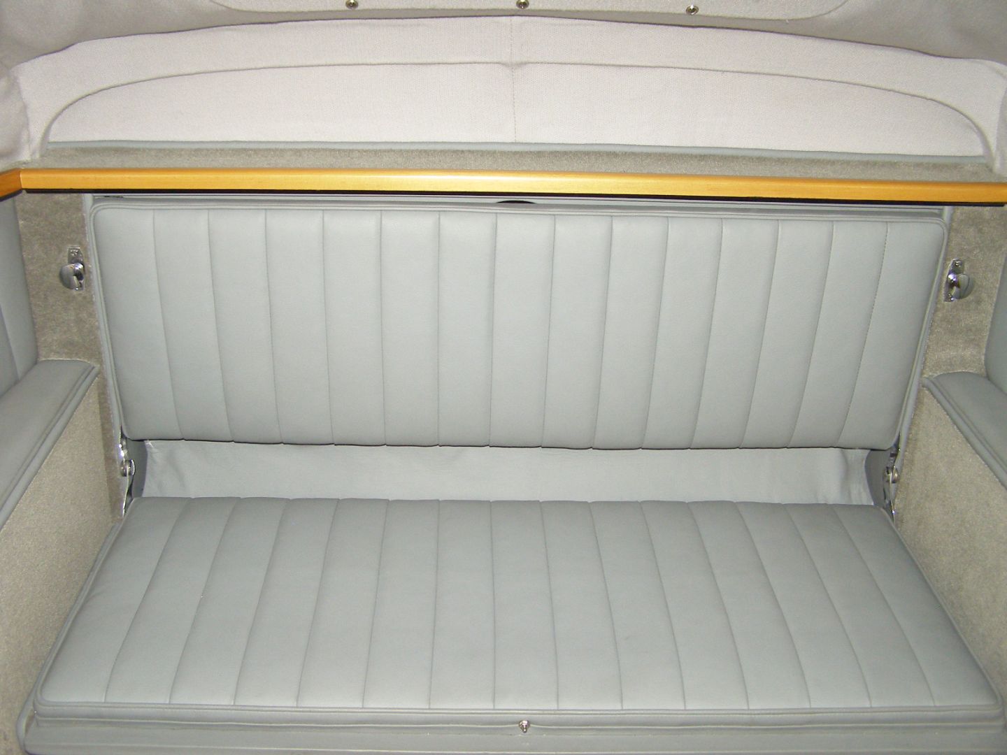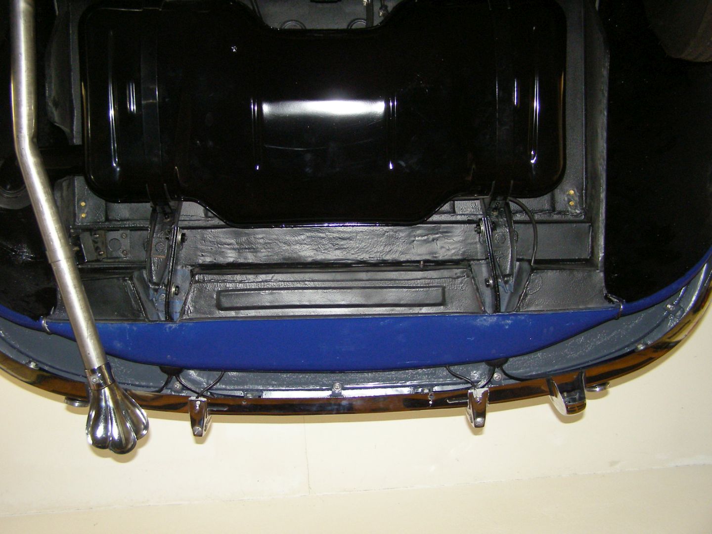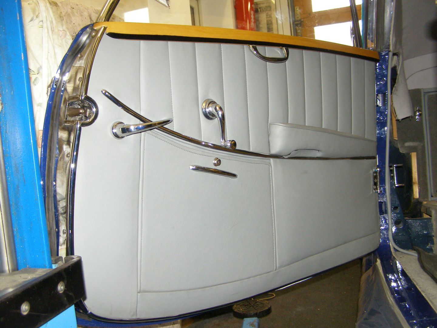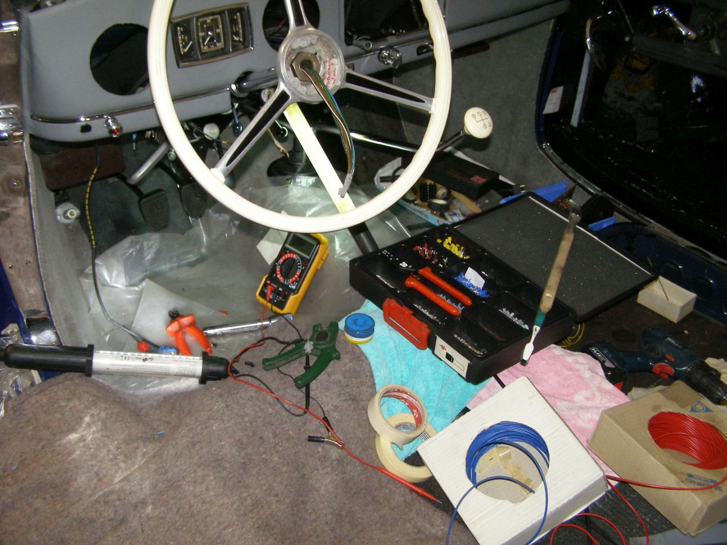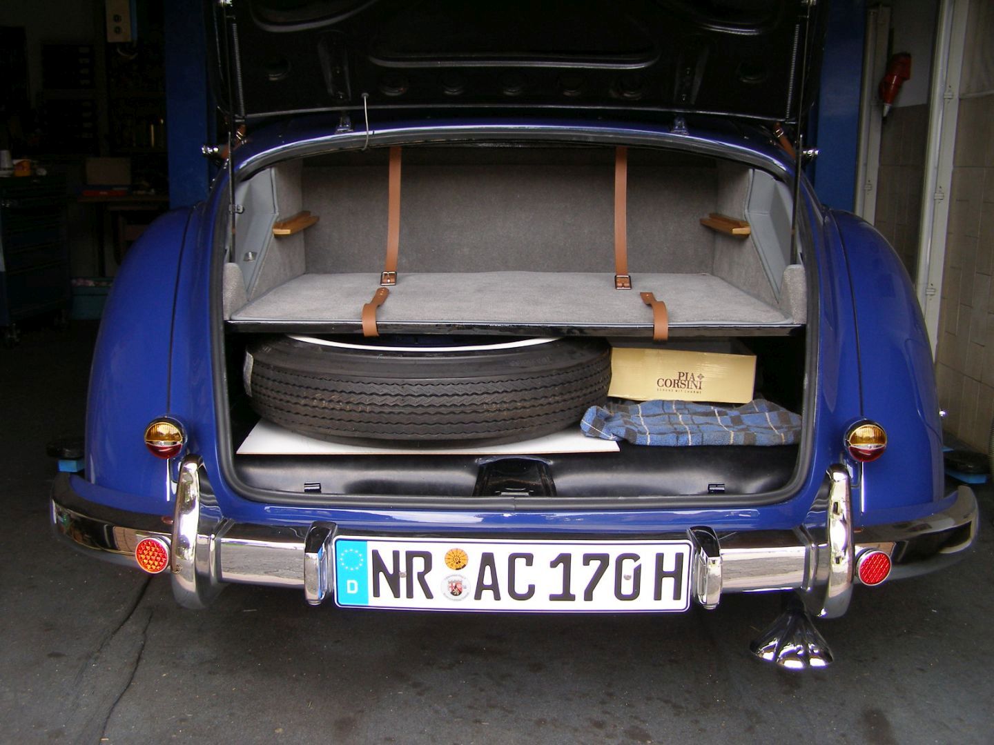 Mit dem Hauptzusammenbau und das Einziehen und Verklemmen der Kabelbäume fing ich 2015 an. Die Winkerfunktion mit Blinker jede Seite in gleicher Frequenz blinkend und Blinker in der Zweikammerschlussleuchte in originaler Eierleuchte (aber mit 3 Funktionen für Schluss-, Blinker- und Bremslicht), Betätigung natürlich über den Lenkrad-Hupenring, dann die zwingend erforderliche Warnblinkanlage, und das alles noch in 6 Voltausführung, waren schon interessante Herausforderungen. Zuschneiden, Verlegen und Kleben der Teppichteile und Lederbezug, unzählige Ledereinfassungen, Himmel und Dachabschluss waren im Winter 2016/17 angesagt. Anfang 2017 passte ich das sichtbare Interieurholz von Ausschlag, Fensterschlüssel, Fondbereich und Türen an und montierte es im Baufortschritt zusammen mit den Interieurteilen. Ich achtete exakt auf die gleiche handwerkliche Verarbeitung und Montage, z.B. alles mit Schrauben, Muttern etc. aus den 40/50er Jahren, also z.B. Schlitzschrauben, 8er Schrauben mit 14er Sechskant, usw. Sämtliches Zierholz ohne sichtbare Montageschrauben. Die ehemalige Handwerkstechnik hierfür konnte ich mir an meinem zweiten 170er SAC abgucken, der bis dato niemals auseinander gebaut war. Im Nachhinein muss ich feststellen, dass ich ohne den zweiten SAC als Anschauungsobjekt das Konvolut aus lieblos demontierten Alt- und Neuteilen ohne jegliche Aufzeichnungen nicht in der nötigen Originalität hätte aufbauen können. Letzteren tauschte ich aber (ohne zusätzlichen Geldfluss) ein für Arbeiten, die ich nicht selbst machen konnte. Lack, Ledersitzbezüge, Türbelag und Dach waren die einzigen Gewerke, die dann dem Profi überlassen wurden. Alles andere ist ganz langsam in meiner kleinen „Muckelbude“ zusammengewachsen.