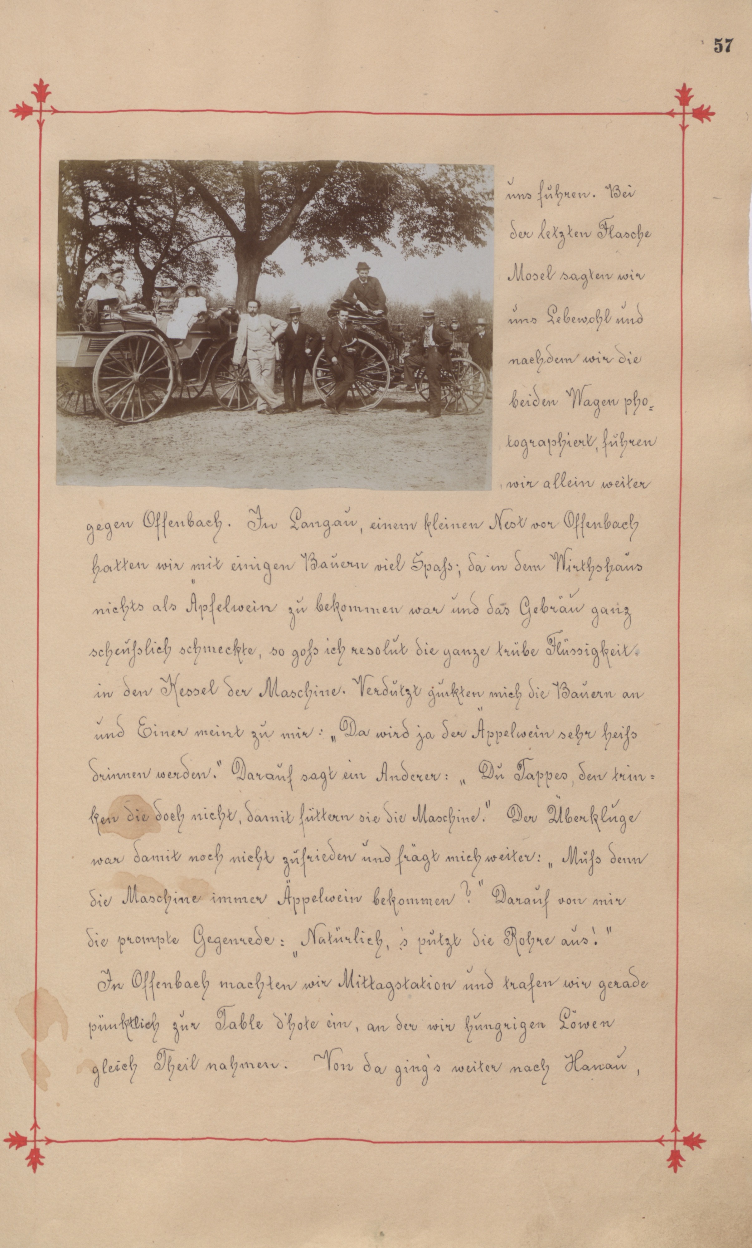 Frühmorgens am 16. Juli 1894 geht es los, über Bautzen und Dresden erreichen die beiden Reisenden Waldheim. Am nächsten Tag geht die Etappe bis Eisenberg, am 18. Juli über Jena, Weimar, Erfurt und Gotha bis nach Eisenach. Darauf folgt eine Fahrt über zwei Tage ohne Übernachtung, bei der unter anderem Fulda, Offenbach, Frankfurt und Darmstadt durchquert werden. Das Ziel nach 26 Fahrstunden ist Mannheim, wo man Carl Benz besucht. An den zwei weiteren Tagen geht es den Rhein entlang nach Norden und schließlich am 22. Juli die Mosel hinauf nach Gondorf – das Abenteuer ist geglückt.