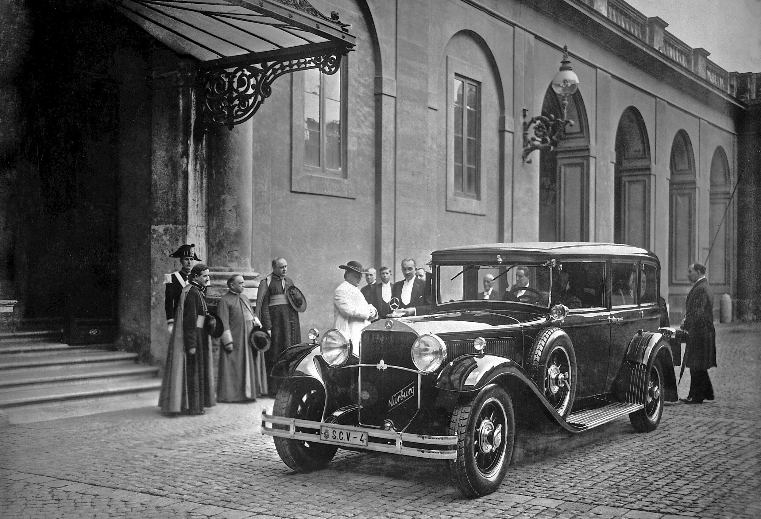 - Übergabe der für den Vatikan als Papstwagen ausgebauten Mercedes-Benz Nürburg Pullman-Limousine an Papst Pius XI. durch Dr. Hans Nibel.