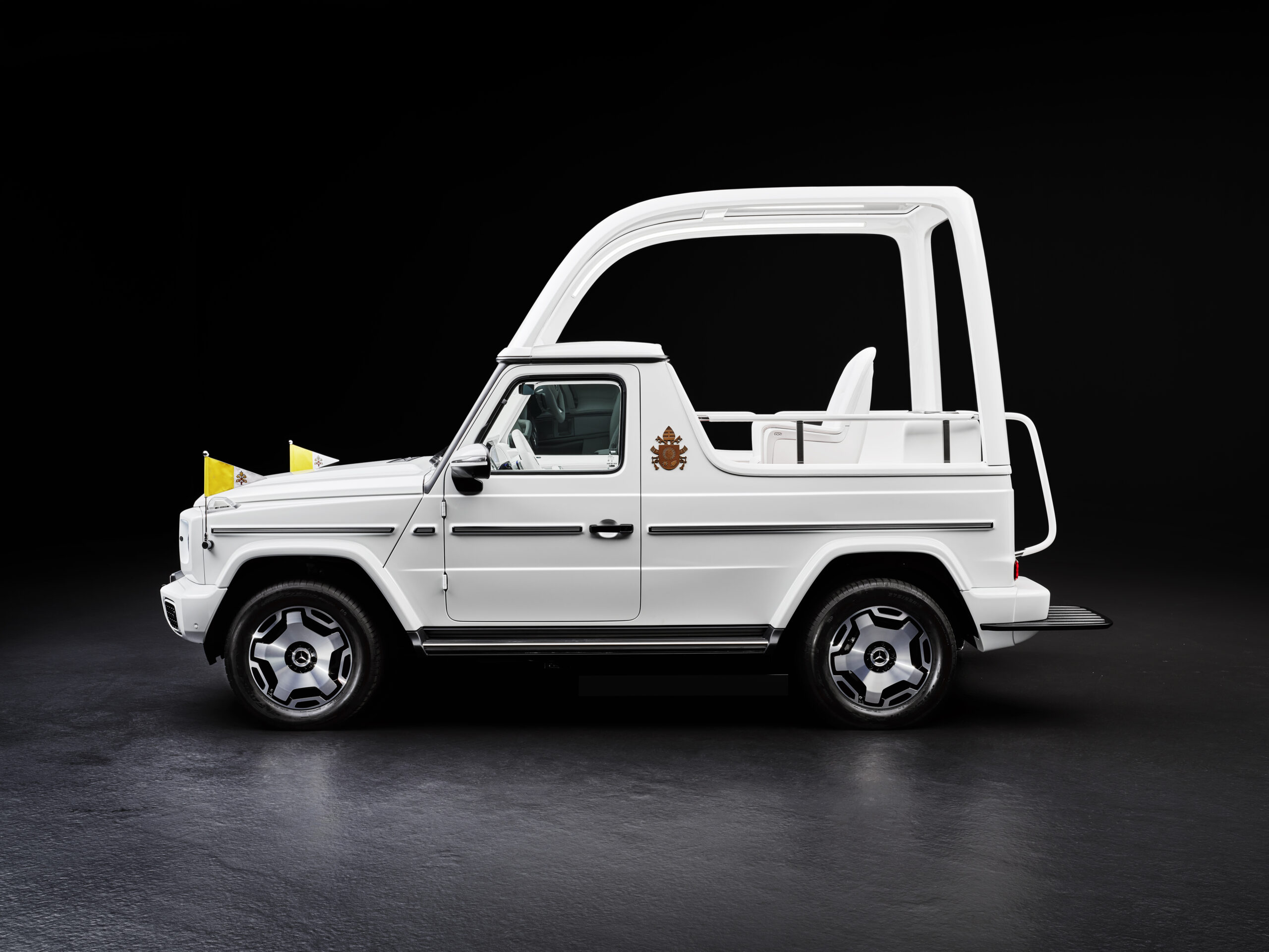 - Das offene Präsentationsfahrzeug, das sich das Oberhaupt der katholischen Kirche für den Einsatz bei freundlichem Wetter gewünscht hat, entwickelte Mercedes-Benz auf der Basis des G 500. Es ist mit einer umklappbaren Frontscheibe und Haltebügeln ausgestattet und wie schon seine Vorgängerfahrzeuge in vatikanischem Mystikweiß lackiert.