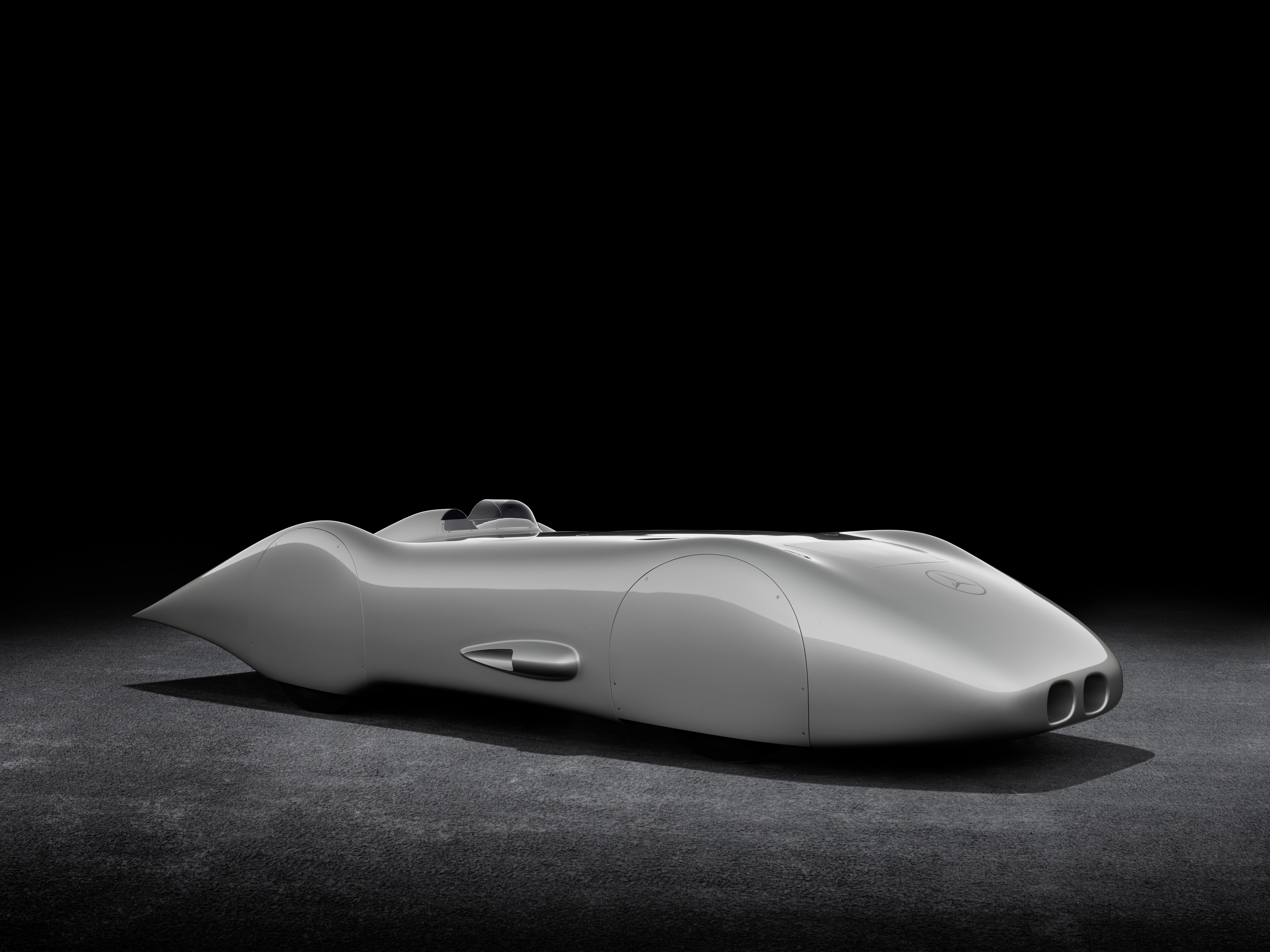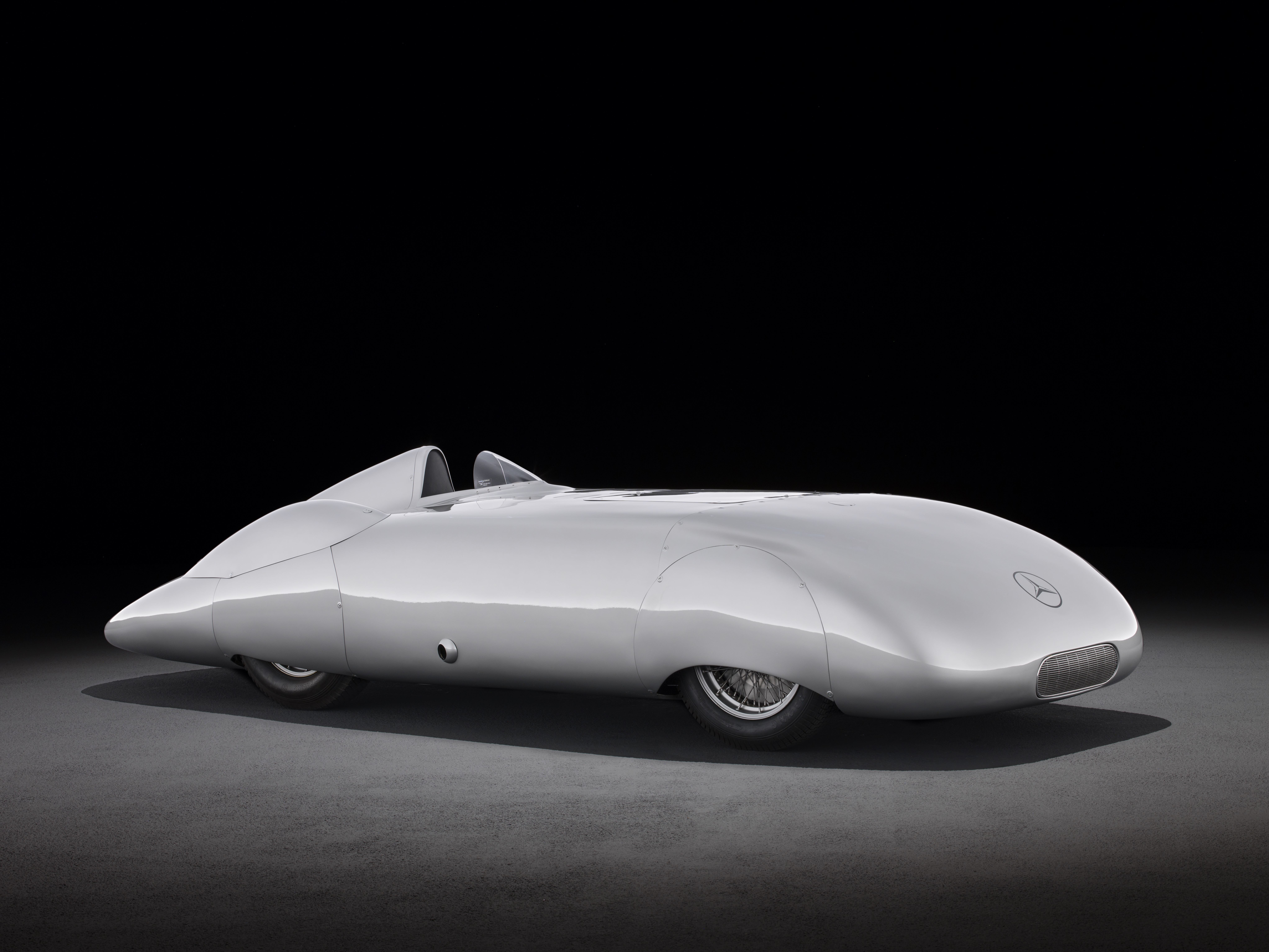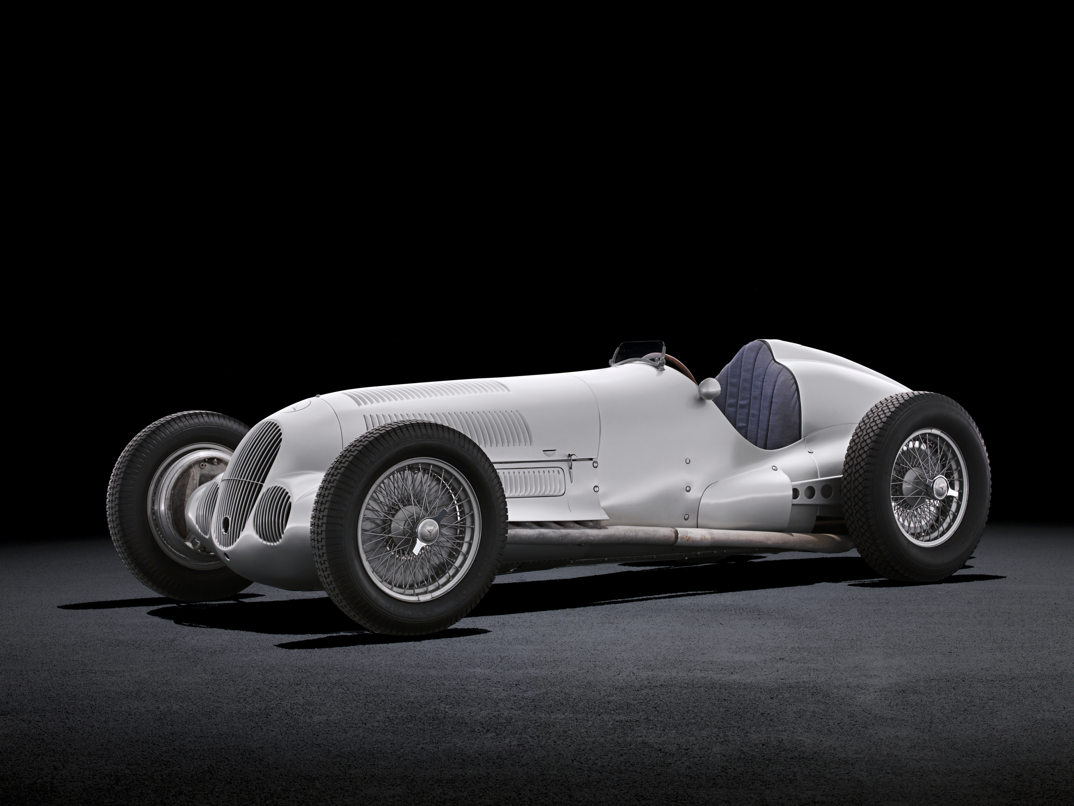 - Mercedes-Benz Zwölfzylinder-Rekordwagen W 125, 1938, originales Fahrgestell mit authentisch rekonstruierter Karosserie. Studioaufnahme, Exterieur, von links vorn. Mercedes-Benz twelve-cylinder W 125 record car, 1938, original chassis with authentically reconstructed body. Studio shot, exterior, front left.