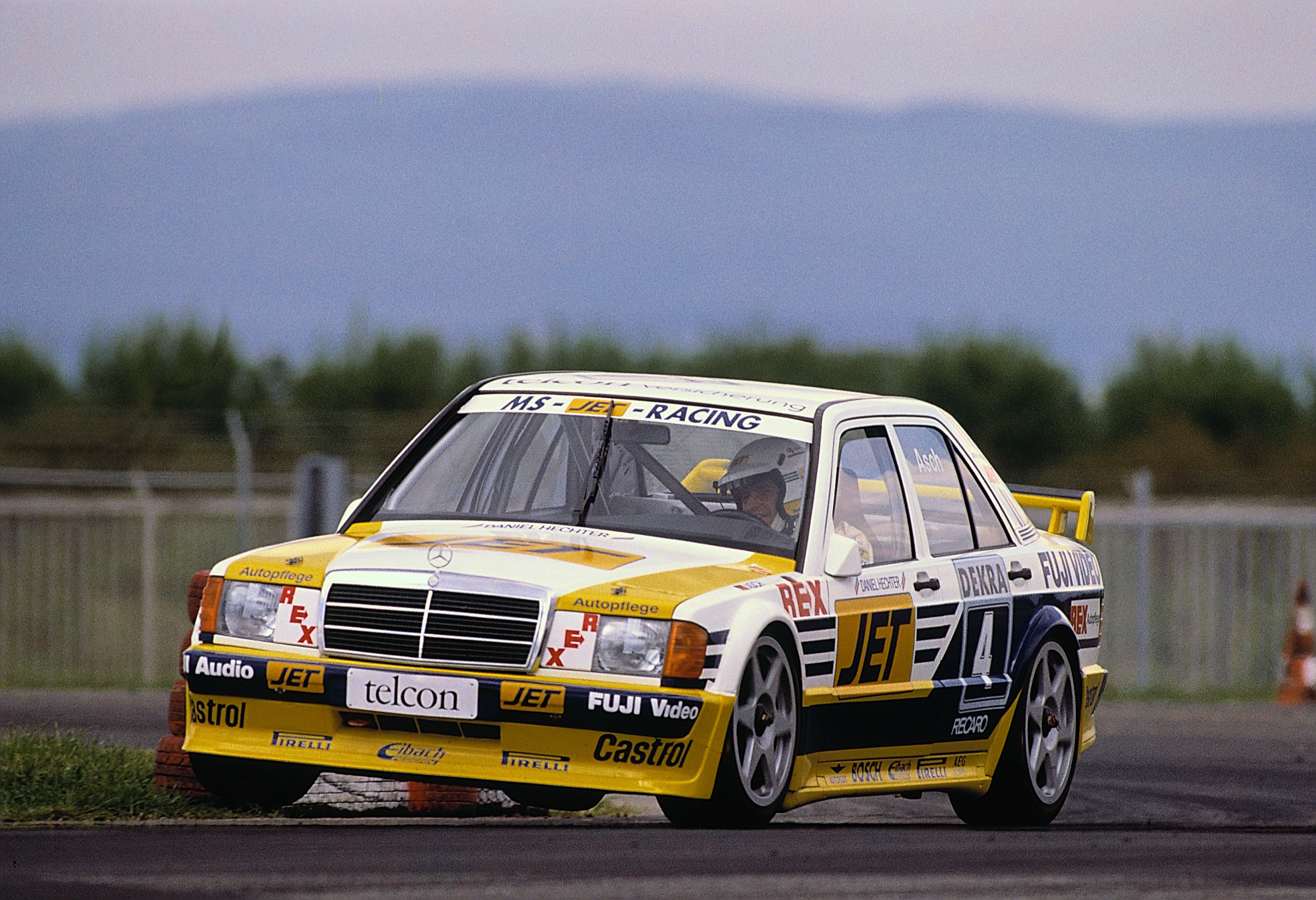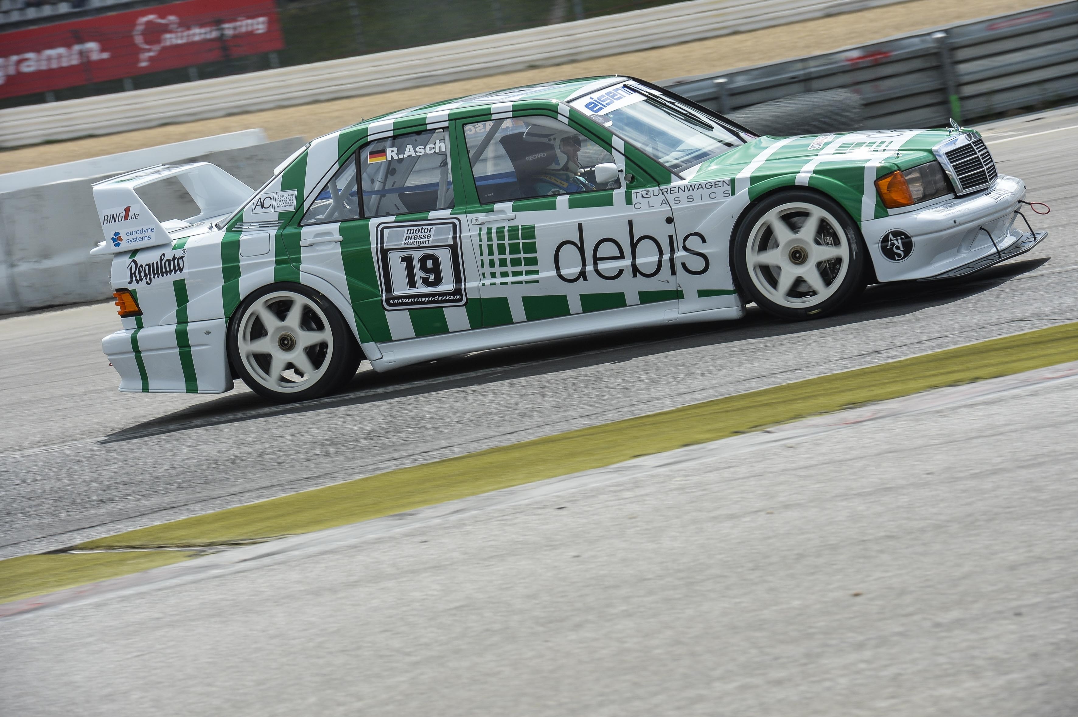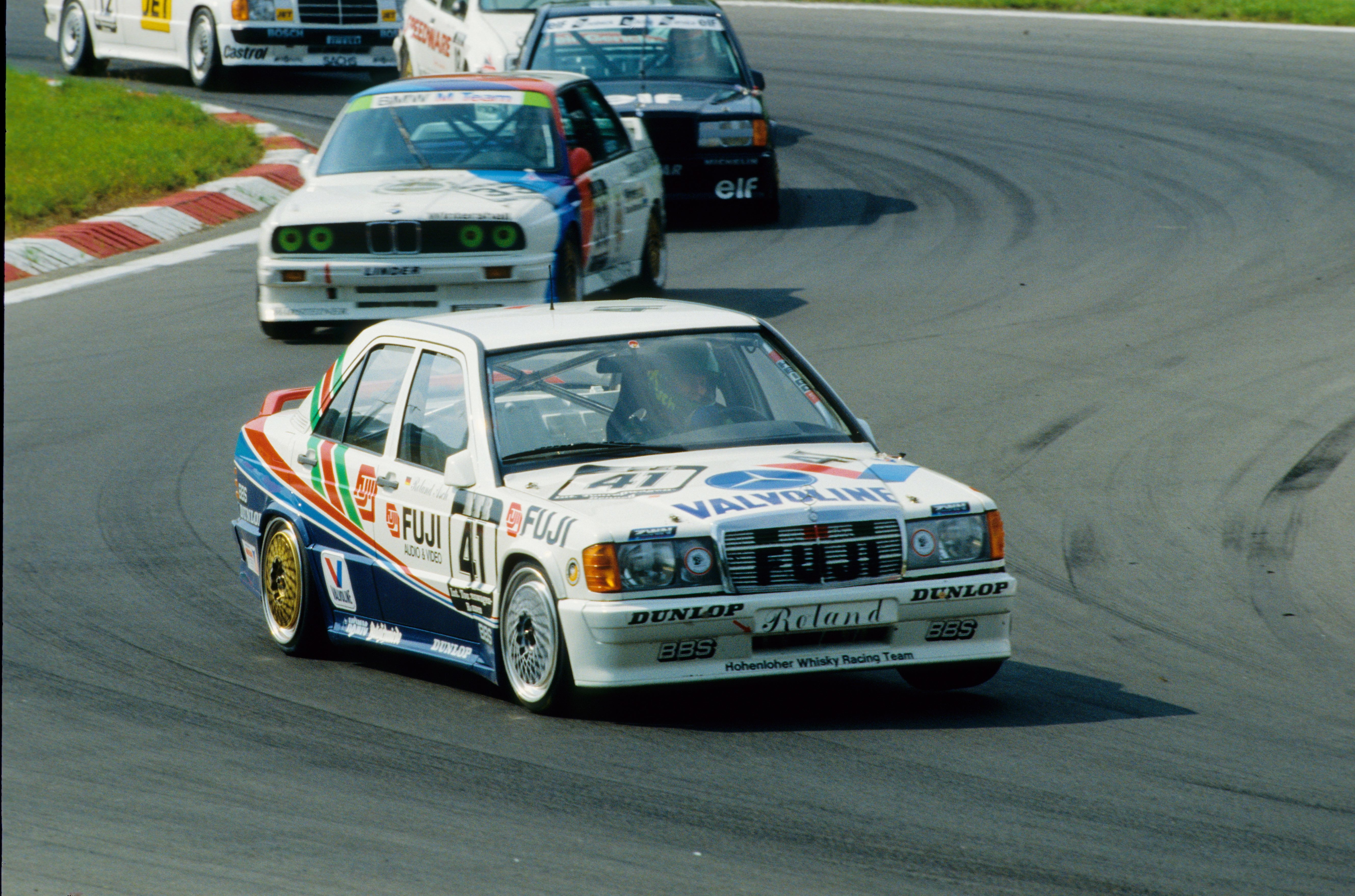 - Mercedes-Benz 190 E 2.5-16 Evolution II DTM-Tourenwagen, 1990. Fahrzeug von Roland Asch (Zweiter im 1. Lauf, Sieger im 2. Lauf) im Einladungsrennen der Deutschen Tourenwagen-Meisterschaft (DTM) in Kyalami (Südafrika) am 18. November 1990. Studioaufnahme, Exterieur, von links vorn. Mercedes-Benz 190 E 2.5-16 Evolution II DTM touring car, 1990. Vehicle driven by Roland Asch (second in 1st heat, winner in 2nd heat) in the invitation race run by the German Rally Car Championships (DTM) in Kyalami (South Africa) on 18 November, 1990. Studio shot, exterior, from front left.