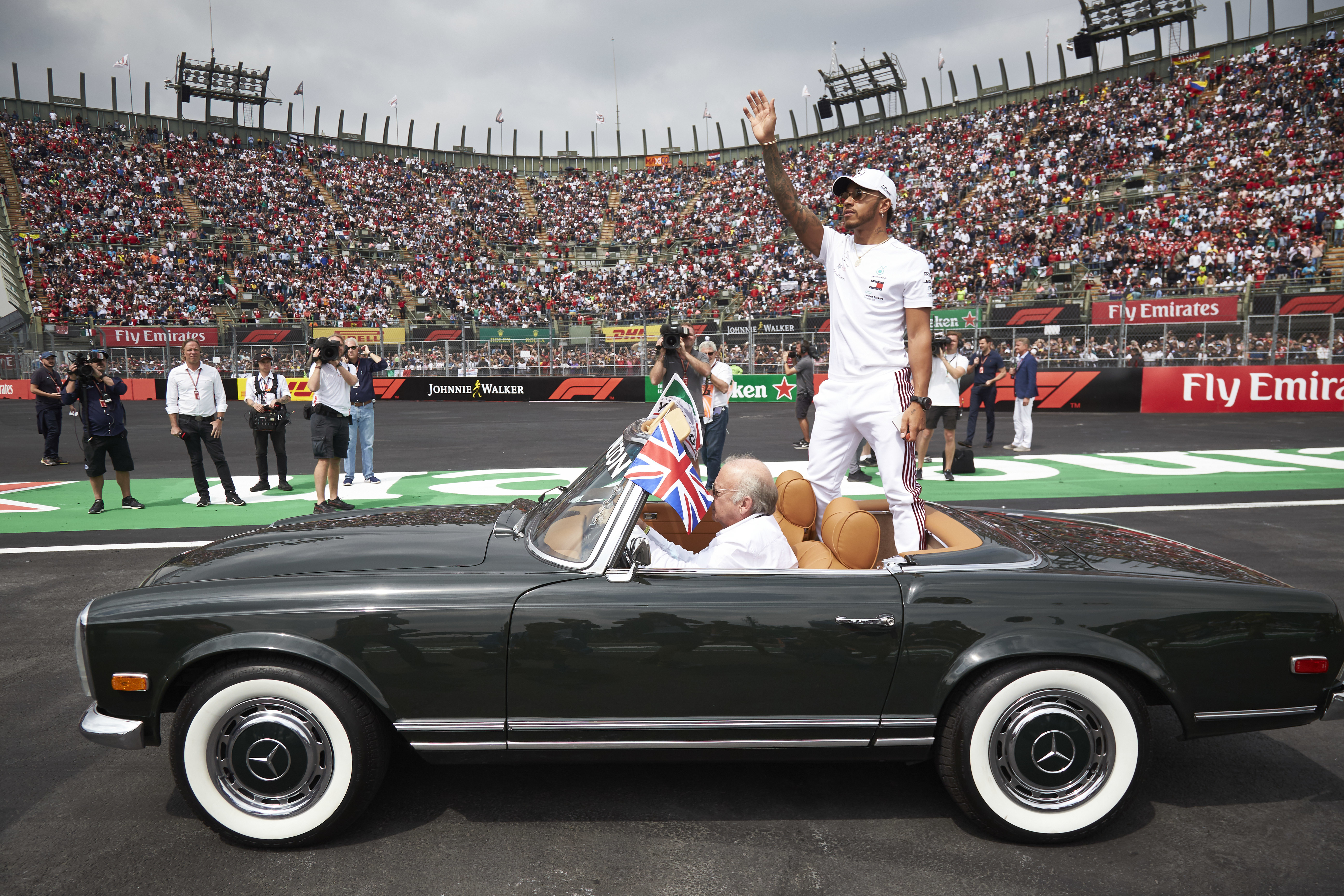 - Großer Preis von Mexiko in Mexico City, 28. Oktober 2018. Lewis Hamilton auf Mercedes F1 W09 EQ Power+ kommt auf Platz vier ins Ziel. Damit gewinnt er vorzeitig seinen fünften Weltmeister-Titel und ist einer von nur drei Rennfahrern, die mindestens fünfmal die Königsklasse des Motorsports für sich entscheiden konnten. Außer Hamilton schaffen das bisher nur Juan Manuel Fangio und Rekordweltmeister Michael Schumacher. Mexican Grand Prix, 28 October 2018. Lewis Hamilton in a Mercedes F1 W09 EQ Power+ finishes fourth. In this way, he wins his fifth World Champion title ahead of schedule and is one of only three racing drivers to win the top accolade in motorsport at least five times. Apart from Hamilton, only Juan Manuel Fangio and record world champion Michael Schumacher have managed this so far.