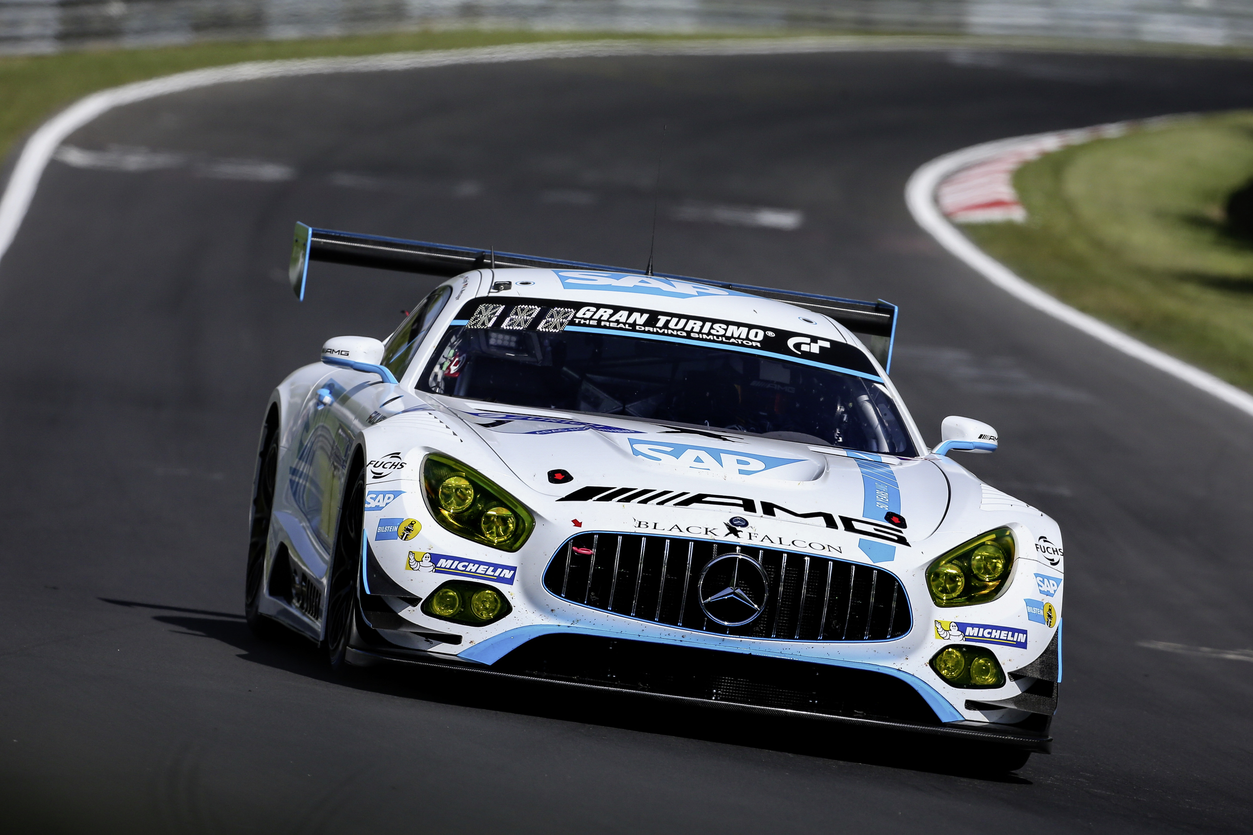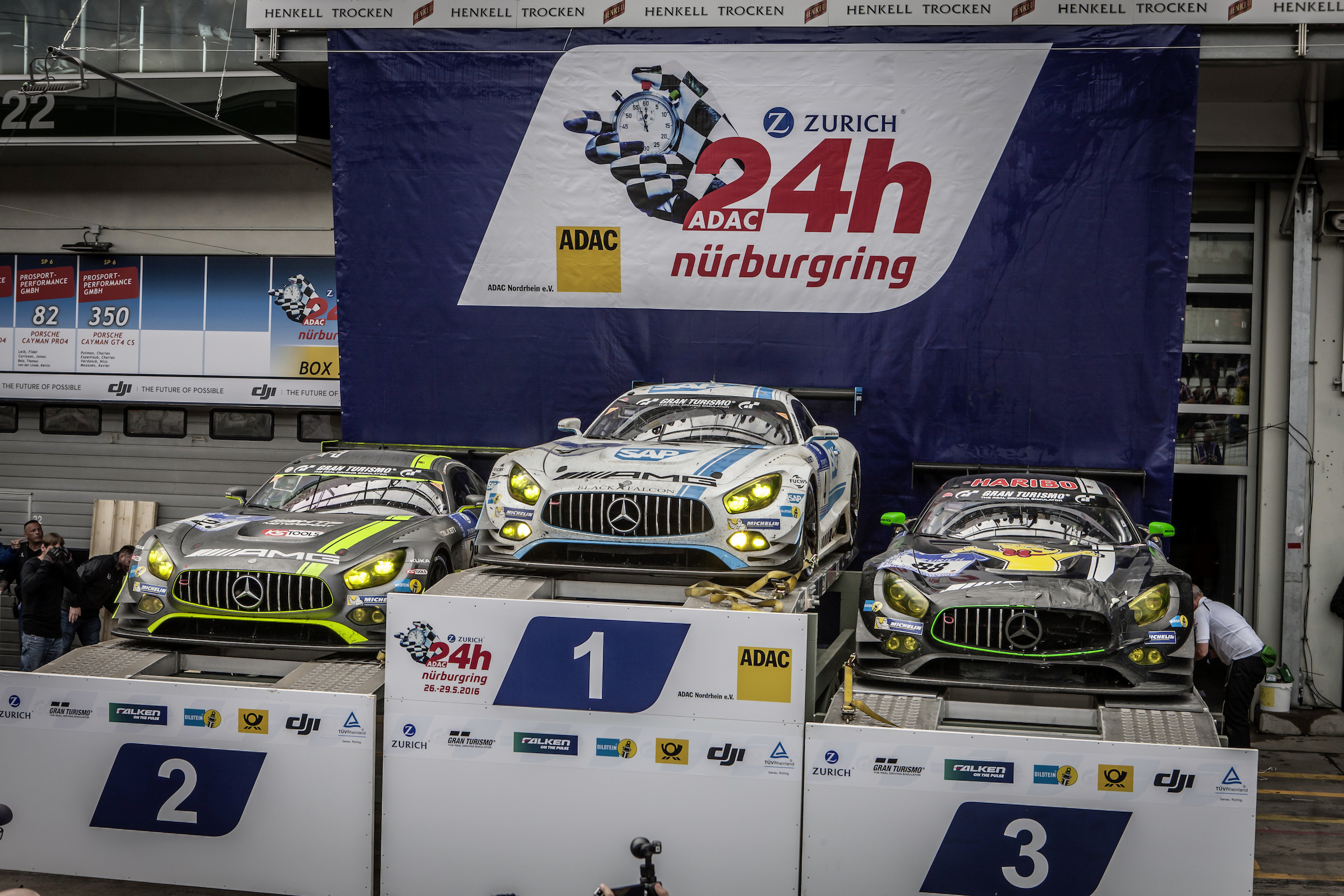 - 24 Stunden Nürburgring 2016; Auto links: : Mercedes-AMG Team HTP Motorsport, Mercedes-AMG GT3 #29 Auto Mitte: Mercedes-AMG Team BLACK FALCON, Mercedes-AMG GT3 #4 Auto rechts: HARIBO Racing Team Mercedes-AMG, Mercedes-AMG GT3 #88 Mercedes-AMG Team BLACK FALCON: Yelmer Buurman (NED), Adam Christodoulou (GBR), Maro Engel (GER), Manuel Metzger (GER) Mercedes-AMG Team BLACK FALCON: Maro Engel (GER), Thomas Jäger (GER), Dirk Müller (GER), Jan Seyffarth (GER) Mercedes-AMG Team HTP Motorsport: Dominik Baumann (AUT), Maximilian Buhk (GER), Edoardo Mortara (ITA), Edward Sandström (SWE) Mercedes-AMG Team HTP Motorsport: Nico Bastian (GER), Dominik Baumann (AUT), Christian Hohenadel (GER), Stefan Mücke (GER) HARIBO Racing Team Mercedes-AMG: Uwe Alzen (GER), Lance David Arnold (GER), Maximilian Götz (GER), Renger van der Zande (NED) Mercedes-AMG GT 3 (C 190) with starting number 4 (centre), winner of the 44th ADAC Zurich Nürburgring 24-hour race.