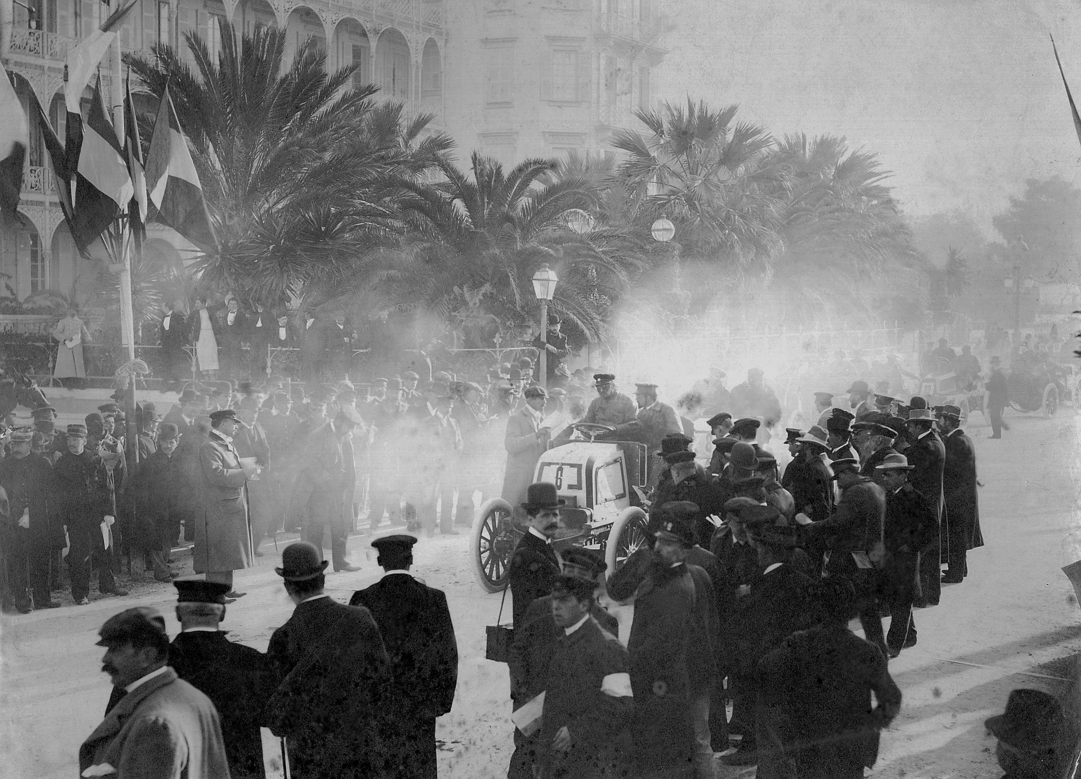 - Woche von Nizza im März 1900, Start zum Rennen Nizza–Marseille. Ein Daimler 23 PS „Phönix“-Rennwagen auf der Promenade des Anglais vor dem Hotel des Anglais. Nice Week in March 1900, start of the Nice–Marseilles race. A Daimler 23 HP “Phoenix” racing car outside the Hotel des Anglais on the Promenade des Anglais.