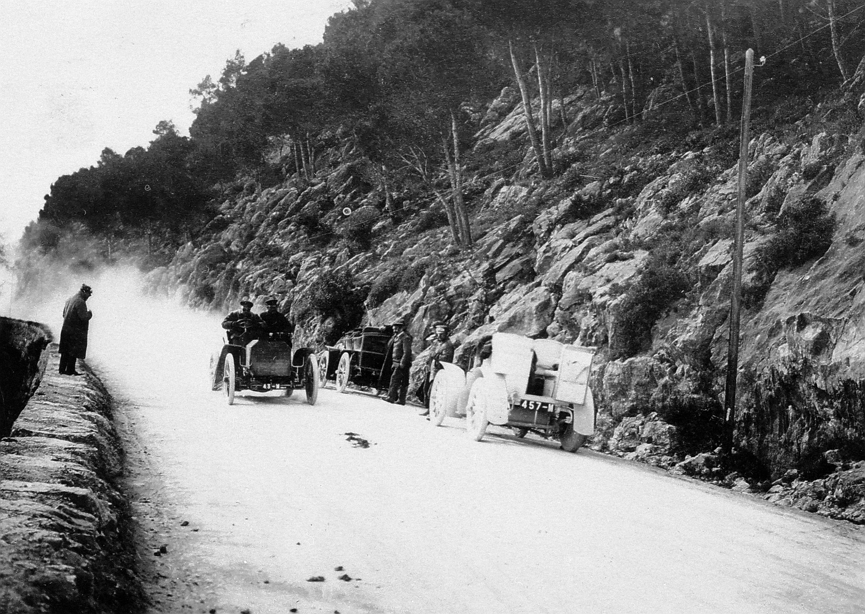 - Der Mercedes-Simplex 40 PS von Henri de Rothschild (alias „Dr. Pascal“) bei der Erprobung auf der Strecke von Nizza nach La Turbie im März 1902. The Mercedes-Simplex 40 HP owned by Henri de Rothschild (alias “Dr. Pascal”) during testing on the stretch from Nice to La Turbie in March 1902.
