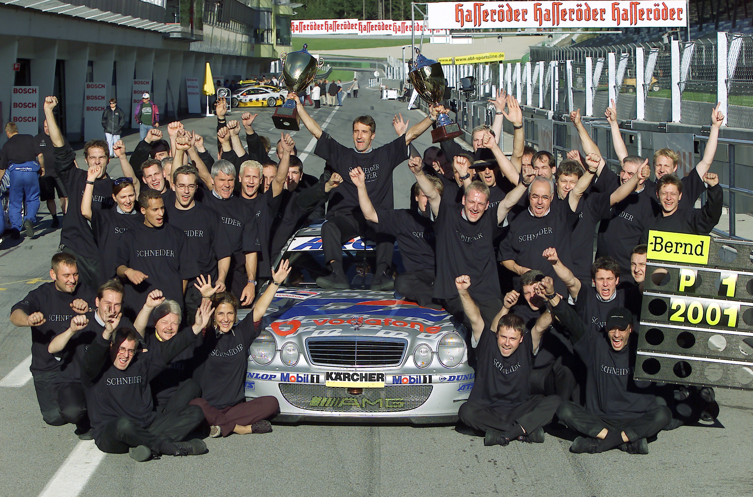 - A1-Ring in Spielberg/Österreich, 9. September 2001. Bernd Schneider im AMG-Mercedes CLK DTM-Tourenwagen (C 208) sichert sich mit seinem Sieg beim achten Lauf der Deutschen Tourenwagen Masters 2001 erneut den Meistertitel. Er ist damit der erste Fahrer in der DTM, dem die Titelverteidigung gelingt. A1-Ring in Spielberg/Austria, 9 September 2001. Bernd Schneider in the AMG-Mercedes CLK DTM touring car (C 208) again secures the championship title with his victory in the eighth race of the German Touring Car Masters 2001. This makes him the first driver in the DTM to defend his title successfully.