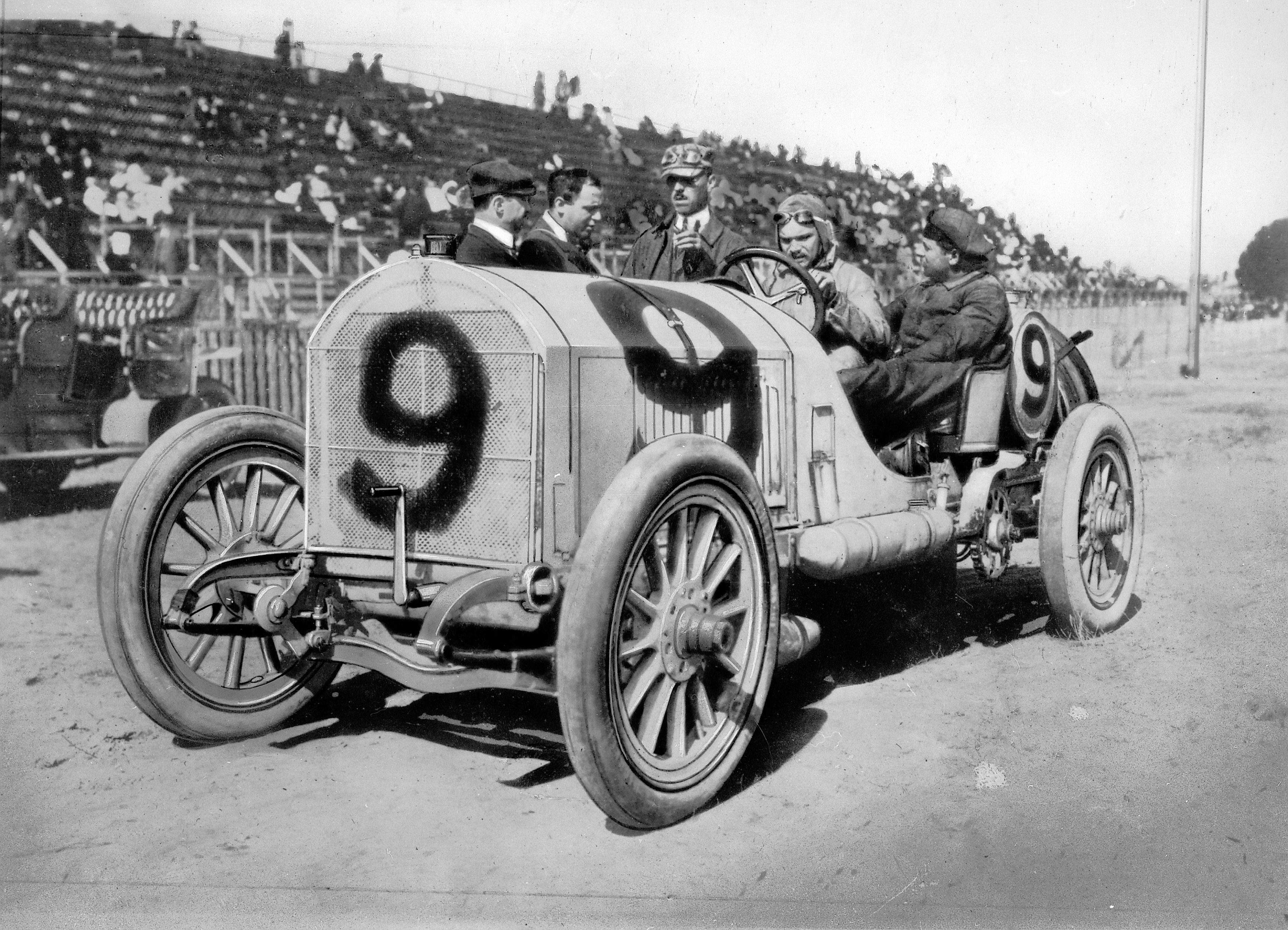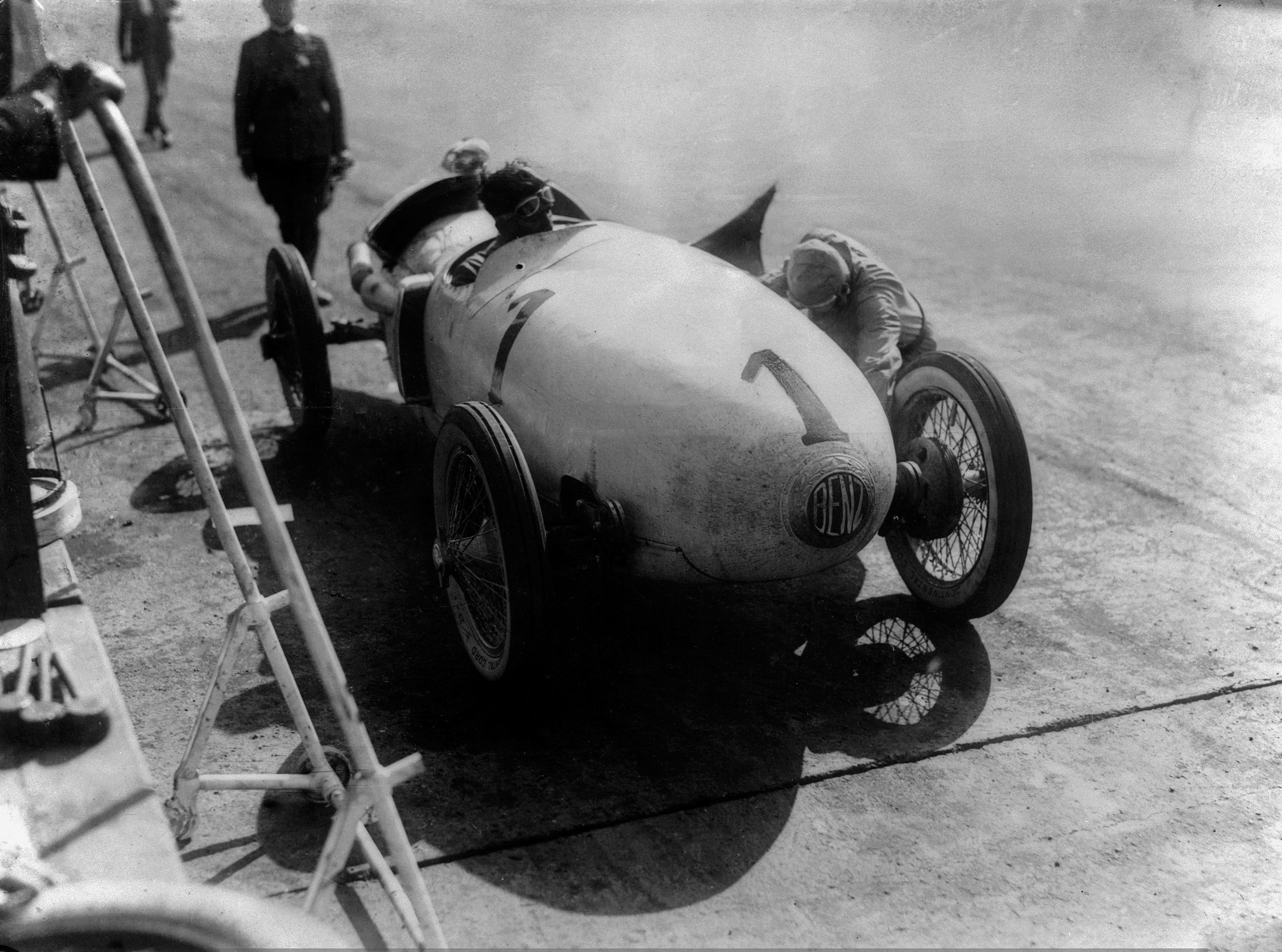 - Großer Preis von Europa in Monza, 9. September 1923. Der innovative Benz Tropfenwagen mit 2-Liter-Motor bewältigt die Renndistanz von 800 Kilometern äußerst zuverlässig. Fernando Minoia (Startnummer 1) und Franz Hörner belegen mit ihm die Plätze vier und fünf. Italian Grand Prix, Monza, 9 September 1923. The innovative Benz teardrop car (“Tropfenwagen”) with its 2-litre engine is extremely reliable over the 800-kilometre race distance. Fernando Minoia (starting number 1) and Franz Hörner take places four and five with these vehicles.
