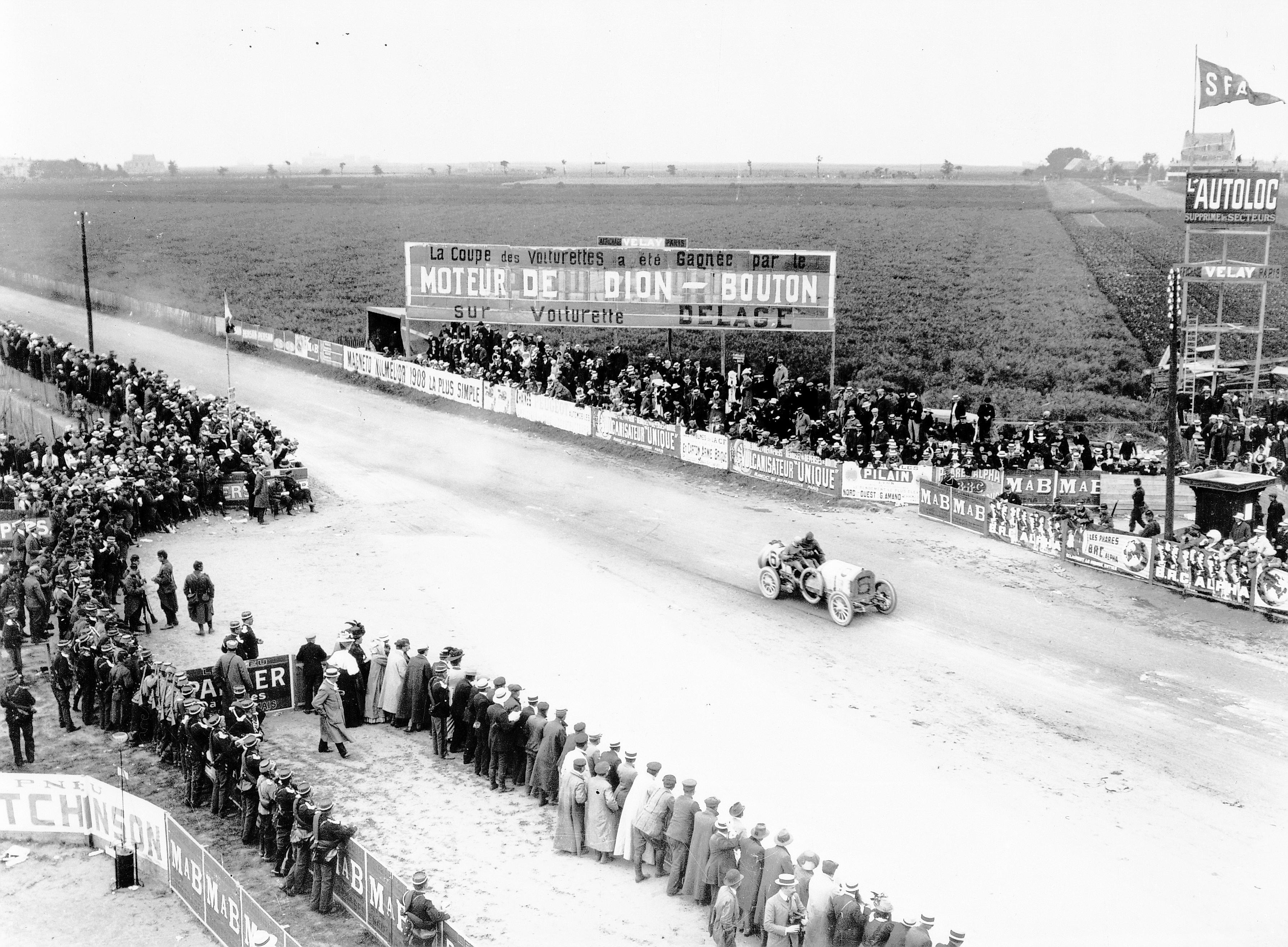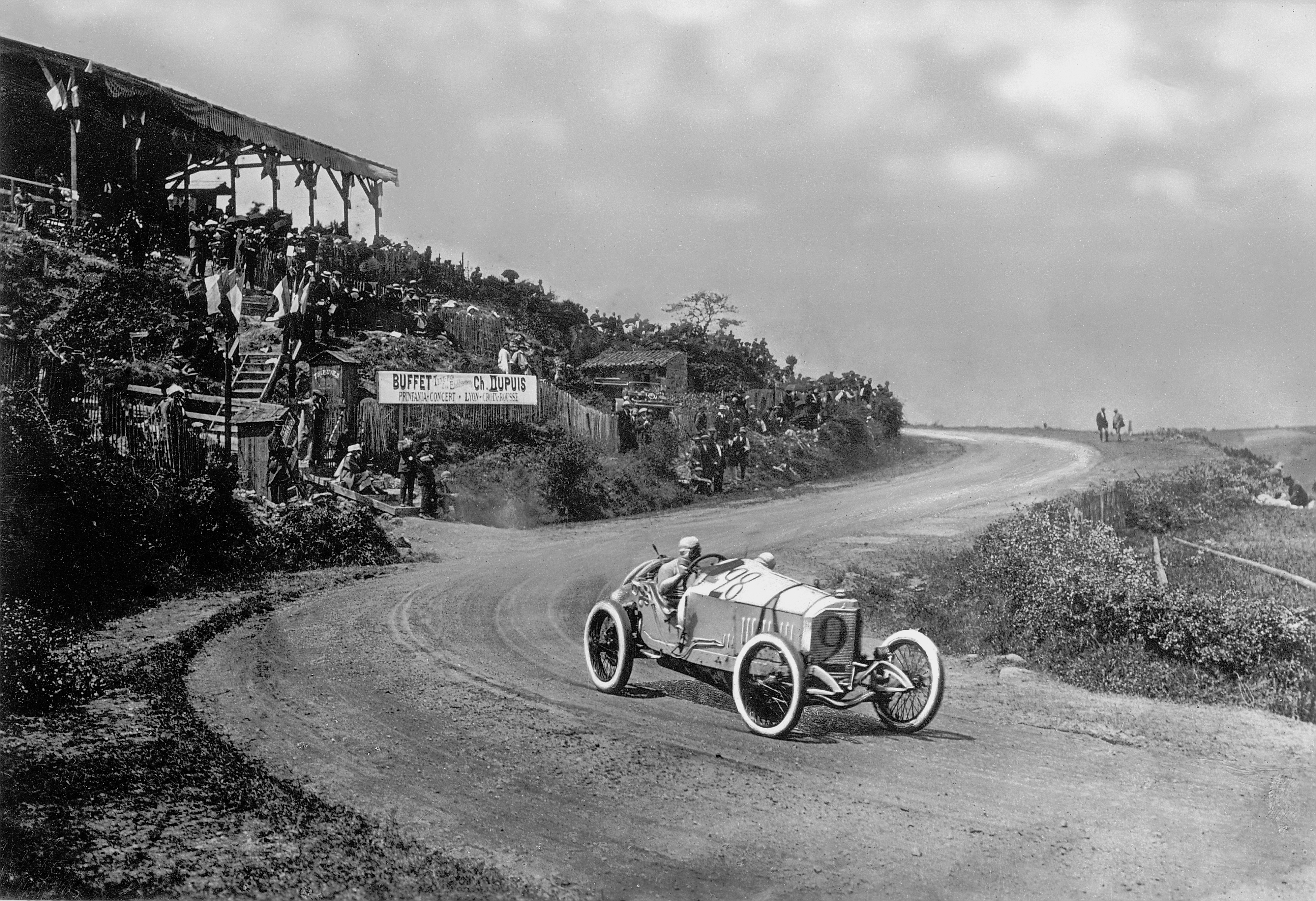 - Großer Preis von Frankreich bei Lyon, 4. Juli 1914. Im Bild der Mercedes Grand-Prix-Rennwagen des späteren Sieger Christian Lautenschlager (Startnummer 28) bei der Einfahrt in die Piège de la Mort („Todesfalle“), rund drei Kilometer vor Start und Ziel. Die Daimler-Motoren-Gesellschaft erzielt auf Mercedes Grand-Prix-Rennwagen einen Dreifachsieg, in der Reihenfolge Christian Lautenschlager, Louis Wagner und Otto Salzer. French Grand Prix near Lyon on 4 July 1914. The Mercedes Grand Prix racing car of the eventual winner, Christian Lautenschlager (start number 28), entering the Piège de la Mort (“Death Trap”), around three kilometres from the starting/finishing line. Daimler-Motoren-Gesellschaft achieved a triple victory with its Mercedes Grand Prix racing cars, in the sequence Christian Lautenschlager, Louis Wagner and Otto Salzer.
