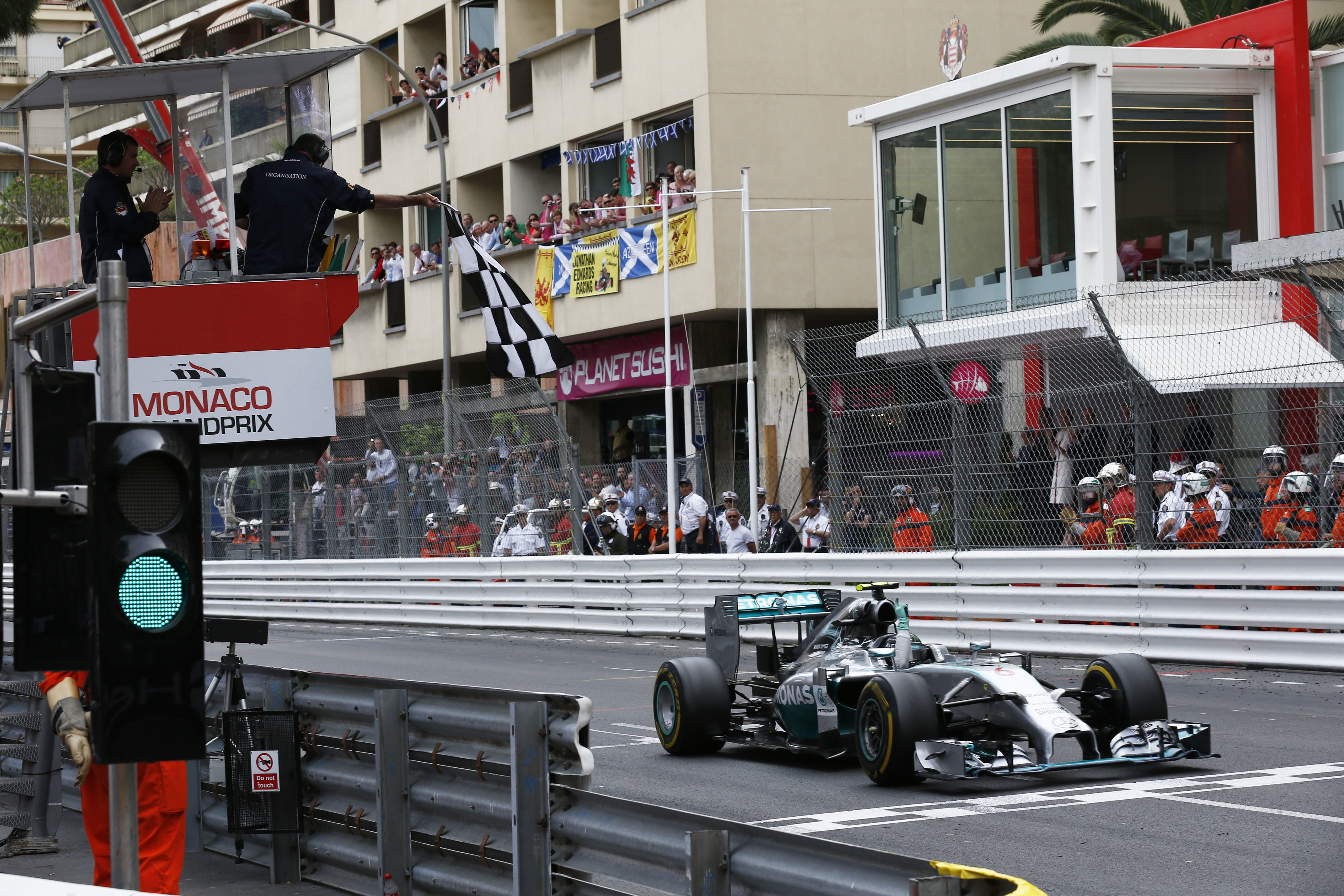 - Großer Preis von Monaco, 25. Mai 2014. Mit dem Formel-1-Sieg im Fürstentum geht für Nico Rosberg ein Traum in Erfüllung. Der in Monaco aufgewachsene Deutsche gewinnt das Rennen auf Mercedes F1 W05 Hybrid vor Lewis Hamilton. Für die beiden Silberpfeilpiloten ist dies der fünfte Doppelsieg in Folge. Monaco Grand Prix, 25 May 2014. A dream comes true for Nico Rosberg with his Formula 1 victory in the Principality of Monaco. The German, who grew up in Monaco, wins the race in a Mercedes F1 W05 hybrid ahead of Lewis Hamilton. This is the fifth double victory in succession for the two Silver Arrow drivers.
