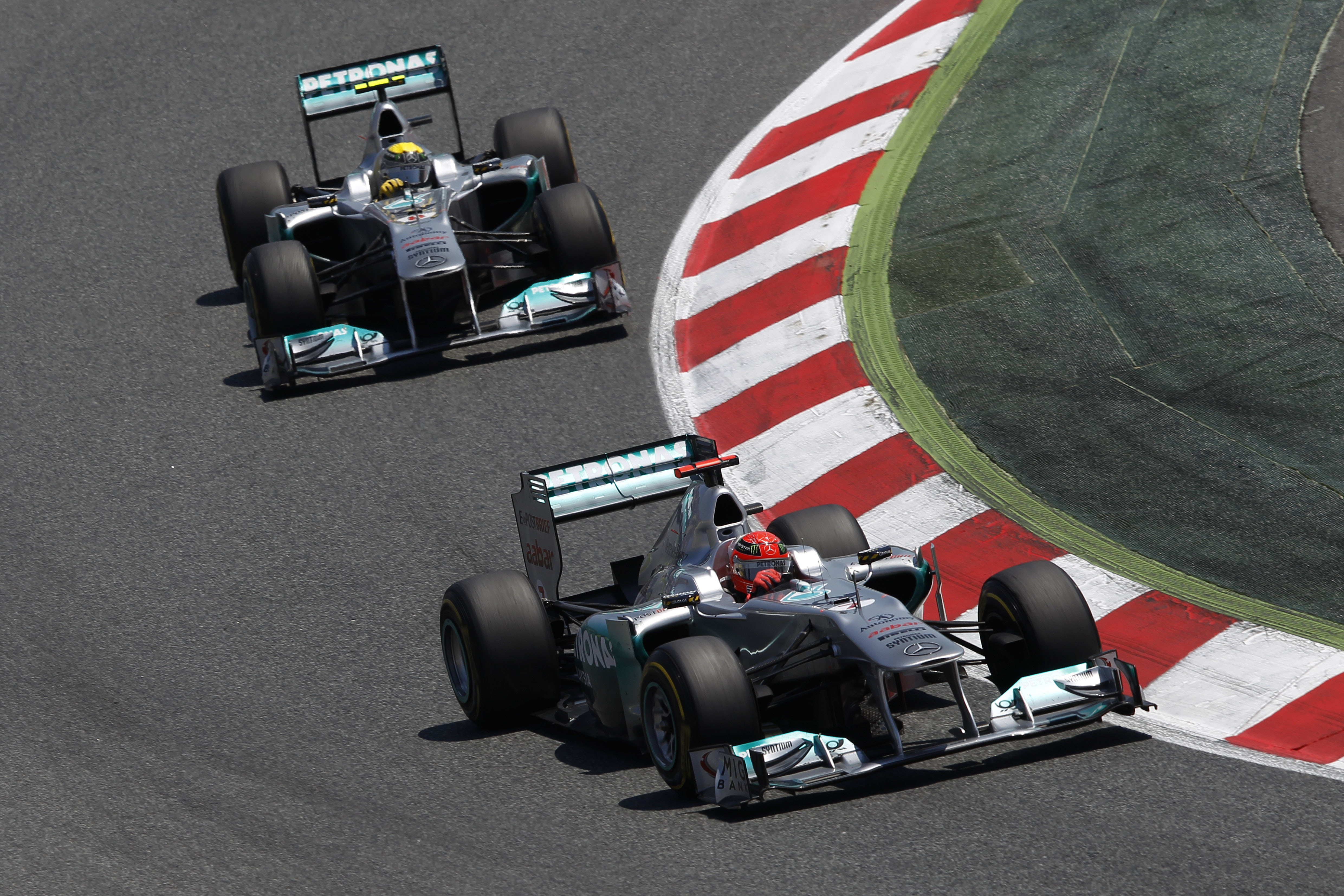 - Großer Preis von Spanien in Barcelona, 22. Mai 2011. Michael Schumacher (Startnummer 7) und Nico Rosberg (Startnummer 8) belegen auf MGP F1 W02 die Plätze sechs und sieben. Spanish Grand Prix in Barcelona, 22 May 2011. Michael Schumacher (starting number 7) and Nico Rosberg (starting number 8) are sixth and seventh in their MGP F1 W02s.