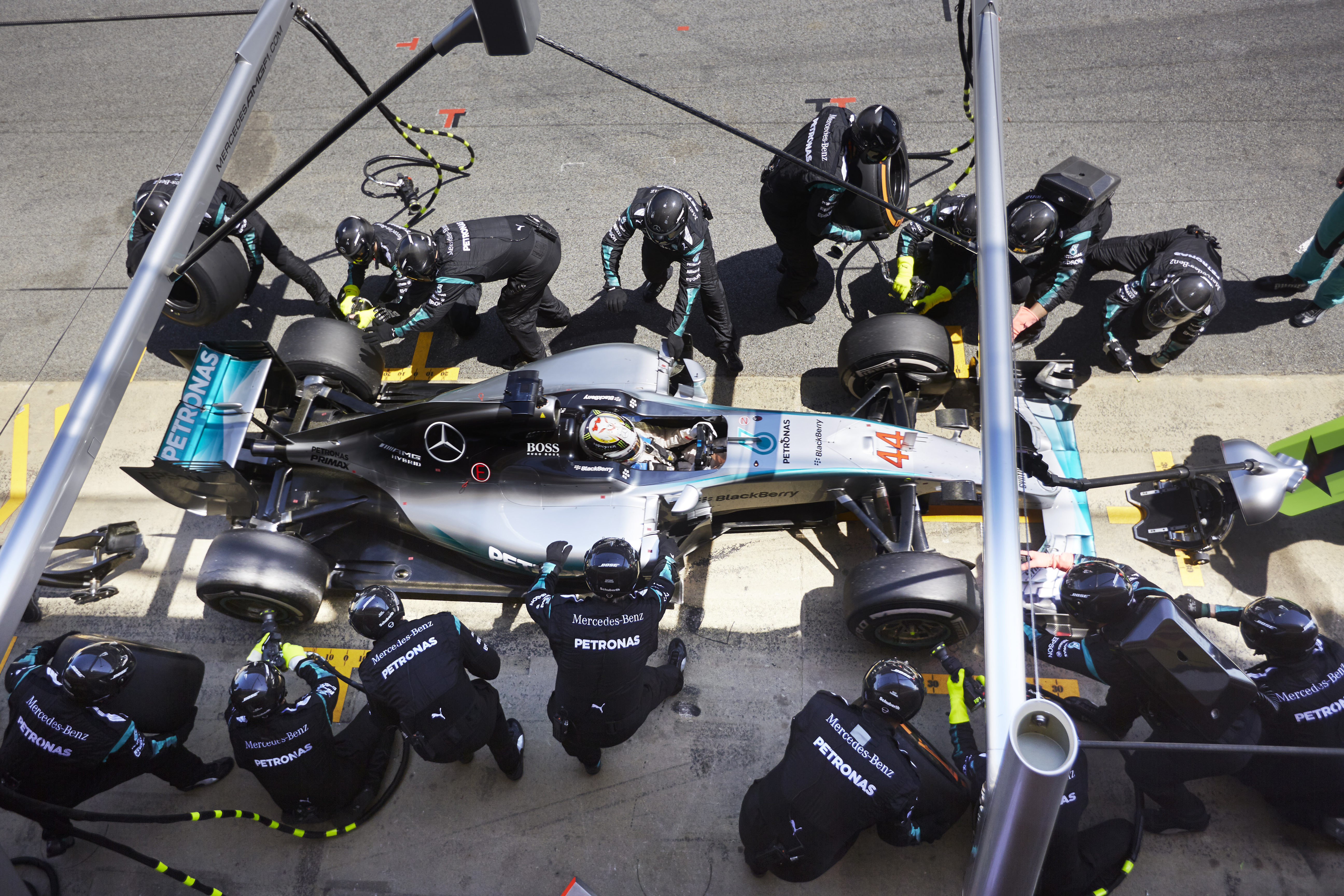 - Großer Preis von Spanien in Barcelona, 10. Mai 2015. Boxenstopp von Lewis Hamilton. Das Rennen endet mit dem dritten Doppelsieg der Saison für die Silberpfeile, und am Ende der Saison sichert sich der Brite erneut den Weltmeistertitel – seinen dritten nach 2008 und 2014. Spanish Grand Prix in Barcelona, 10 May 2015. Lewis Hamilton’s pit stop. The race ends with the third double victory of the season for the Silver Arrows, and at the end of the season the Brit once again secures the World Championship title – his third after 2008 and 2014.