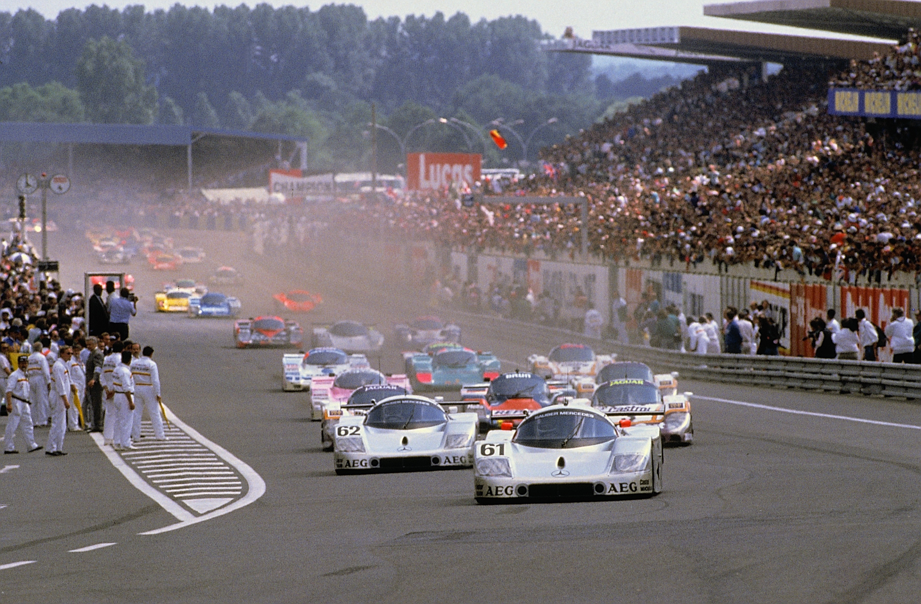- 24 Stunden von Le Mans, 10. – 11.06.1989. Sauber-Mercedes Gruppe-C-Rennsportwagen C 9. Startnummer 61 – das Fahrerteam Mauro Baldi / Kenny Acheson / Gianfranco Brancatelli bele gen den zweiten Platz. Startnummer 62 – das Fahrerteam Jean-Louis Schlesser / Jean-Pierre Jabouille / Alain Cudini belegen den fünften Platz. 24-hour Le Mans race, 10 and 11 June 1989: Thirty-seven years after the last and until then only success in this legendary endurance race, the Sauber-Mercedes C 9 Silver Arrows of Jochen Mass/Stanley Dickens/Manuel Reuter and Mauro Baldi/Kenny Acheson/Gianfranco Brancatelli achieve a double victory.
