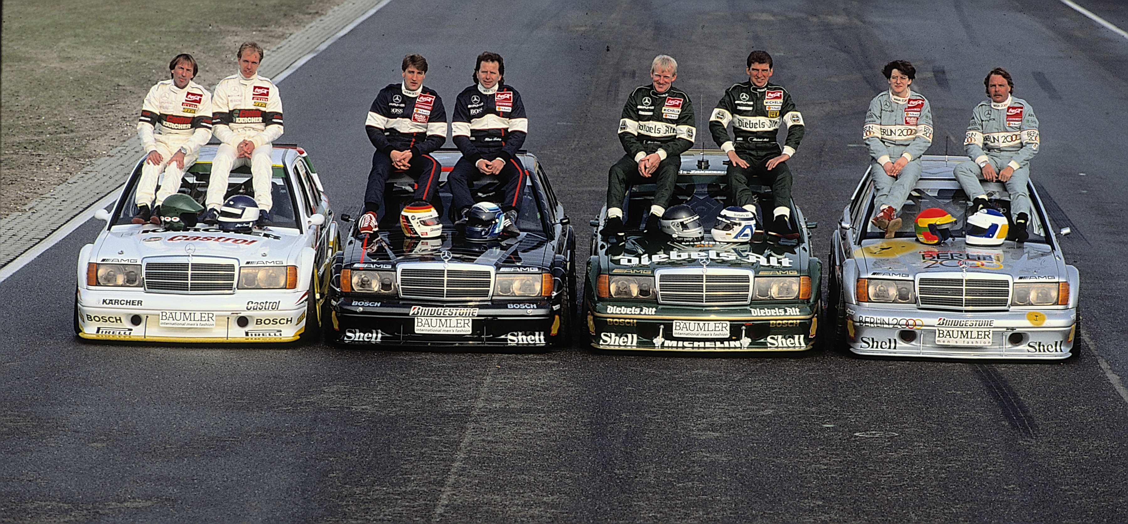 - Die Mercedes-Benz Teams in der Saison 1992 der Deutschen Tourenwagen-Meisterschaft (DTM): Klaus Ludwig gewinnt, erstmals für Mercedes-Benz, den Fahrertitel der DTM. Den zweiten und dritten Platz belegen Kurt Thiim und Bernd Schneider, beide ebenfalls auf Mercedes-Benz 190 E 2.5-16 Evolution II (W 201). Die DTM-Fahrer auf dem Bild von links nach rechts: Jacques Laffite, Jörg van Ommen, Bernd Schneider, Klaus Ludwig, Kurt Thiim, Roland Asch, Ellen Lohr und Keke Rosberg. The Mercedes-Benz teams in the 1992 season of the German Touring Car Championship (DTM): Klaus Ludwig wins the DTM driver’s title for the first time for Mercedes-Benz. Second and third places go to Kurt Thiim and Bernd Schneider, both also in Mercedes-Benz 190 E 2.5-16 Evolution II (W 201). The DTM drivers from left to right: Jacques Laffite, Jörg van Ommen, Bernd Schneider, Klaus Ludwig, Kurt Thiim, Roland Asch, Ellen Lohr and Keke Rosberg.