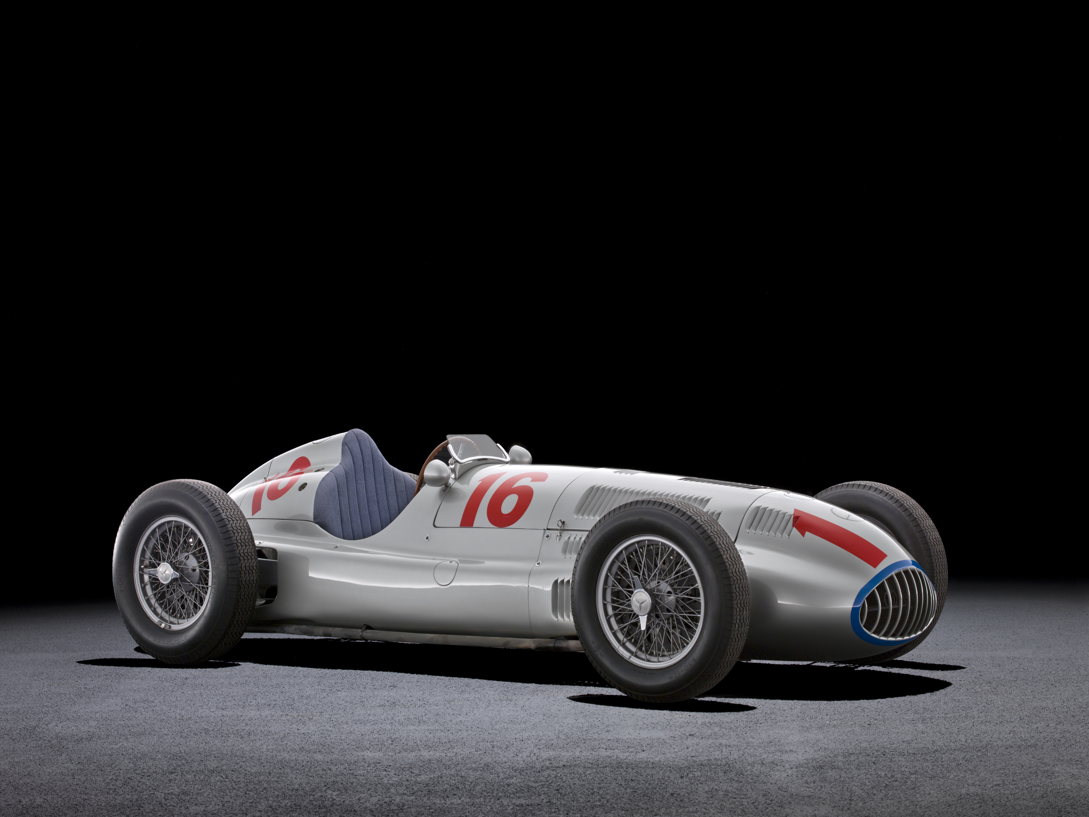 - Mercedes-Benz Formel-1-Rennwagen W 196 R mit freistehenden Rädern, 1955. Studioaufnahme, Exterieur, von links vorn. Mercedes-Benz Formula 1 racing car W 196 R with exposed wheels, 1955. Studio shot, exterior, from front left.