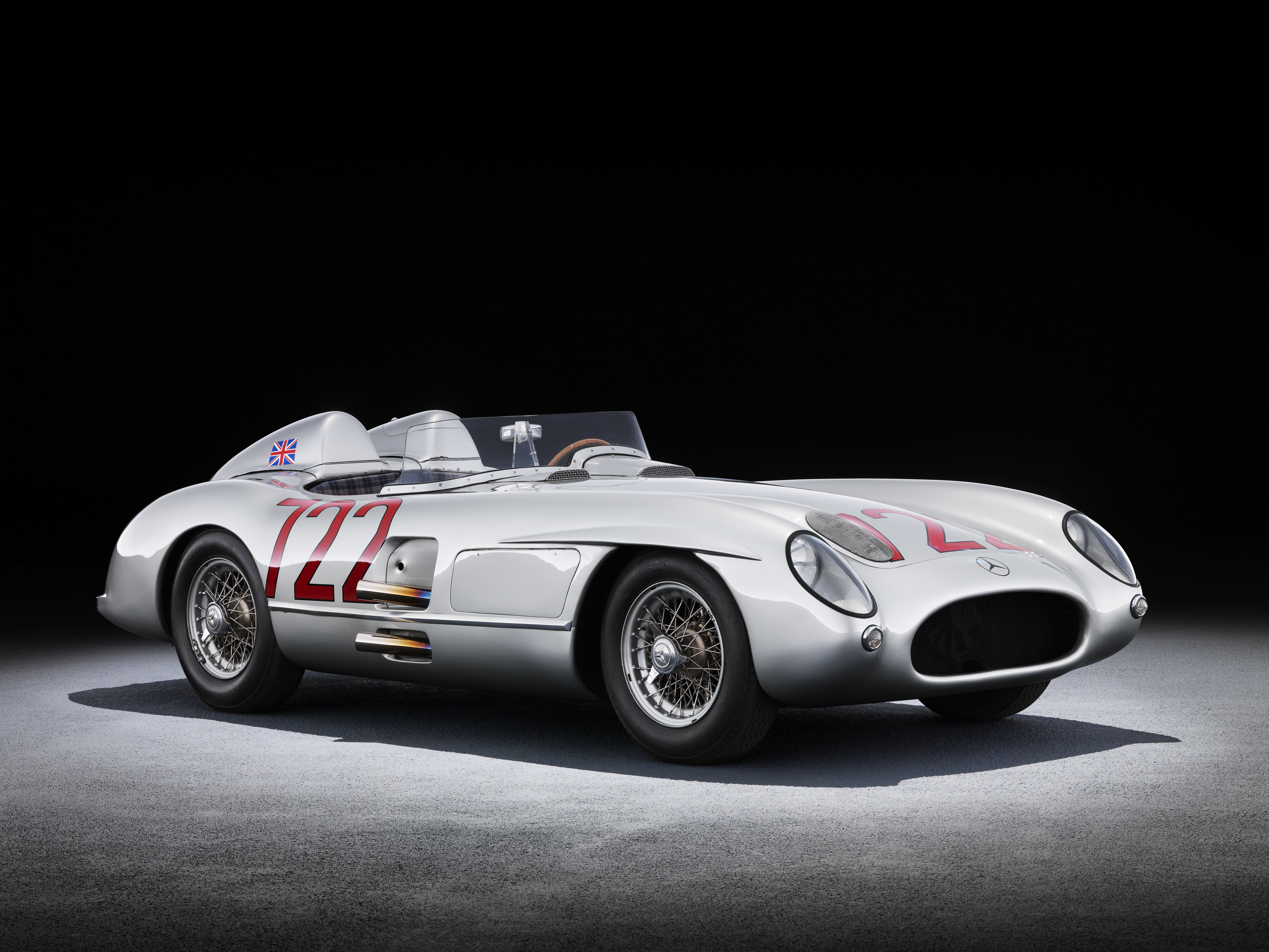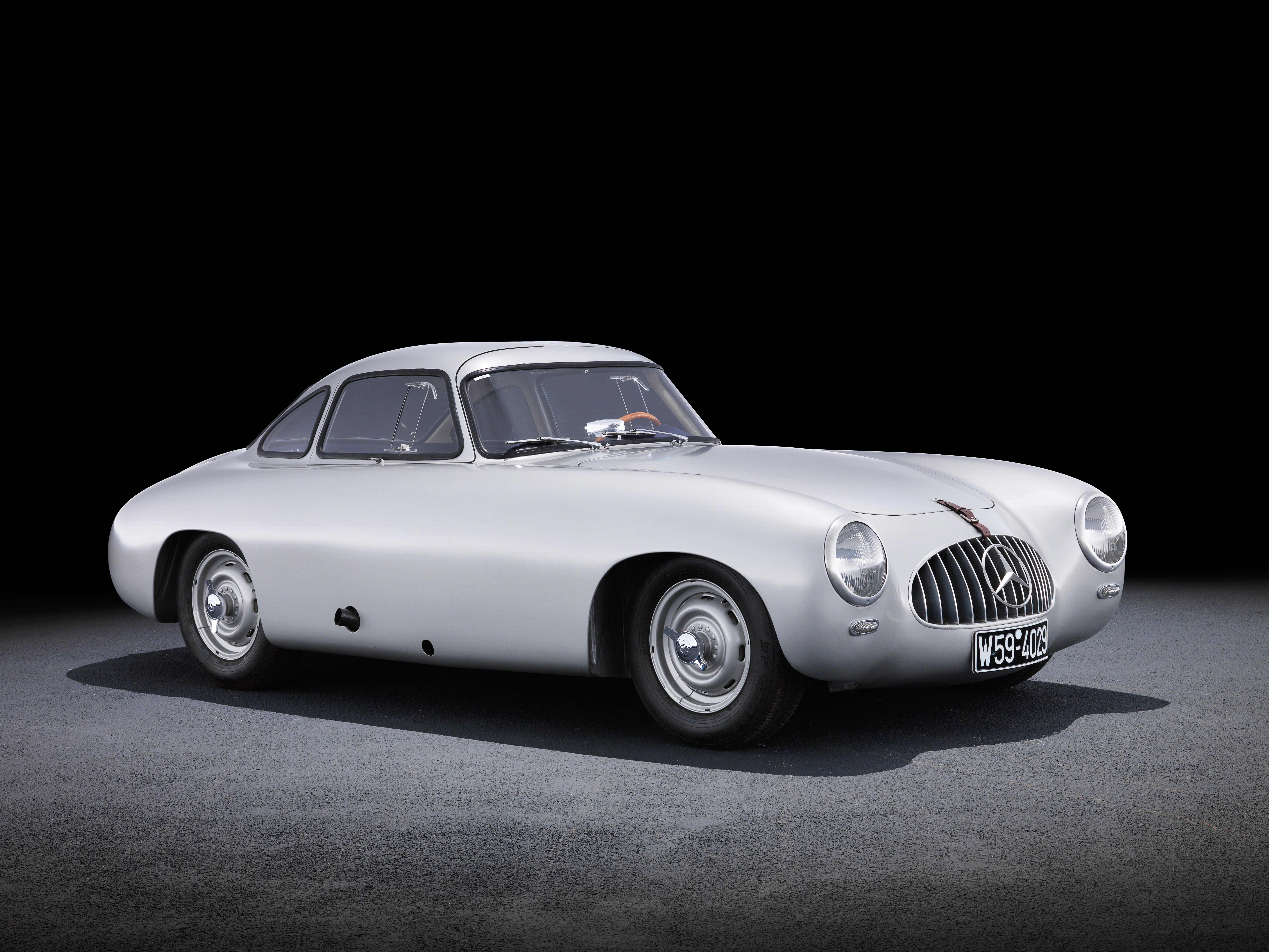 - Mercedes-Benz 300 SL „Gullwing“ (W 198), 1955. Auf dem 300 SL „Gullwing“ mit der Startnummer 417 (Startzeit 4:17 Uhr) siegen John Cooper Fitch und Kurt Gessl bei der Mille Miglia 1955 in der Klasse der GT über 1,3 Liter Hubraum und belegen den fünften Platz im Gesamtklassement. Studioaufnahme, Exterieur, von links vorn. Mercedes-Benz 300 SL “Gullwing” (W 198), 1955. John Cooper Fitch and Kurt Gessl win the Mille Miglia 1955 in the GT class over 1.3 litres in the 300 SL “Gullwing”, starting number 417 (start time 4:17 a.m.) and take fifth place in the overall classification. View into the cockpit.