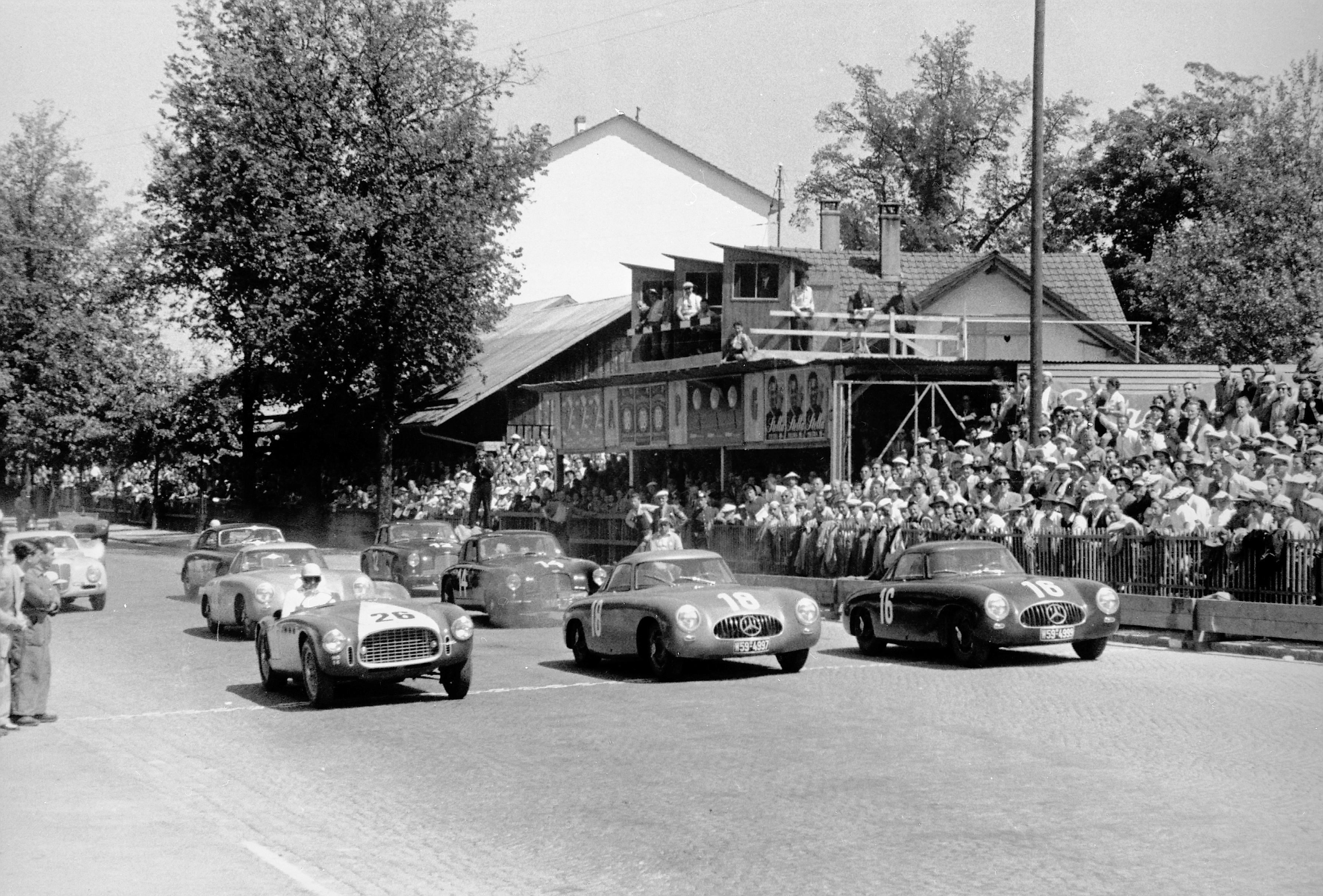 Preis von Bern, 18. Mai 1952, Startszene. Dreifachsieg der Sportwagen für Mercedes-Benz. In der ersten Reihe auf Mercedes-Benz 300 SL Rennsportwagen (W 194): Rudolf Caracciola (Startnummer 16), der spätere Sieger Karl Kling (Startnummer 18) sowie Willy Peter Daetwyler (Ferrari 4102, Startnummer 26). Hermann Lang (Startnummer 20) erreicht aus der zweiten Startreihe den zweiten Platz, ebenfalls auf 300 SL Rennsportwagen. Rudolf Caracciola beendet nach einem Unfall in diesem Rennen seine Fahrerkarriere.