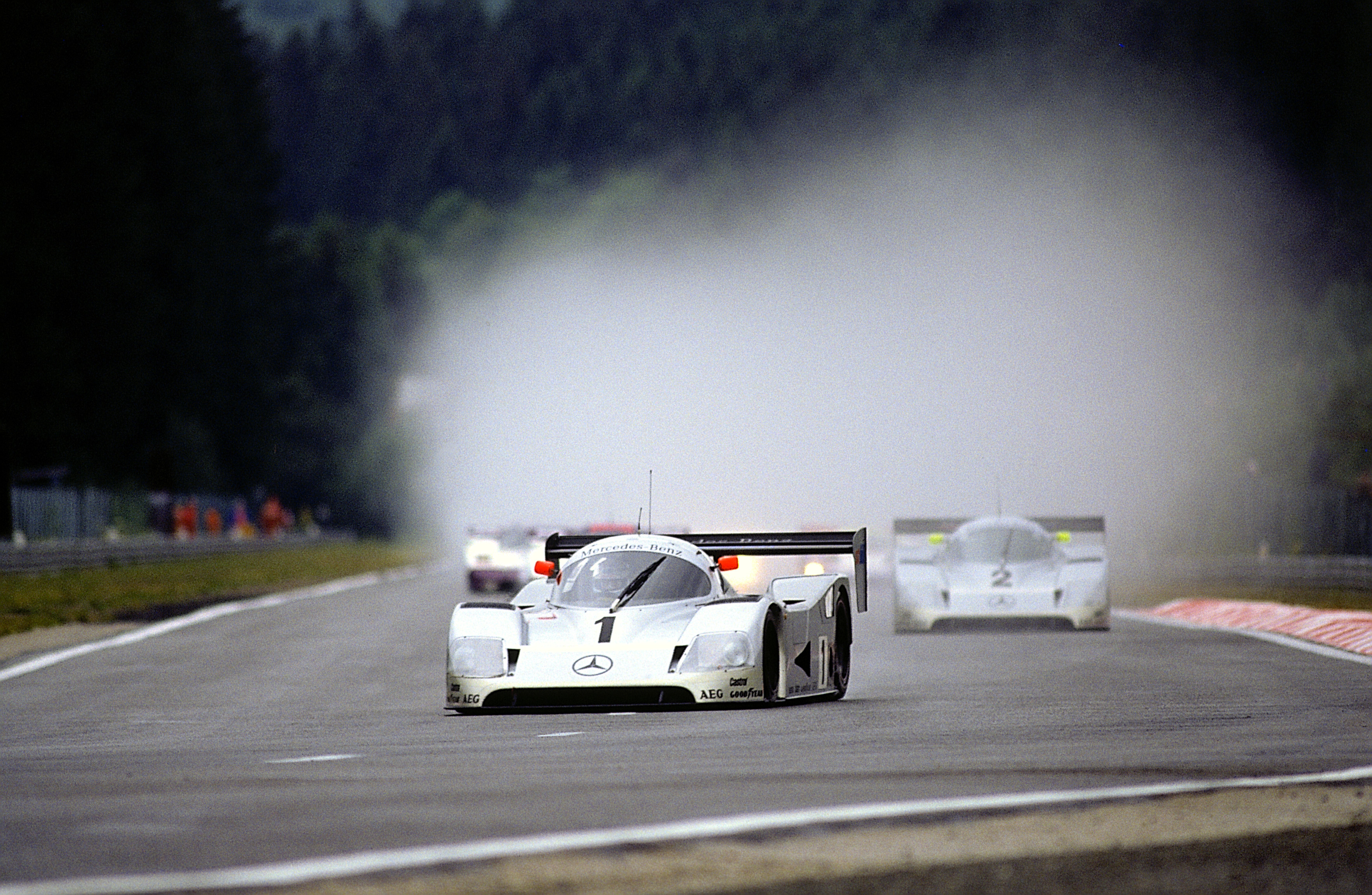 - 480-Kilometer-Rennen in Spa-Francorchamps, 3. Juni 1990. Mauro Baldi / Jean-Louis Schlesser auf dem Mercedes-Benz Gruppe-C-Rennsportwagen C 11 mit Startnummer 1 belegen den achten Platz, Jochen Mass / Karl Wendlinger mit Startnummer 2 holen den Sieg. 480 km race in Spa-Francorchamps, 3 June 1990. Mauro Baldi/Jean-Louis Schlesser in the Mercedes-Benz C 11 Group C sports car, starting number 1, take eighth place; Jochen Mass/Karl Wendlinger, starting number 2, take the winning position.