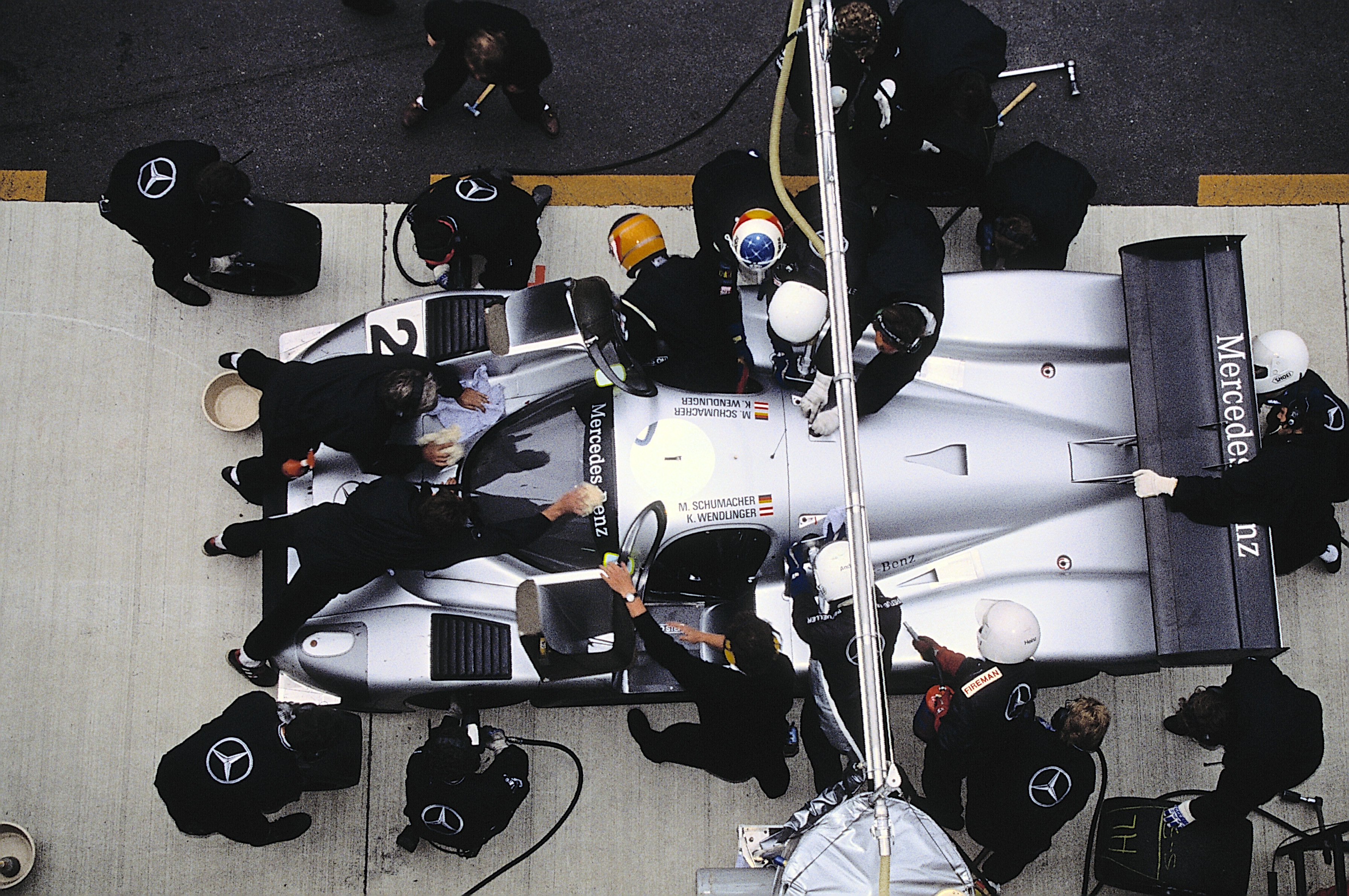 - 430-Kilometer-Rennen in Autopolis, Japan, 27. Oktober 1991. Boxenstopp und Fahrerwechsel des späteren Siegerteams Michael Schumacher / Karl Wendlinger (Startnummer 2) mit einem Mercedes-Benz C 291. 430 km race in Autopolis, Japan, 27 October 1991. Pit stop and driver change for the subsequent winning team of Michael Schumacher/Karl Wendlinger (starting number 2) in a Mercedes-Benz C 291.