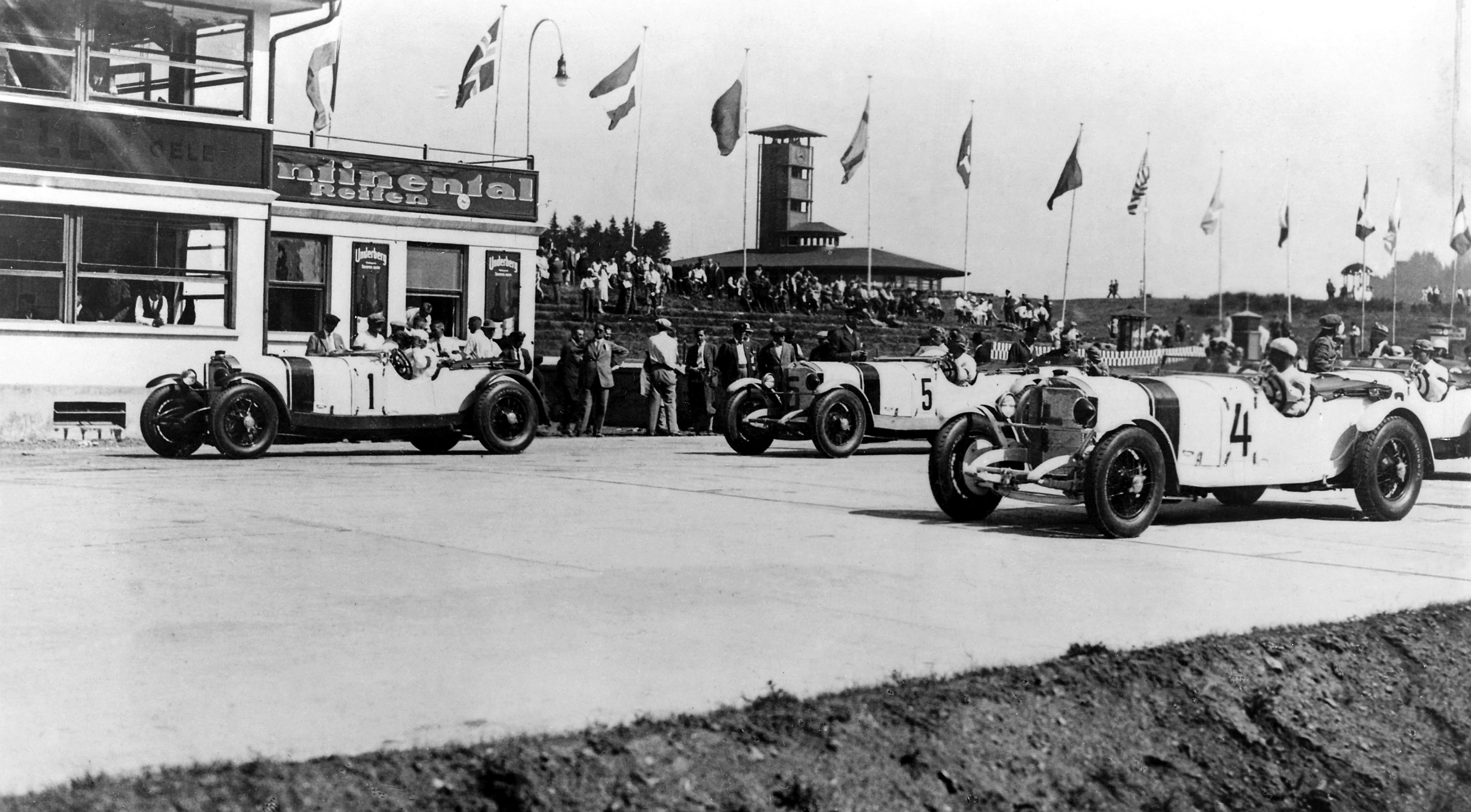 - Großer Preis von Deutschland für Sportwagen auf dem Nürburgring, 15. Juli 1928. Dreifachsieg für Mercedes-Benz. In der ersten und zweiten Reihe die Mercedes-Benz Mannschaft mit Typ SS Rennsport-Tourenwagen. In Startposition (von links nach rechts): Startnummer 1 – Georg Kimpel / Adolf Rosenberger. Startnummer 5 – Otto Merz und Beifahrer Eugen Salzer. Startnummer 4 – Christian Werner / Willy Walb. German Grand Prix for sports cars at Nürburgring, 15 July 1928. Triple win for Mercedes-Benz. The Mercedes-Benz team in the first and second rows with a type SS racing touring car. In starting position (from left to right): Starting number 1 – Georg Kimpel/Adolf Rosenberger. Starting number 5 – Otto Merz and co-driver Eugen Salzer. Starting number 4 – Christian Werner/Willy Walb.