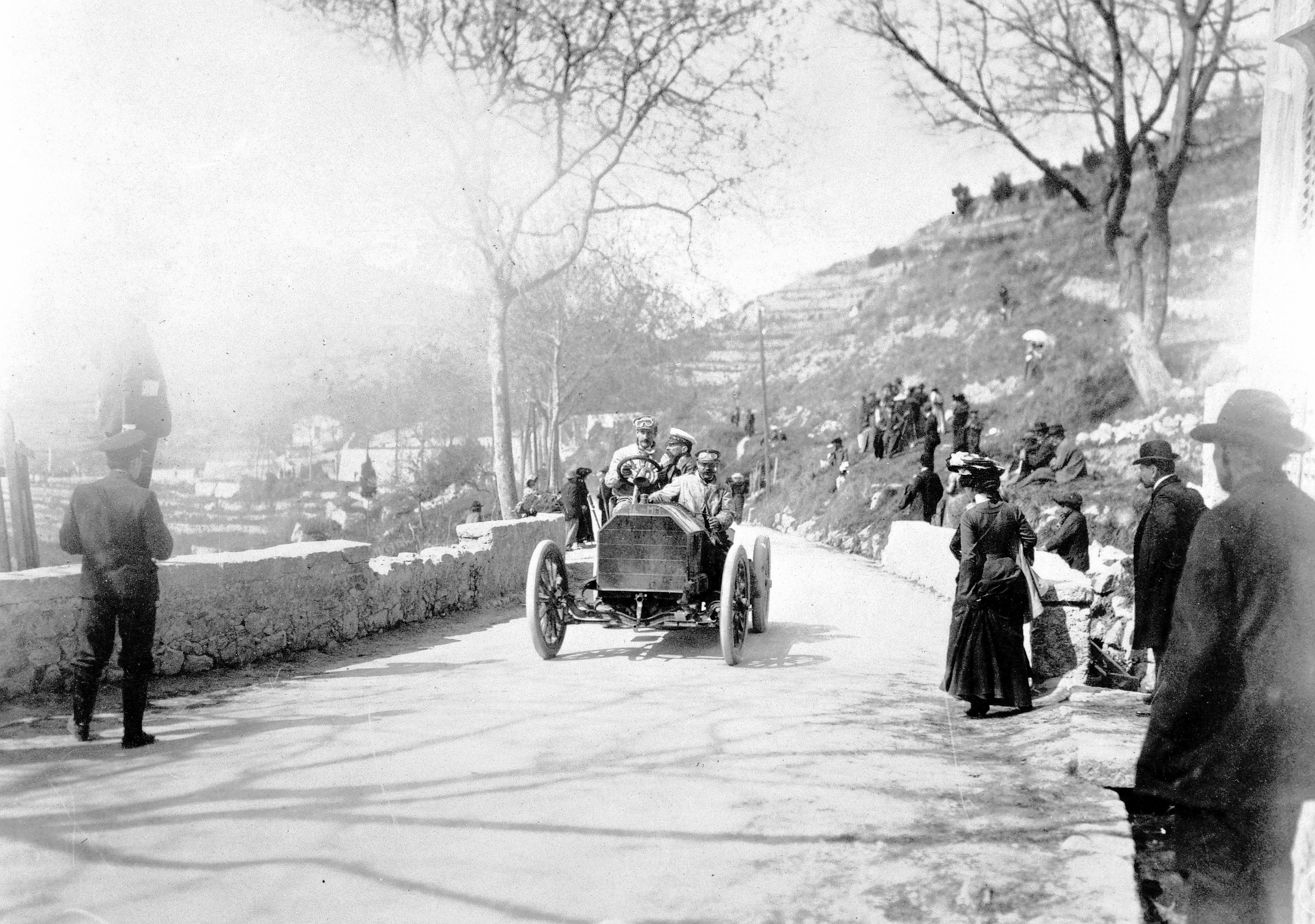 - Woche von Nizza, 25.-29.03.1901. Der 35-PS Mercedes-Simplex-Rennwagen des Baron Henry de Rothschild (alias „Dr. Pascal“) in La Turbie nach dem Sieg beim Bergrennen Nizza–La Turbie am 29. März 1901. Am Steuer Wilhelm Werner, der spätere Fahrer des deutschen Kaisers.