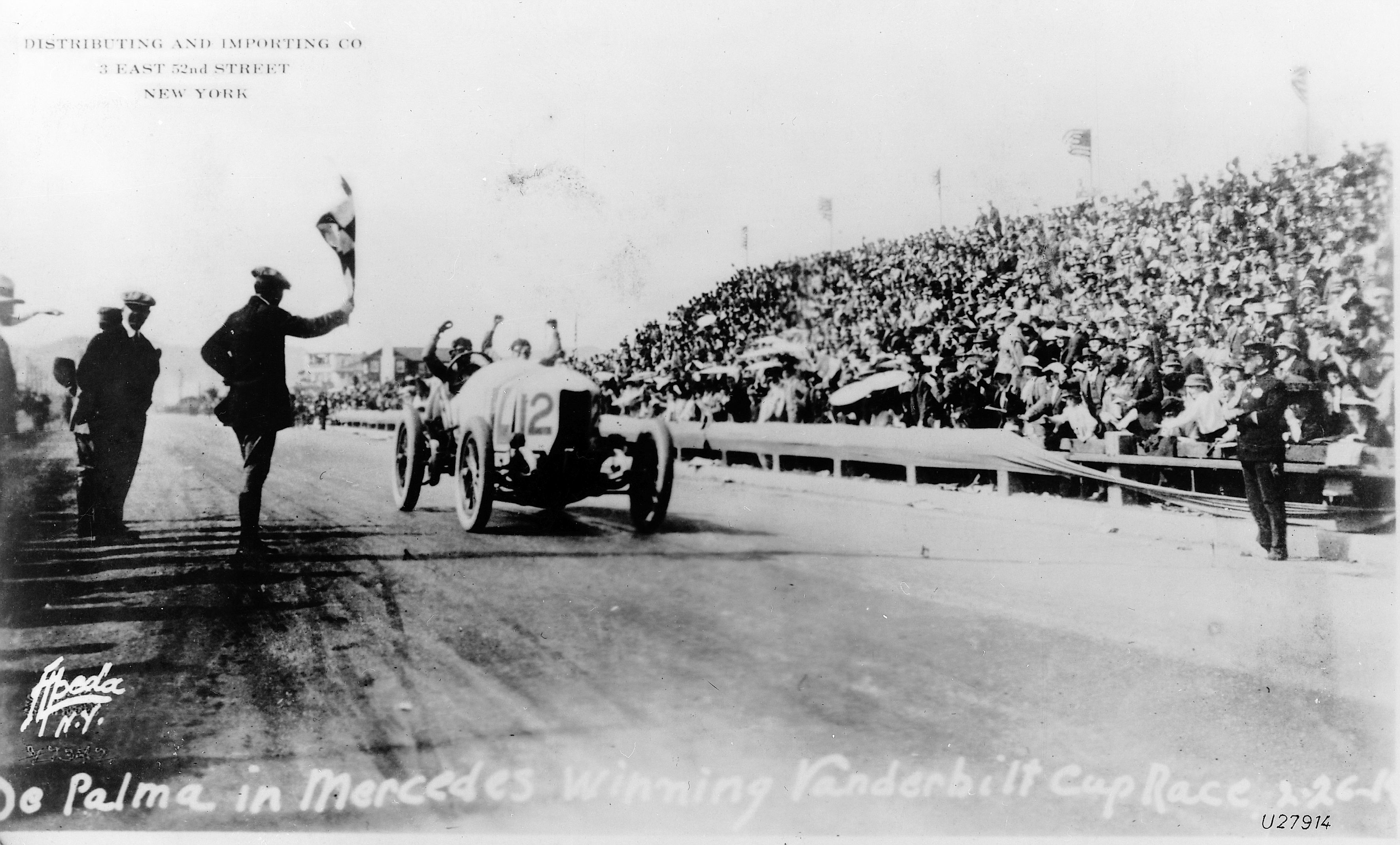 - Vanderbilt-Rennen auf der Strecke von Santa Monica bei Los Angeles/Kalifornien, 26. Februar 1914. Ralph DePalma bei der Zieleinfahrt. Er gewinnt das Rennen mit einem Mercedes 37/95 PS Rennwagen. Vanderbilt race on the Santa Monica track near Los Angeles, California, 26 February 1914. Ralph de Palma crosses the finishing line. He wins the race in a Mercedes 37/95 PS racing car.