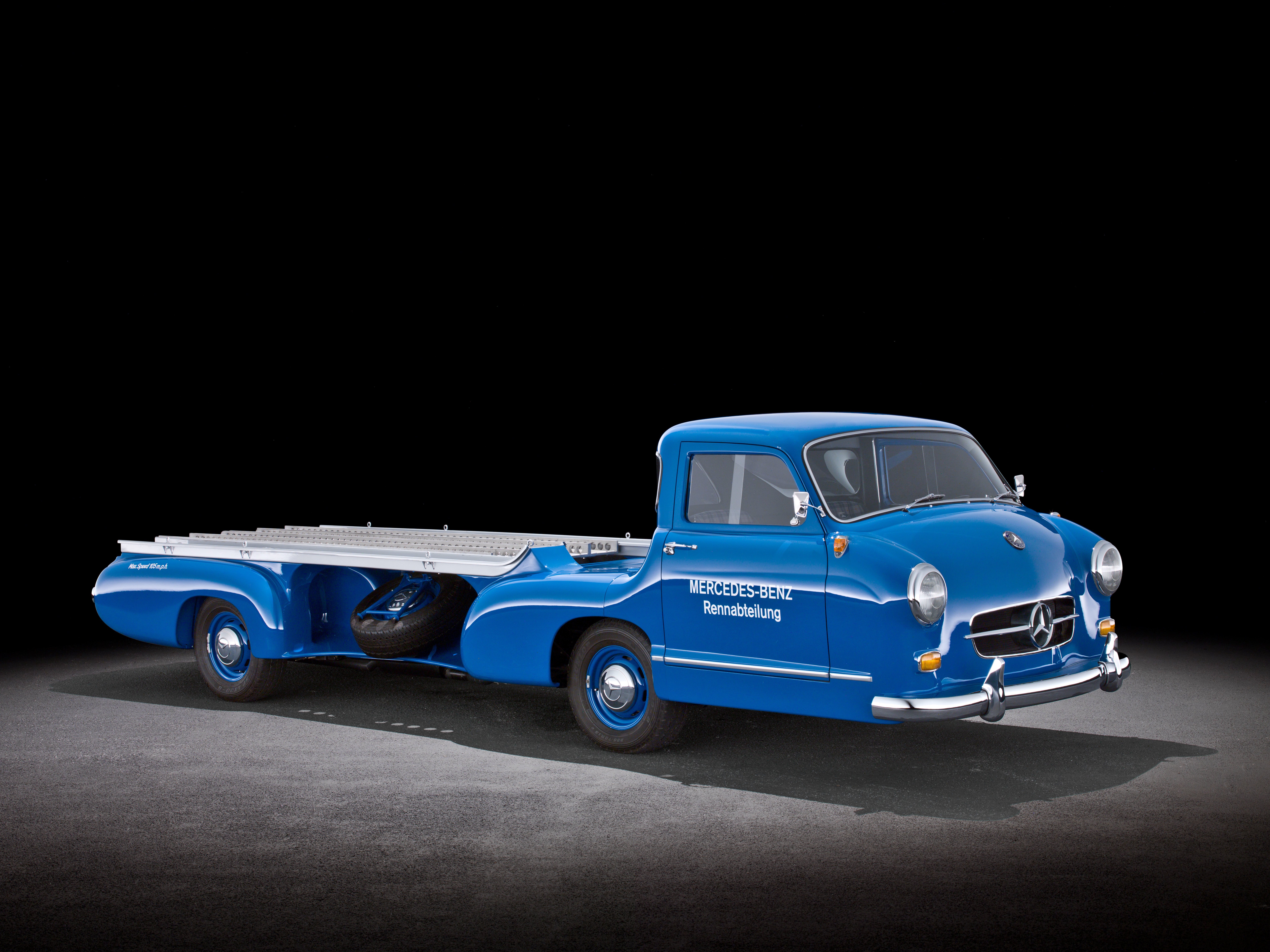 - Mercedes-Benz Rennwagen-Schnelltransporter „Das blaue Wunder“, 1955. Studioaufnahme, Exterieur, von links vorn. Mercedes-Benz high-speed racing car transporter, “Blue Wonder”, 1955. Studio shot, exterior, from front left.
