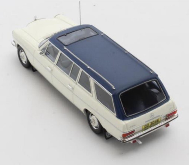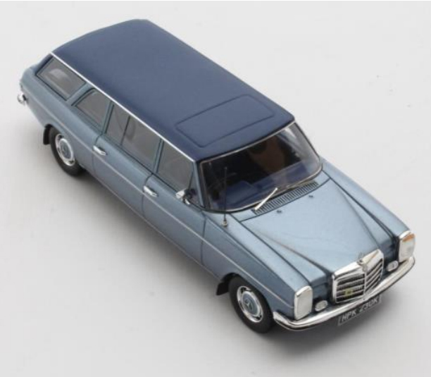 Matrix bringt den Mercedes-Benz W114 mit langem Radstand aus dem Jahr 1971 mit einer speziell angefertigten Kombi-Karosserie von Crayford in zwei verschiedenen Farbvarianten auf den Markt: in Blau Metallic und in Weiß.