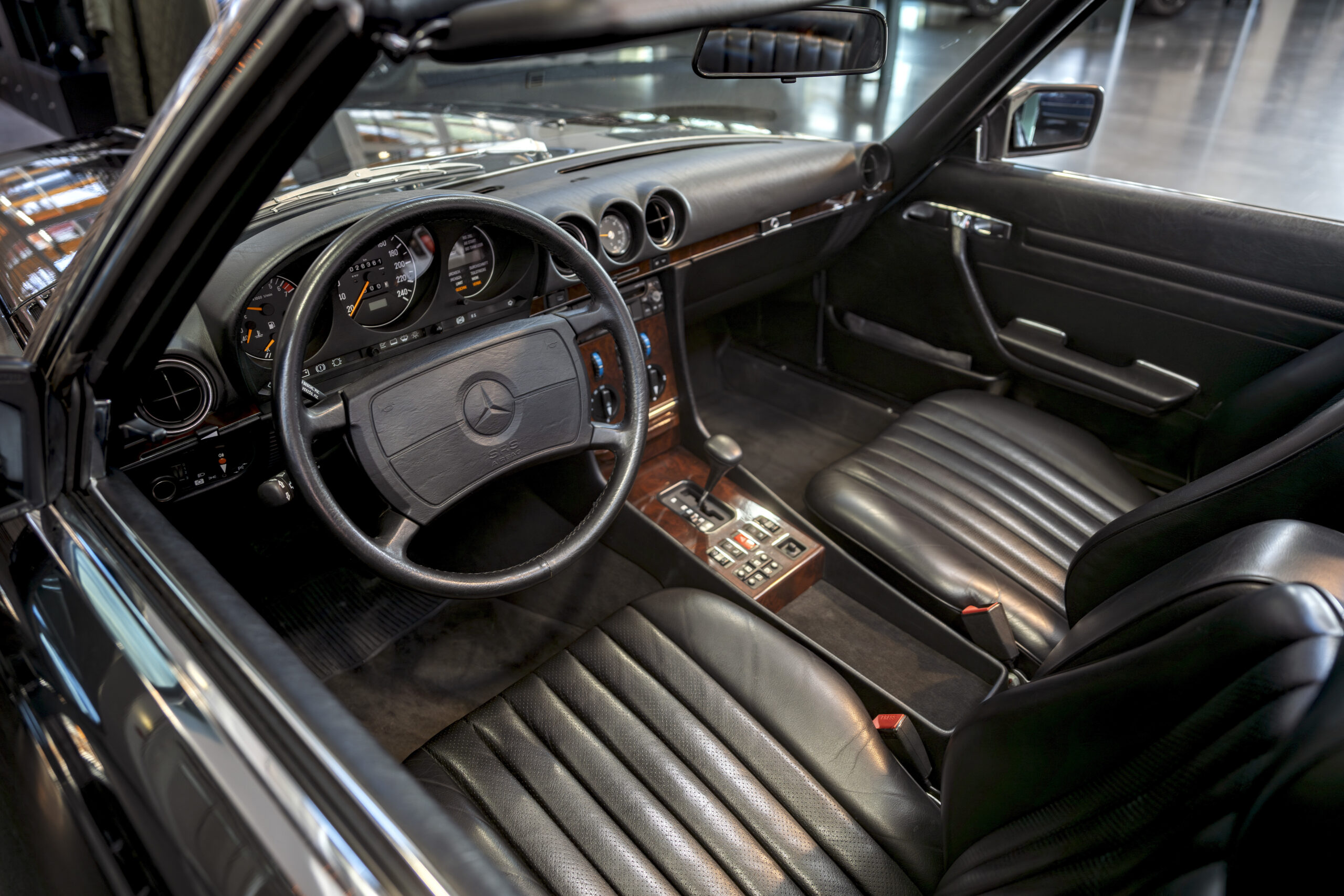 Als Handelsfahrzeug im Angebot ist außerdem ein weiterer und deutlich jüngerer Mercedes-Benz 300 SL, ein Namensvetter des berühmten „Flügeltürers“. Dieser gehört zu der von 1971 bis 1989 produzierten Baureihe R 107. Der 1988 gefertigte Roadster stammt aus Erstbesitz, hat einen vorzüglichen Erhaltungszustand und eine niedrige Gesamtlaufleistung von nur 26.500 Kilometern. Er überzeugt zudem mit einer klassischen Farbkombination: Lackierung in graublau (DB199) und Lederinterieur in schwarz. Zwei seltene Ausstattungsmerkmale sind Reiserechner und Rücksitzbank.