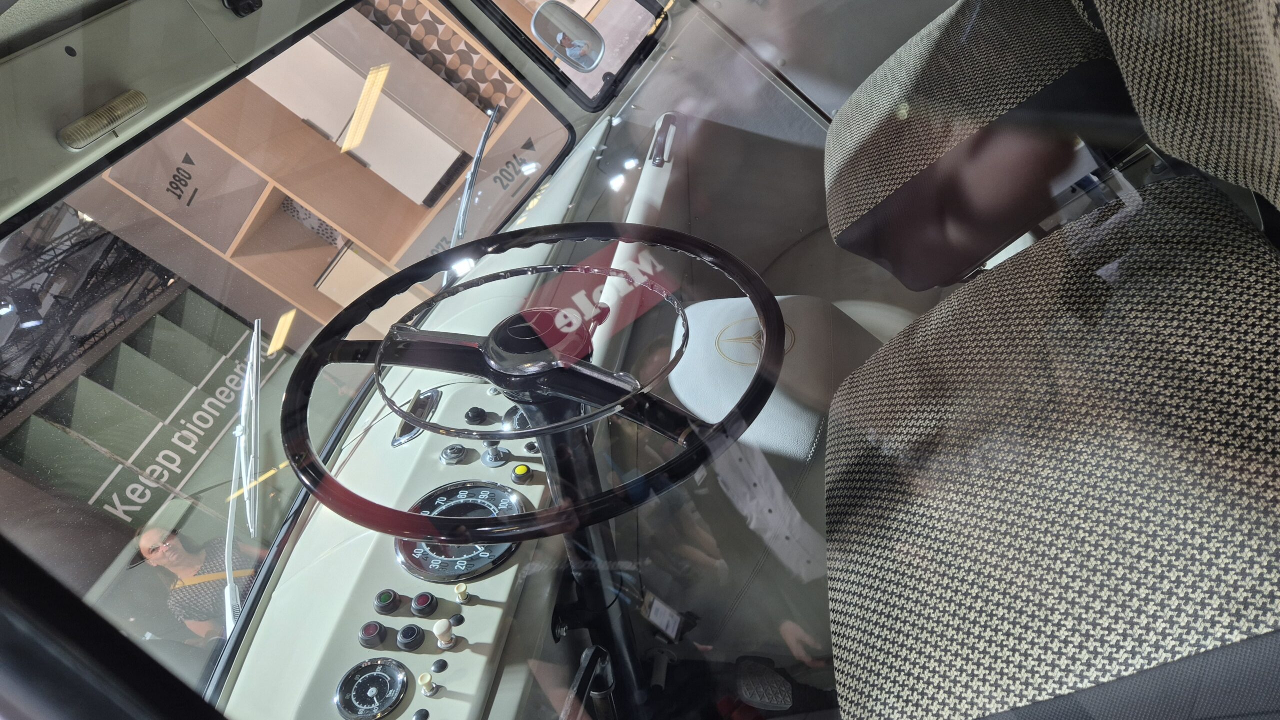 Beim Basisfahrzeug handelt es sich um einen Mercedes L 319 Transporter von 1963, der viele Jahre auf einem finnischen Militärflugplatz als Service-Fahrzeug für die Saab-Draken-Kampfflugzeuge seinen Dienst versehen hat. Problematischer erschien da zunächst der Zeitfaktor. Schließlich musste der Transporter komplett zerlegt werden. Dann wurden die Schaufenster auf den beiden Fahrzeugseiten eingebaut. Als Vorlage diente im Übrigen nur ein Foto. Erst später, nachdem jemand bei Liebherr das Firmenarchiv durchforstet hatte, wurden weitere Bilder gefunden. Und dabei gab es eine Überraschung: Der L 319 von Liebherr hatte nicht nur Fenster an den Längsseiten, es waren auch Fenster in den Hecktüren eingebaut worden.