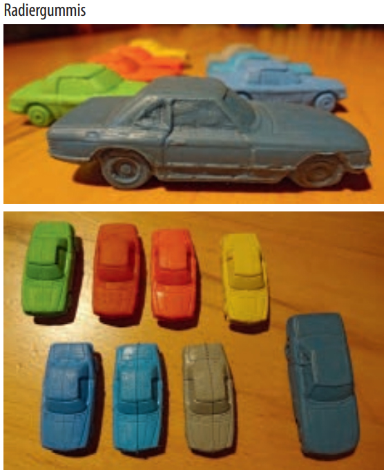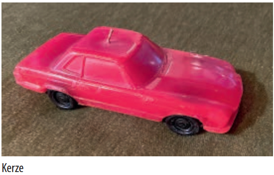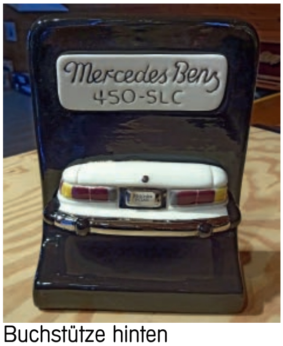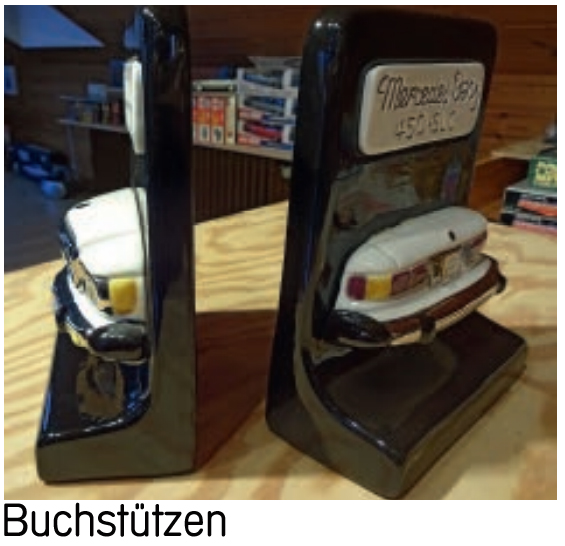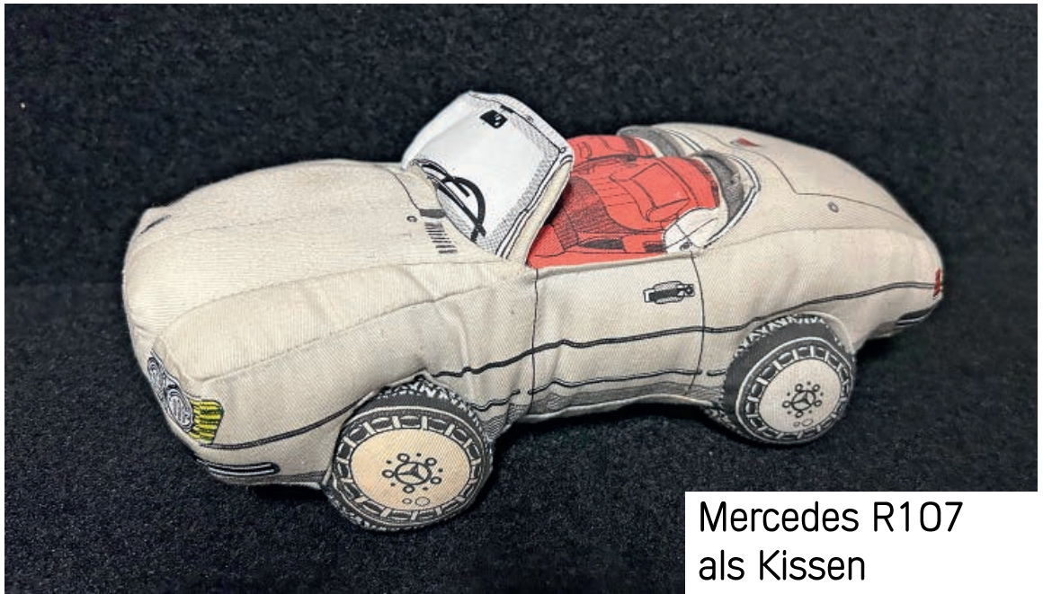 Ich habe mir die Zeit und Mühe genommen, für euch ein Paar von diesen Artikeln aufzulisten und zu fotografieren. Absichtlich habe ich hier keine Artikel aufgenommen, bei denen der R 107 nur auf einem Artikel aufgedruckt oder gezeigt ist. Ich habe versucht, nur Artikel aufzunehmen, bei denen die Form des Wagens tatsächlich eine Funktion hat – seht selbst auf den Fotos, ob das mir gelungen ist.